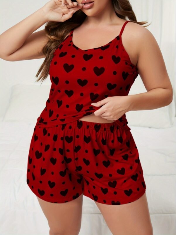 Women’S Cute Heart And Polka Dot Pajama Set – Red Camisole Top & Elastic Waist Shorts, Soft Polyester Blend, Machine Washable Sleepwear, Comfortable Loungewear|Heart Pattern Design|Smooth Fabric Finish