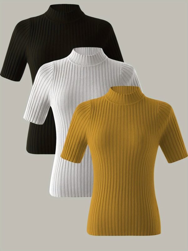 Women’S Elegant Rib-Knit T-Shirt, Polyester 100% Skinny Fit Half Sleeve Tops, Solid Crew Neck Knit Pullovers, All-Season Stretchy T-Shirt With Pleated Hem, 350G/M? Fabric Weight