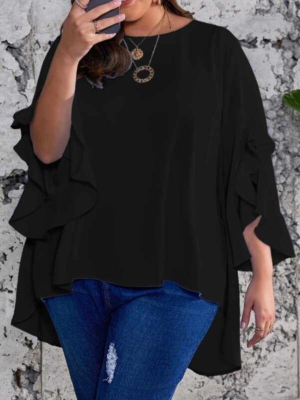 Plus Size Ruffle Sleeve Blouse, Casual Crew Neck Asymmetrical Hem Blouse For Spring, Women’S Plus Size?Clothing