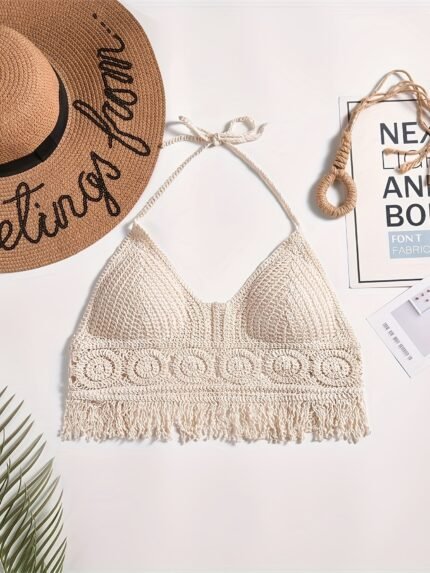 Bohemian Women’S Halter Embroidered Beach Top, Hollow Sexy Fringe Tie-Up Top, Summer Beachwear