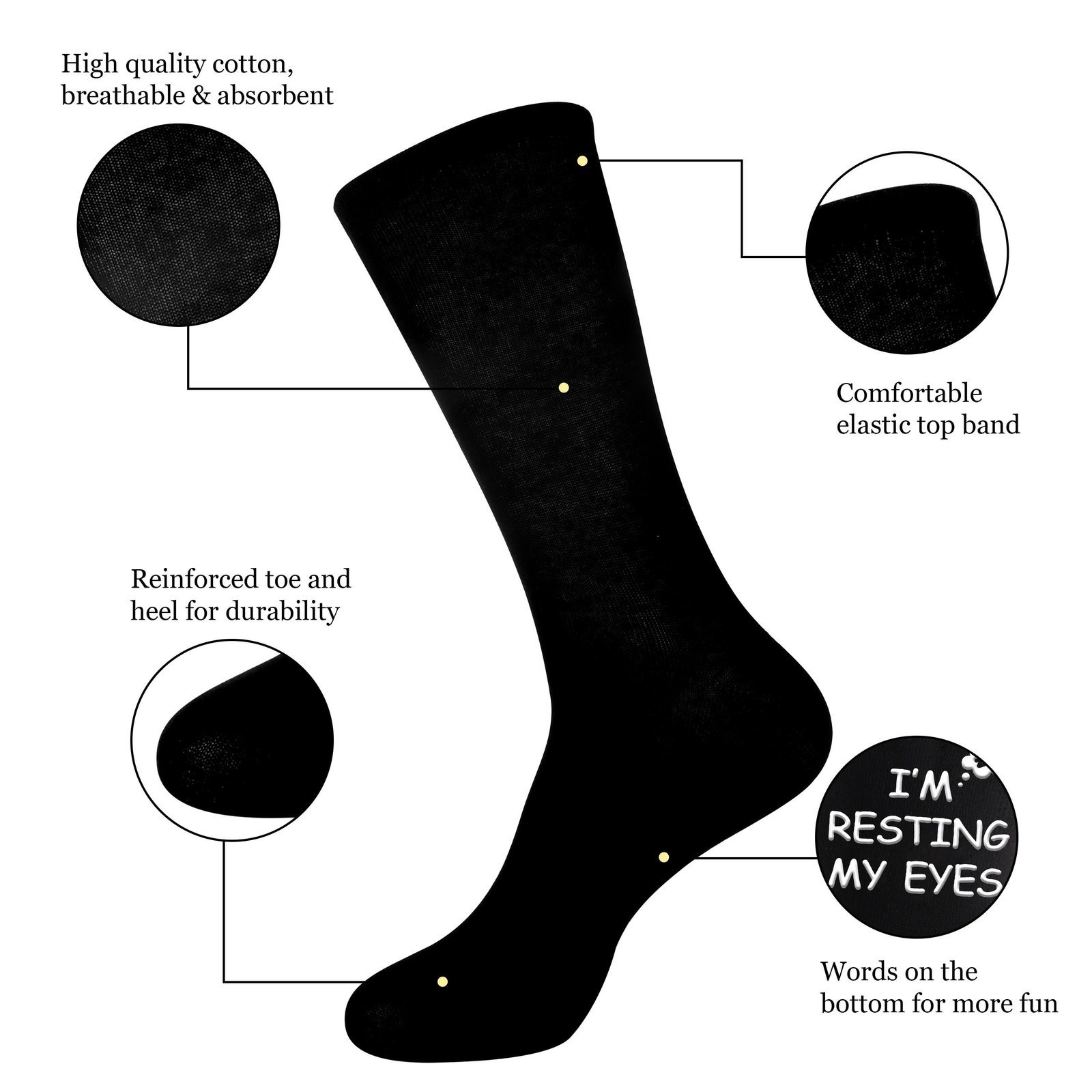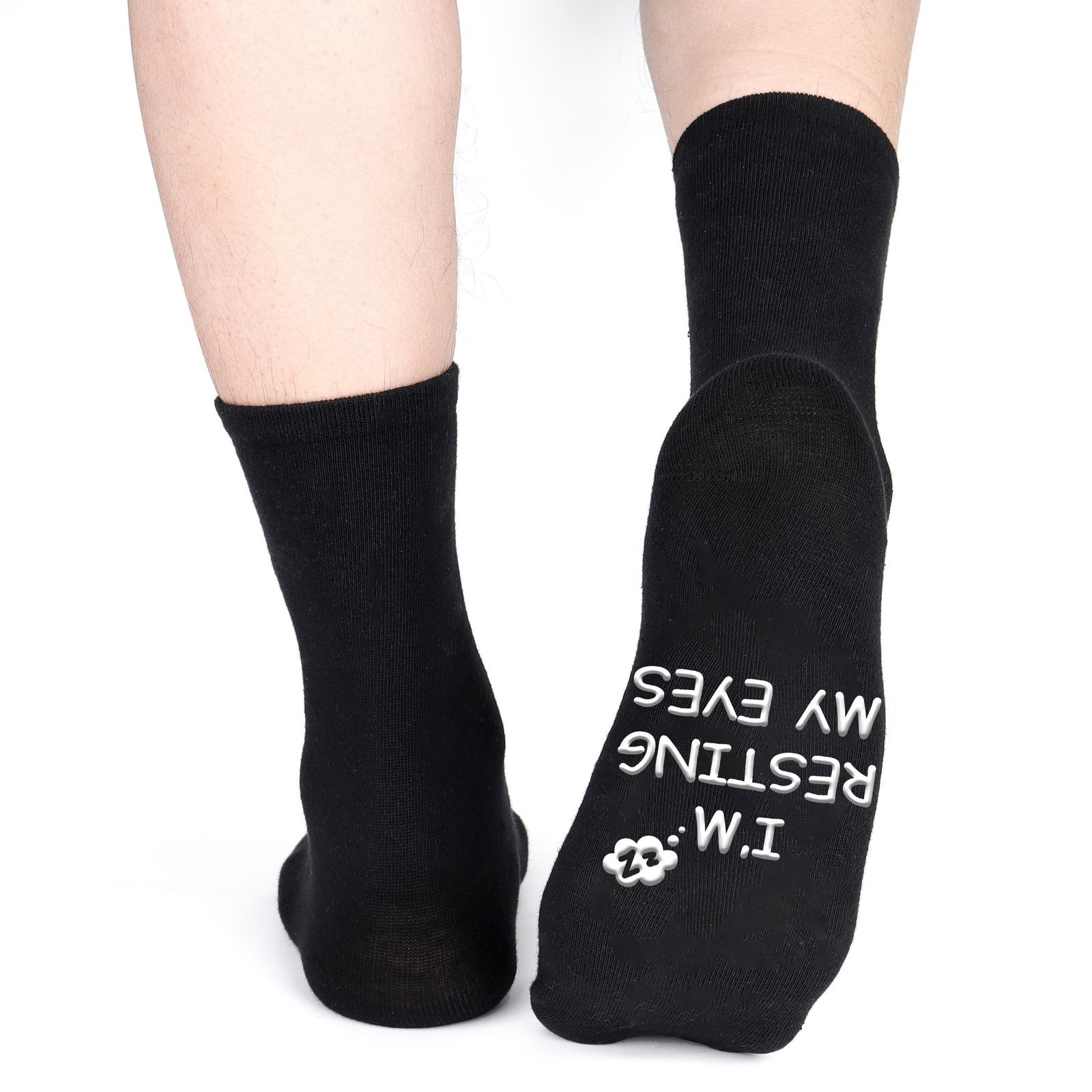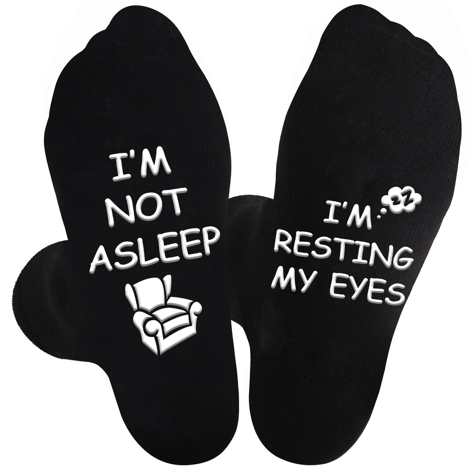 ??Non-slip Crew Socks For Men?: “I?M NOT ASLEEP, I’M RESTING MY EYES” Funny Words Printed On The Bottom Of The Socks, And The Text Is Non-slip.Suitable For Indoor And Outdoor Activities. Black Design, Versatile.
