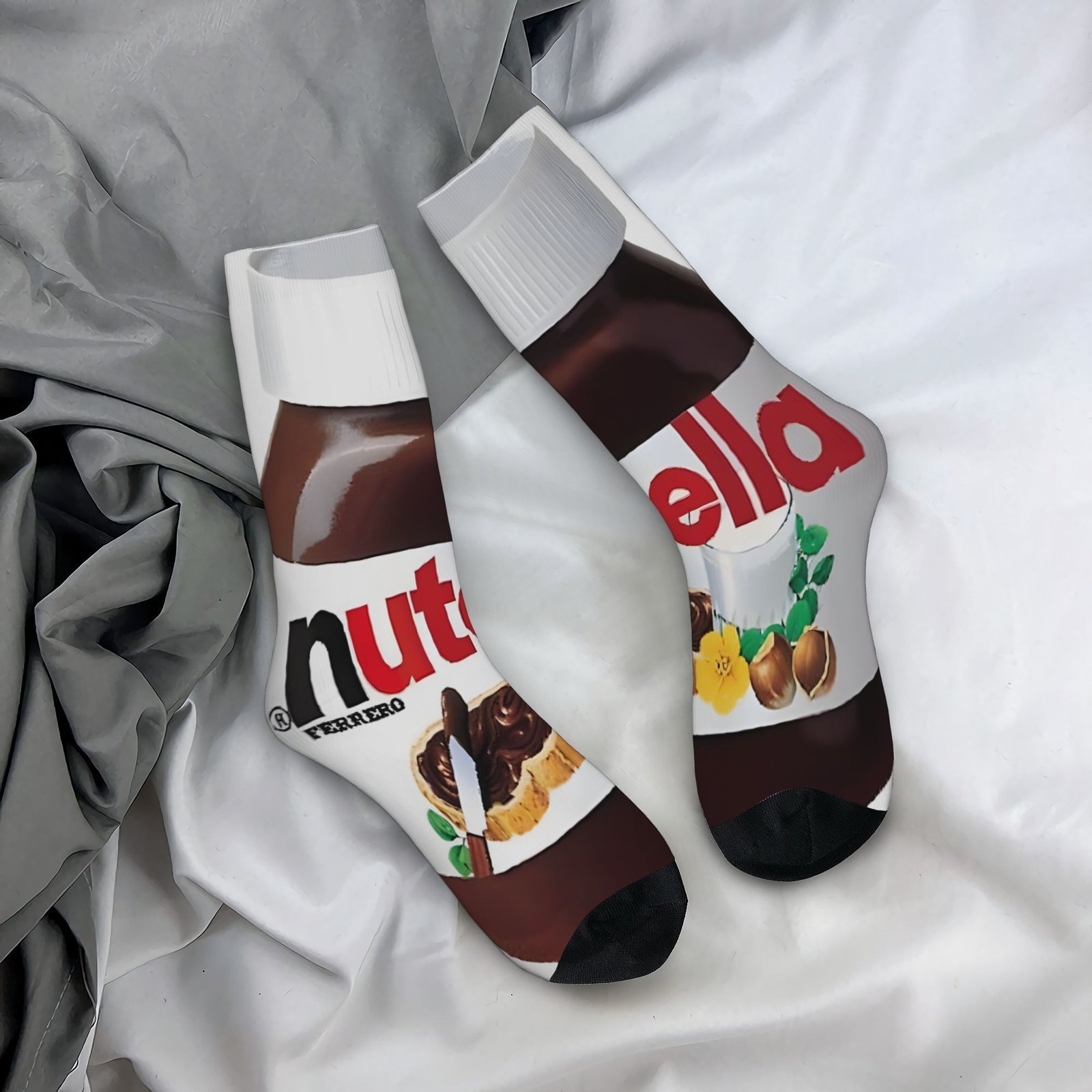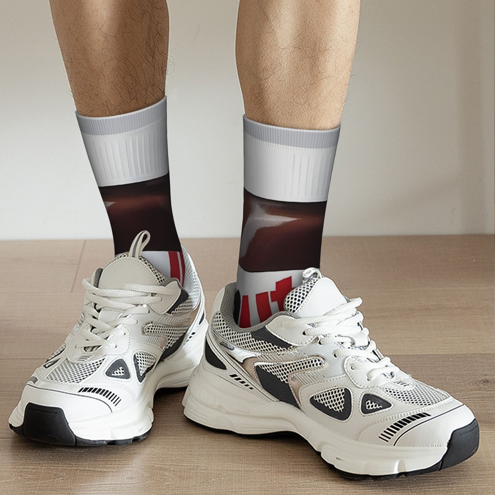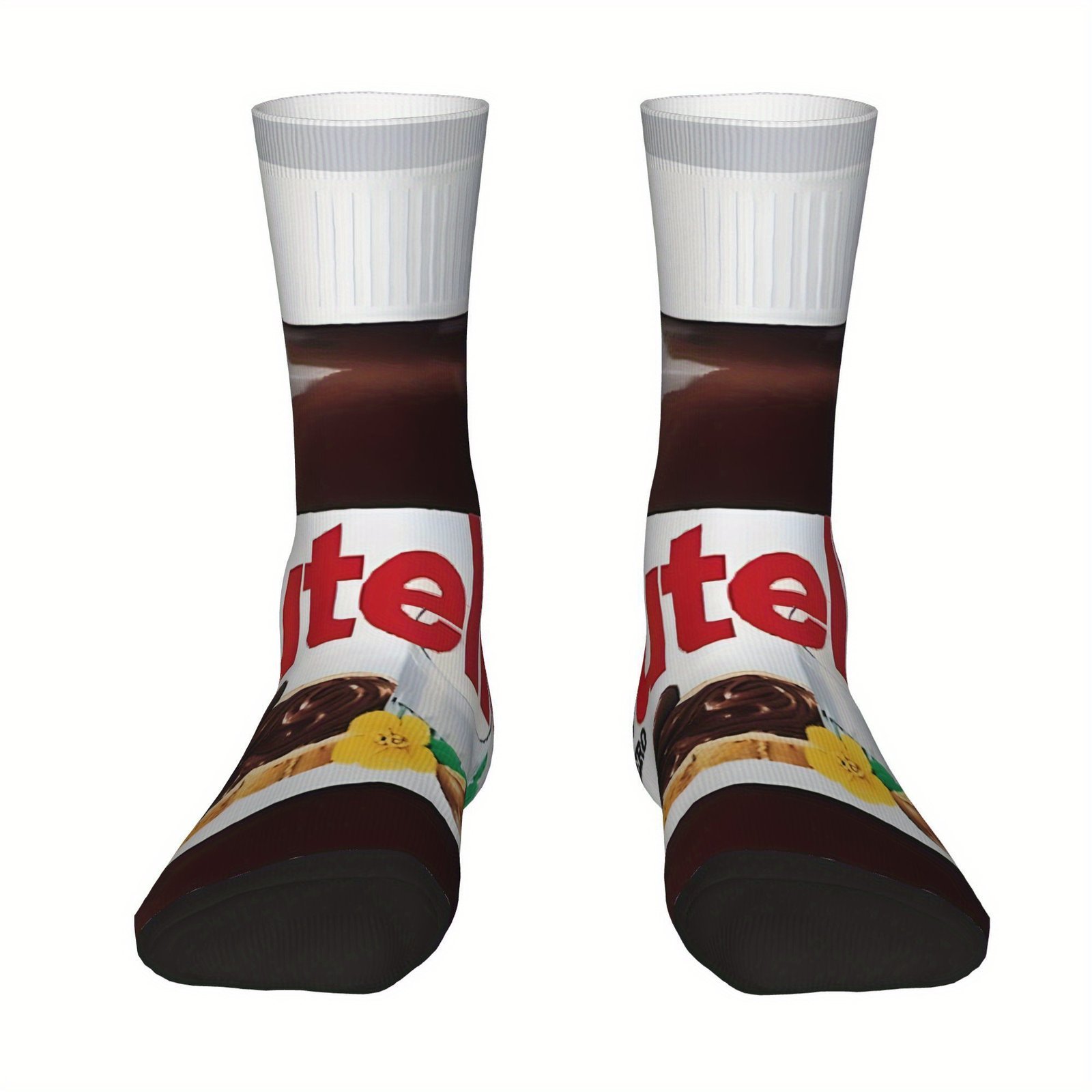 1 Pair Men’S Funny Novelty Crew Socks – Chocolate Hazelnut Spread Design, Hip Hop Harajuku Style, Polyester Knit Fabric (95% Polyester, 5% Elastane), Hand Washable – Ideal For Christmas Gifts And Casual Wear