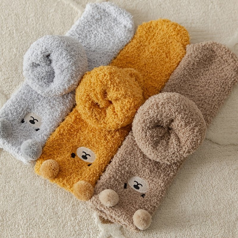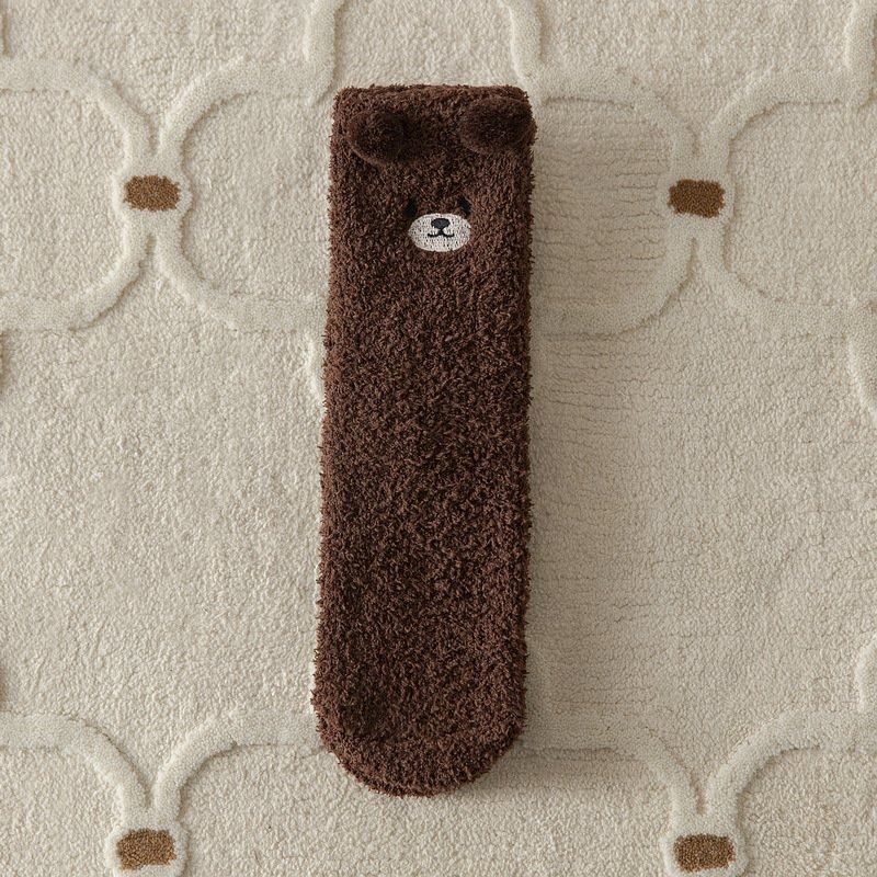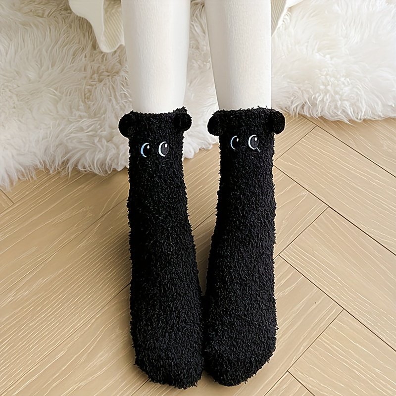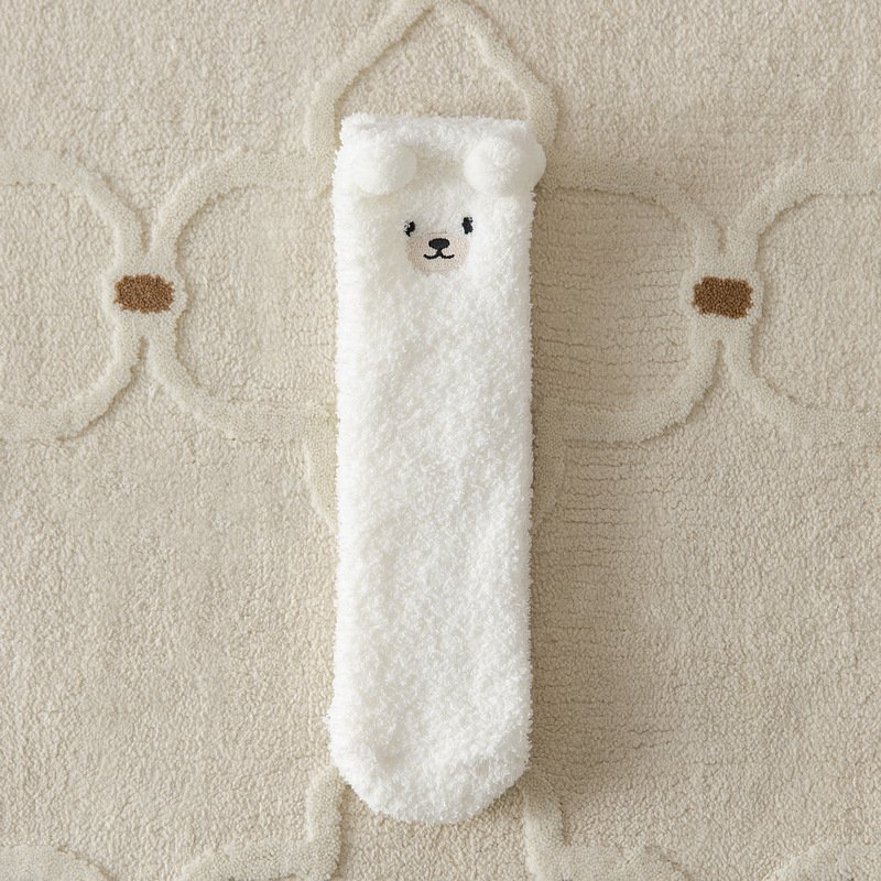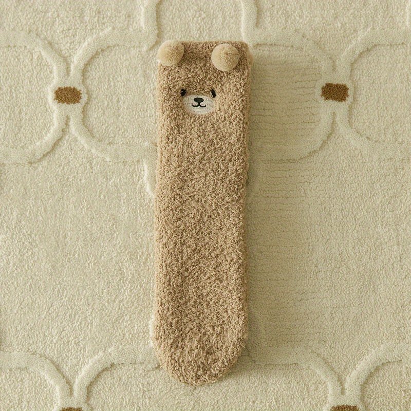 1 Pair Women’S Cute Bear Fuzzy Coral Fleece Warm Socks, Solid Color Knit Fabric, Polyester 97% Spandex 3%, Machine Washable – Autumn/Winter Collection