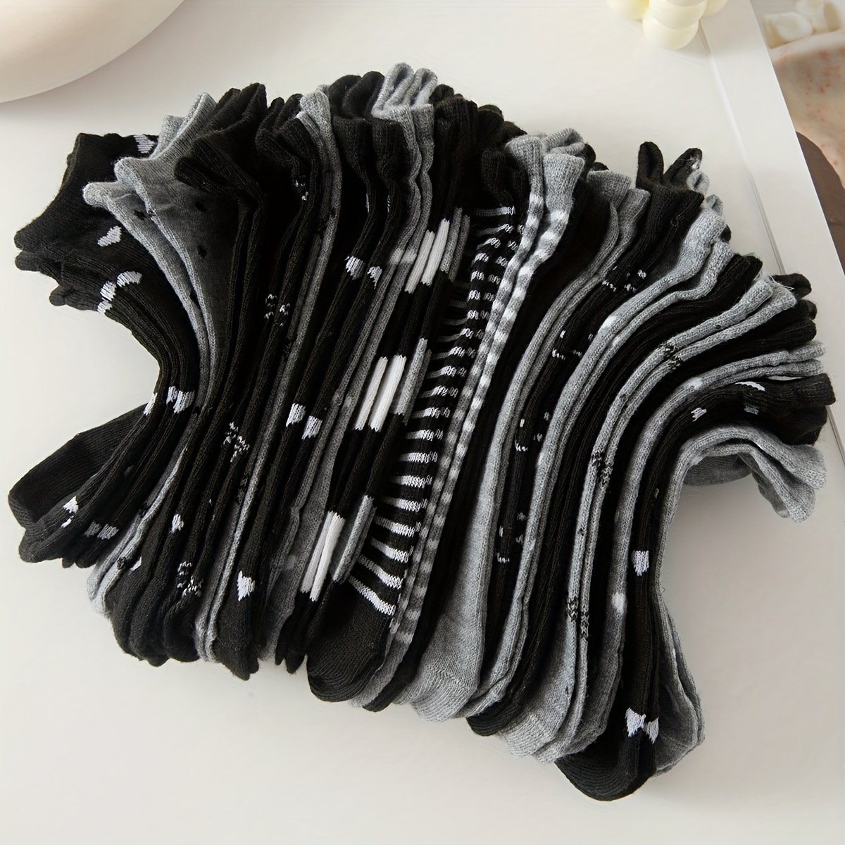 10/20 Pairs Women’S Ankle Socks, Black And Grey, Assorted Geometric Patterns, Comfortable Knit Fabric, Polyester 95%, Spandex 5%, 300G/M?, Random Style Shipping