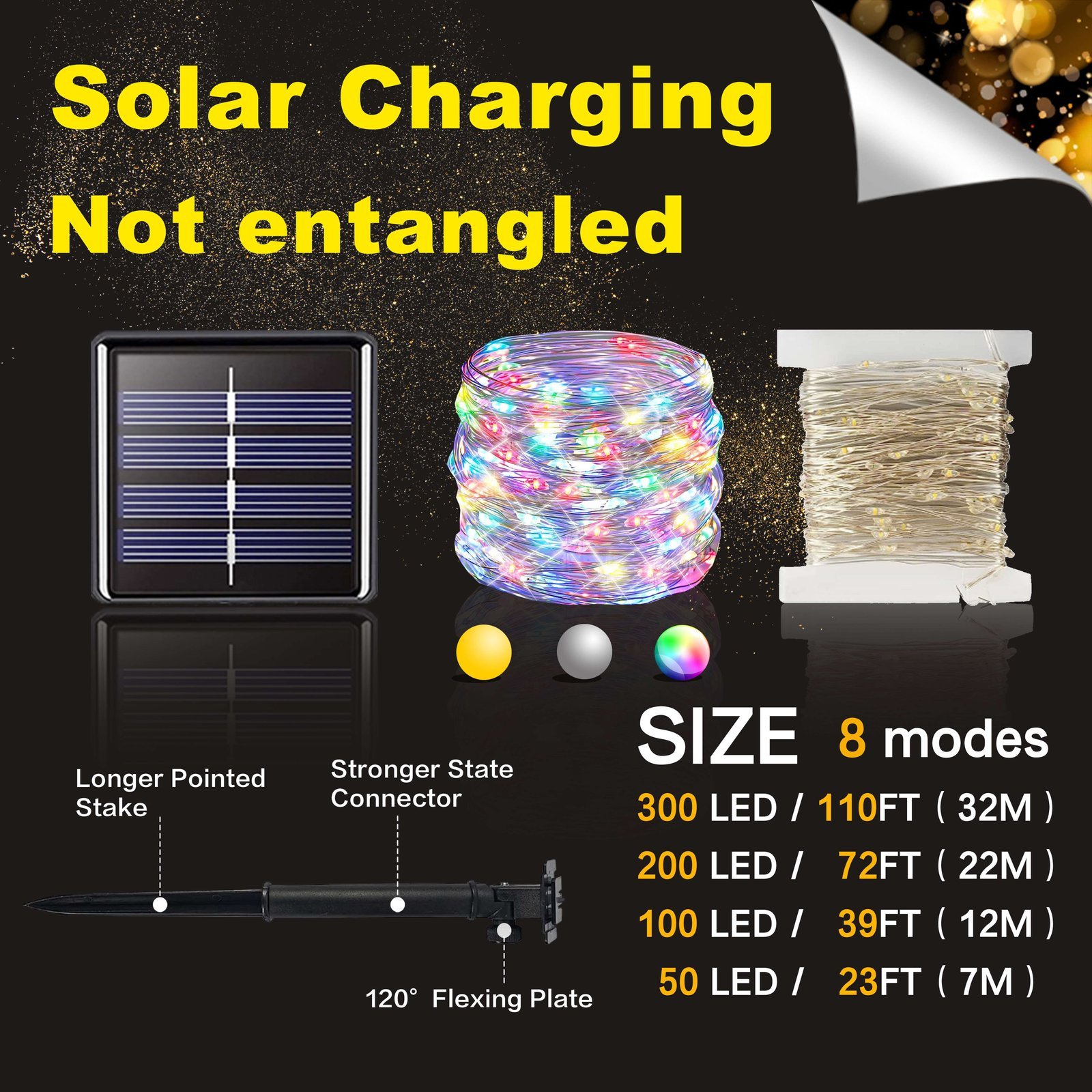 1Pc 7.01/11.89/21.95/31.7Meter 50/100/200/300Led Solar String Lights Outdoor, Ipx4 Copper Wire 8 Modes Solar Fairy Lights Garden Patio Tree Christmas Party Wedding Warm White Colorful White Plastic Card Board Pure Copper Wire
