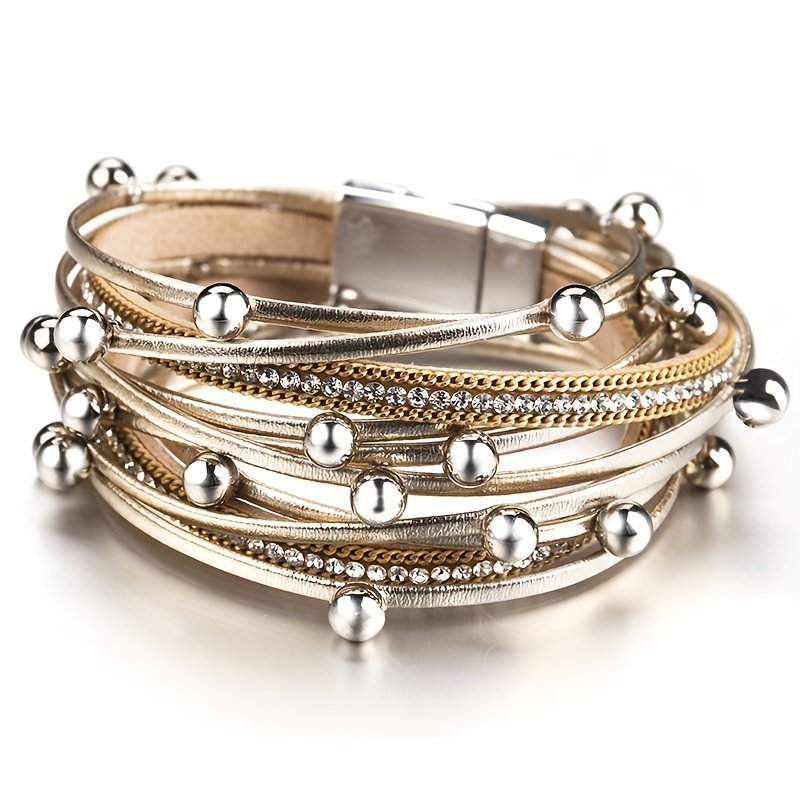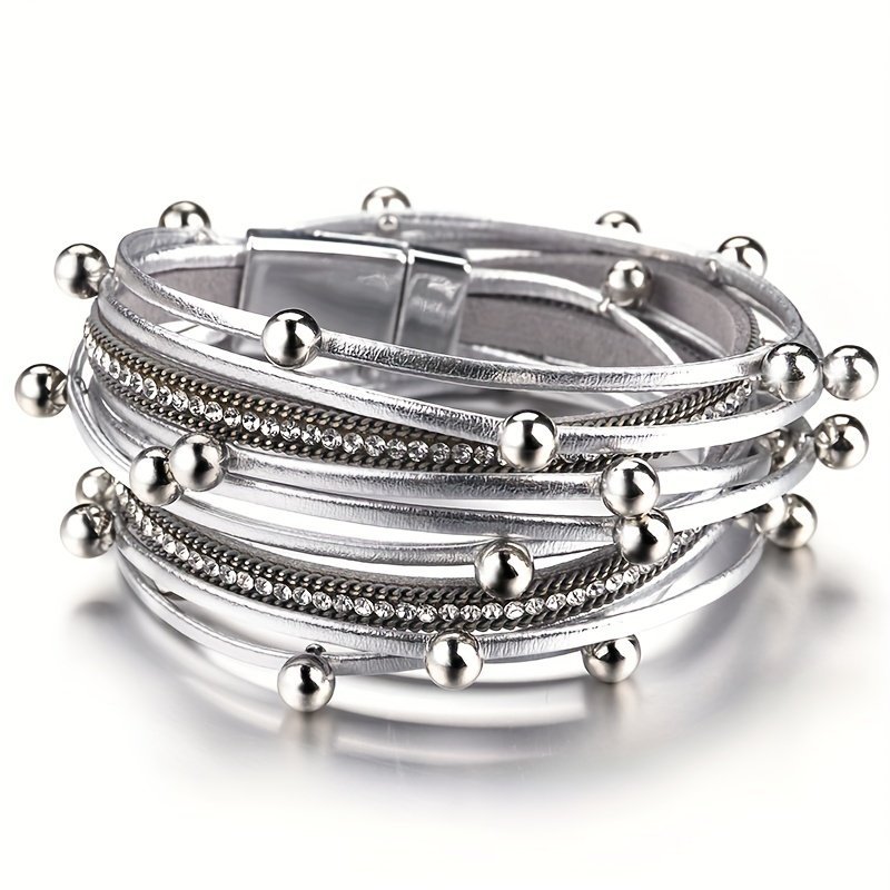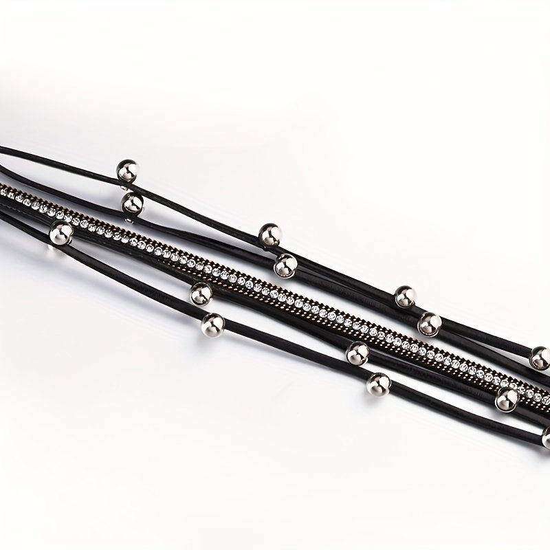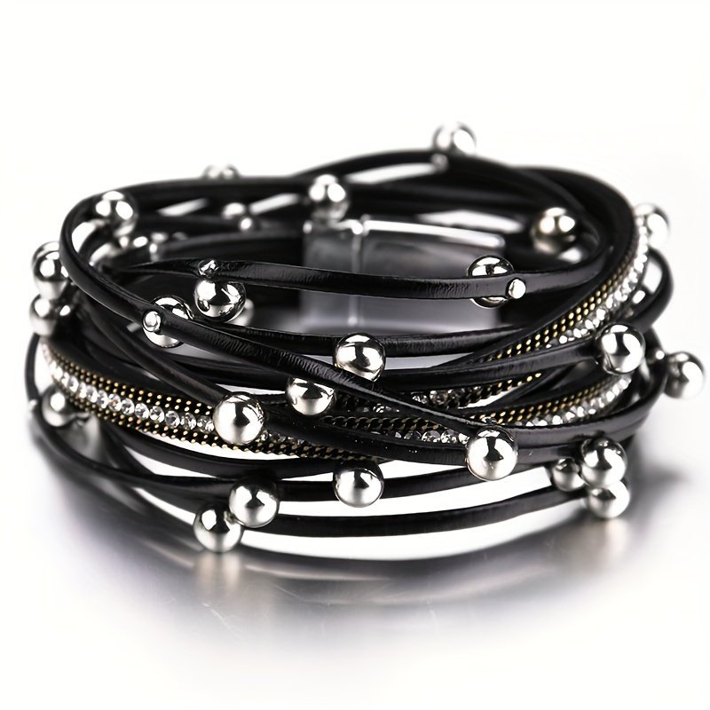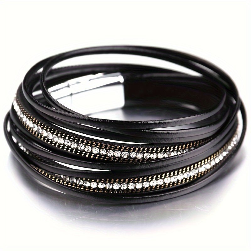1Pc Multi-Layered Faux Leather Bracelet – Black Layered Chain Design With Rhinestones Accents, Double Wrap Long Bracelet For Women & Men, Everyday & Party Jewelry Gift For Anniversary, Birthday, Valentine’S – Unisex Cuff For Couples, Couple Bracelets, Versatile Fashion Accessory, Bohemian Style, Metallic Accents, Anniversary Present, Durable Accessory, Trendy Accessory