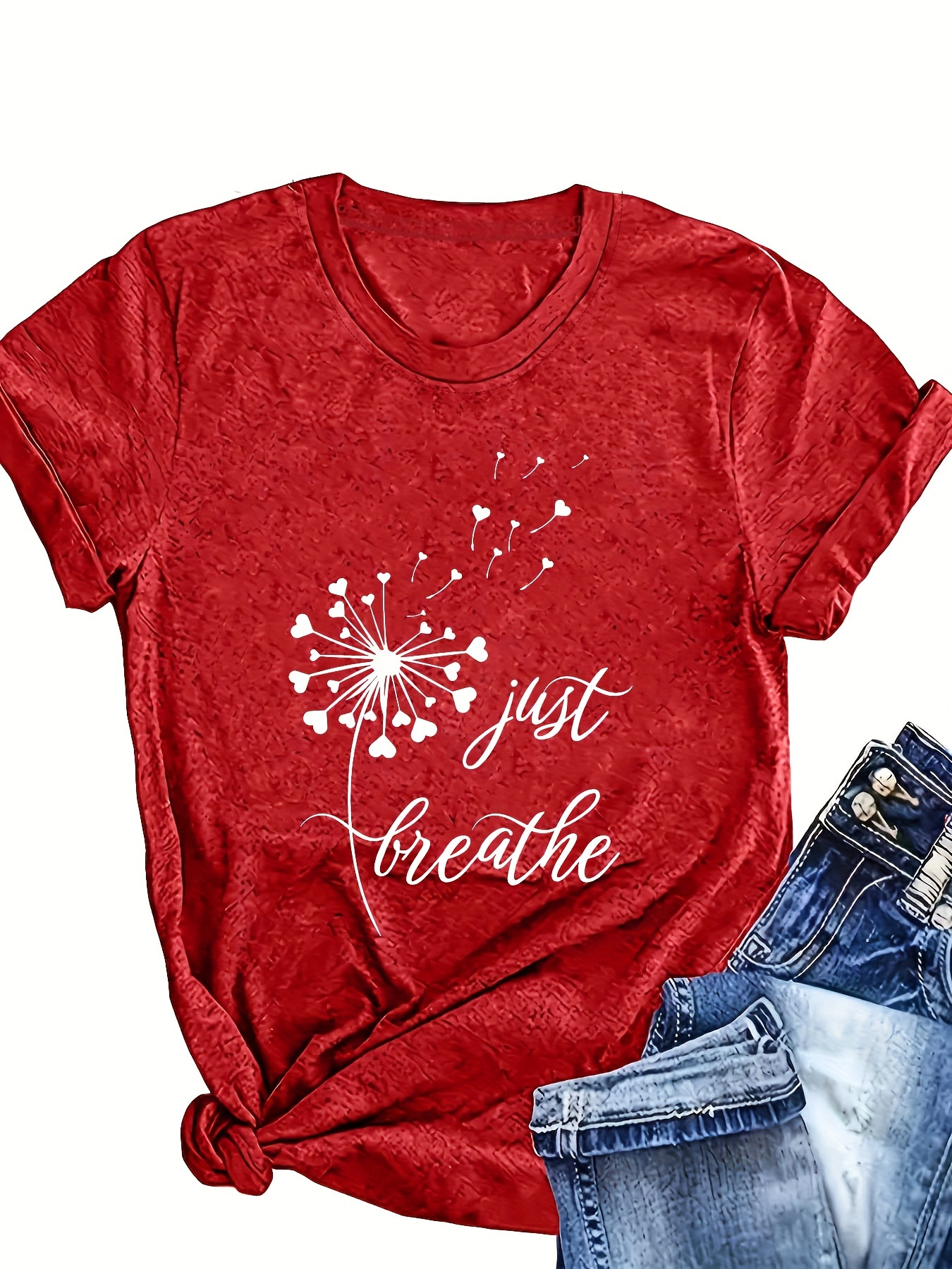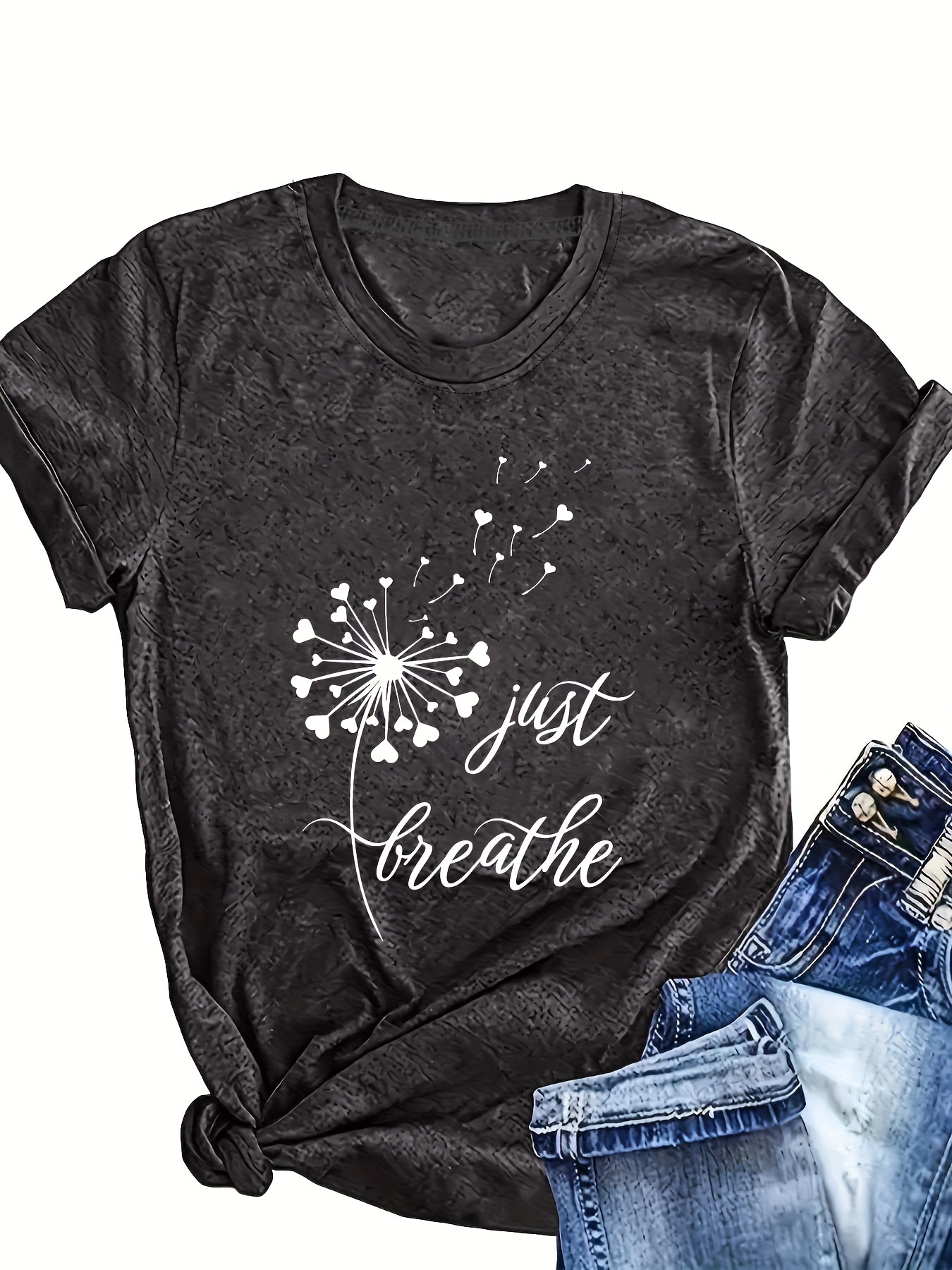 1Pc Women’S Summer Casual Crew Neck T-Shirt, Polyester Knit Fabric, Geometric Dandelion Pattern, “Just Breathe” Slogan, Regular Length Short Sleeve Top
