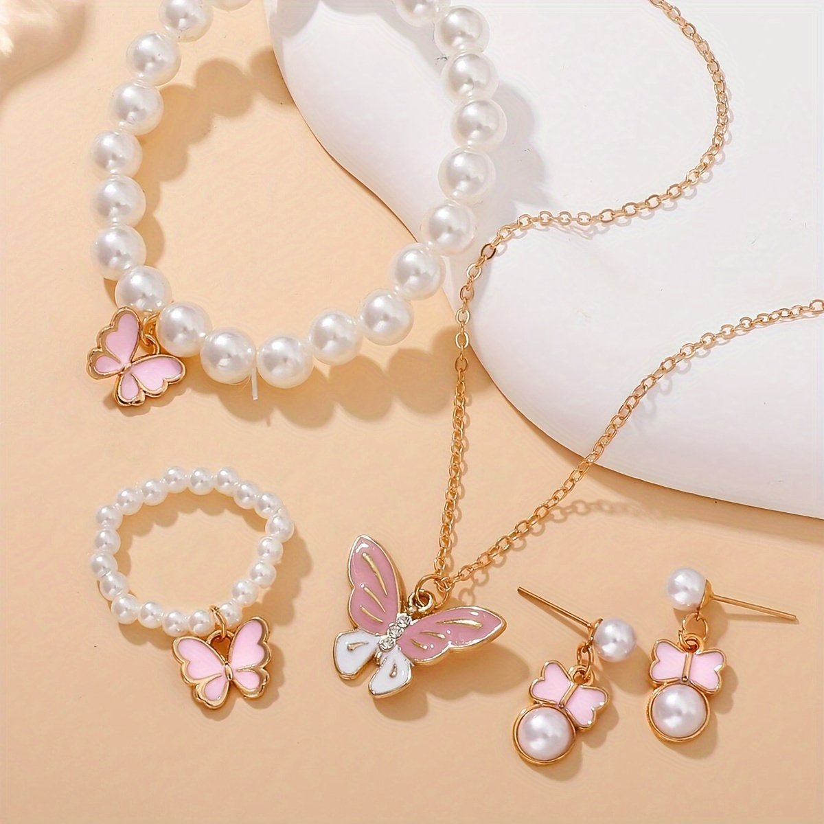 1Set Cute Pearl Butterfly Trendy Necklace Earrings Pearl Bracelet Ring Set For Girls