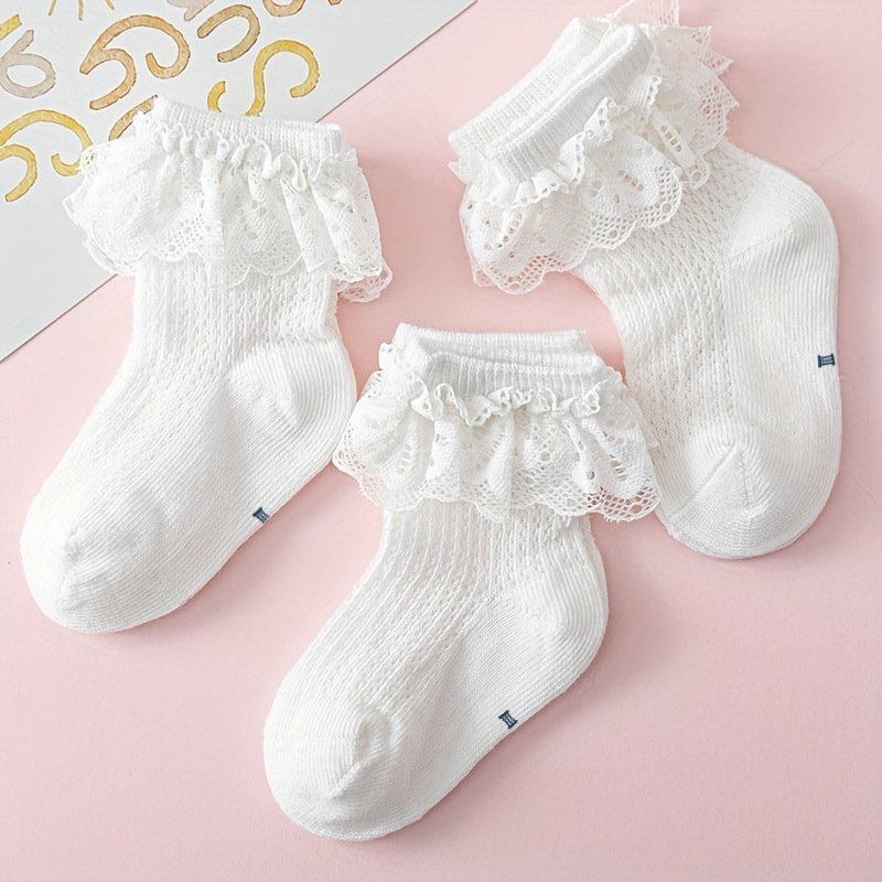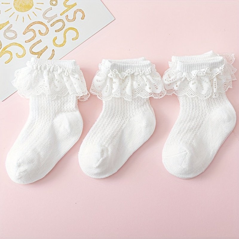 3Pairs Baby Girls Lace Trim Socks, Breathable Comfortable Princess Socks For Infant Newborn Toddlers