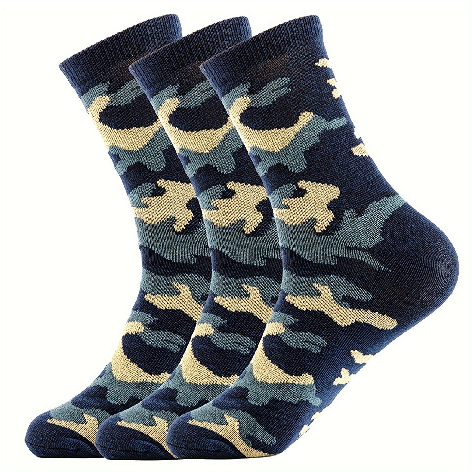 3Pcs Men’S Camo Sports Crew Socks – Durable Polyester Blend With Spandex, Geometric Pattern, Ribbed Cuff – Ideal For All Seasons