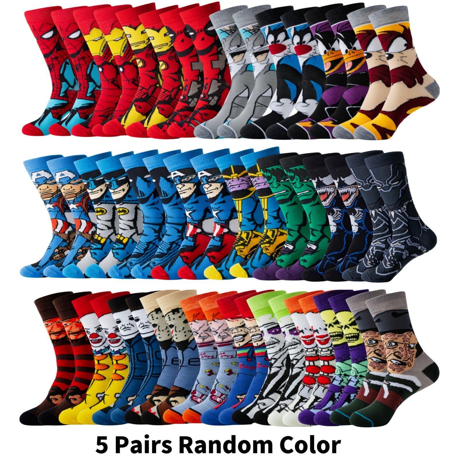 5/10/20 Pairs Men’S Cartoon Crew Socks, 97.8% Polyester 2.2% Spandex, Breathable Knit Fabric, Casual Street Style, All Seasons Outdoor Wear, Hand Washable