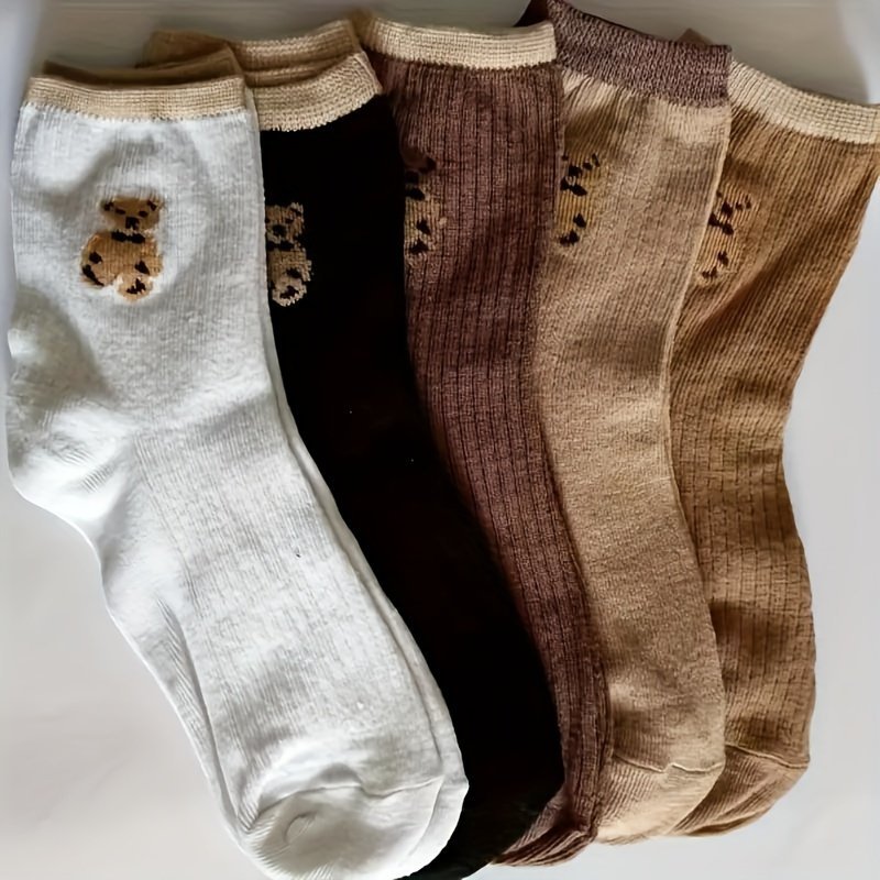 5 Pairs Cute Cartoon Bear Embroidered Crew Socks For Women, Soft Comfortable Breathable Polyester Knit Fabric With Spandex, Casual Sports Short Socks With Hand Wash Instructions
