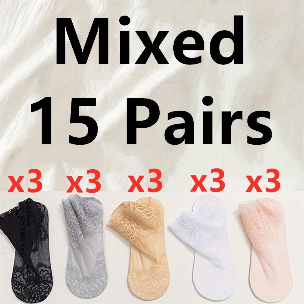 5 Pairs Women’S Invisible Boat Socks, Geometric-Pattern Lace Floral Trim, Knit Fabric Polyester 95% Spandex 5%, Hand Washable, Contrast Lace Ankle Socks