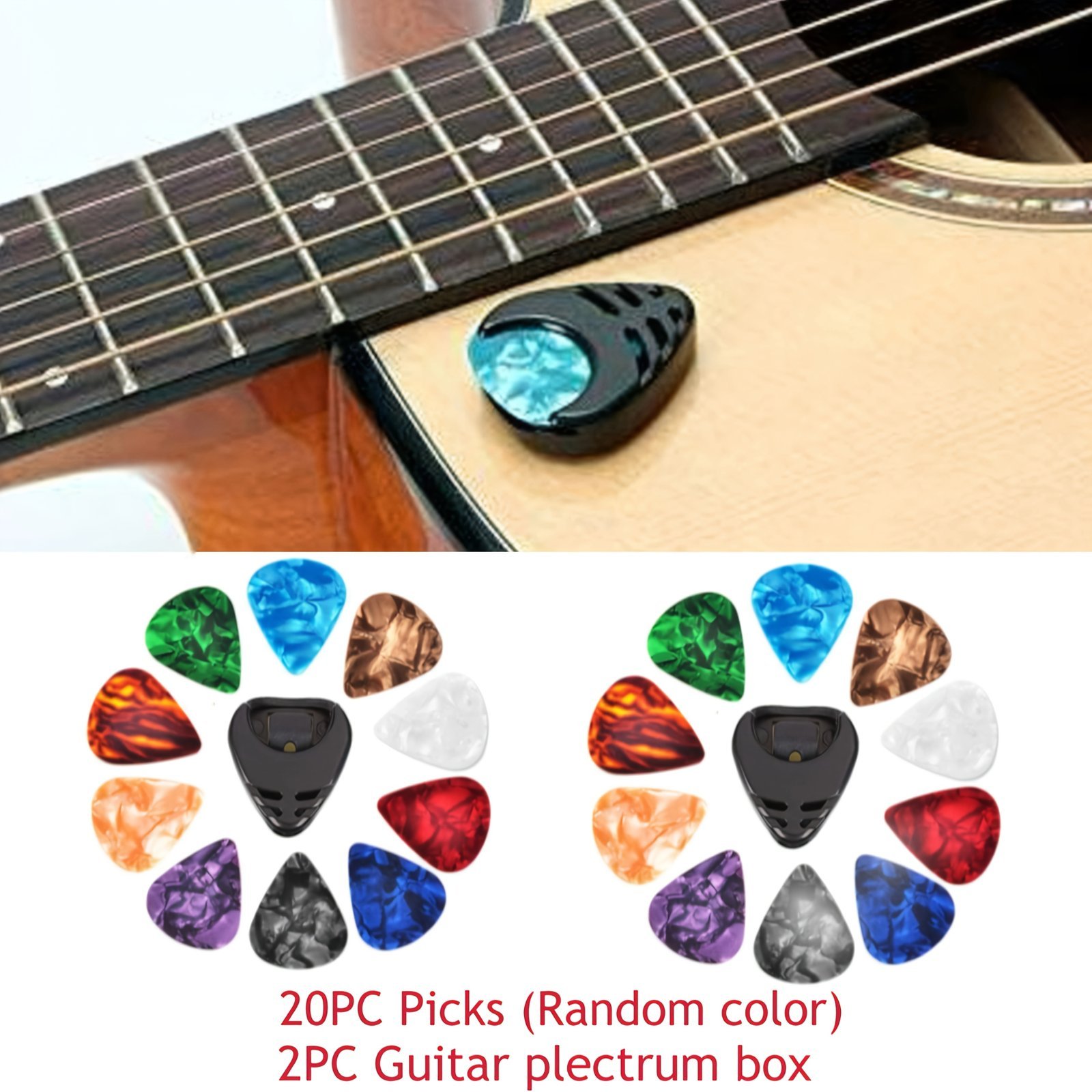 5Pcs/10Pcs/20Pcs Guitar Picks And Pick Holder Set, For Acoustic Guitar Electric Bass Ukulele Easy-To-Stick Bracket Random Color + 1Pc/1Pcs/2Pcs Guitar Pick Box