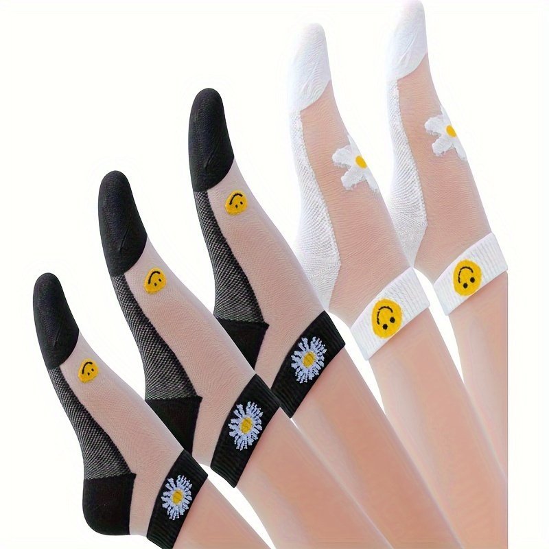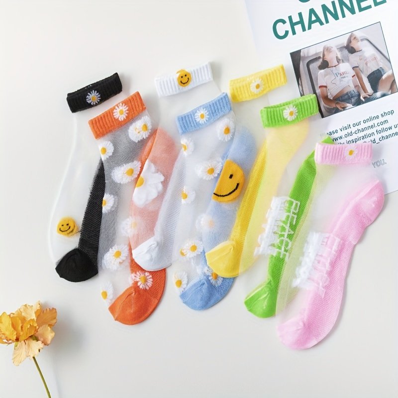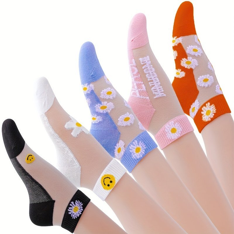 5Pcs Women’S Korean Style Daisy Ankle Socks – Breathable & Lightweight, No-Show Summer Boat Socks In Assorted Colors With Invisible Toe Design, Cute Socks