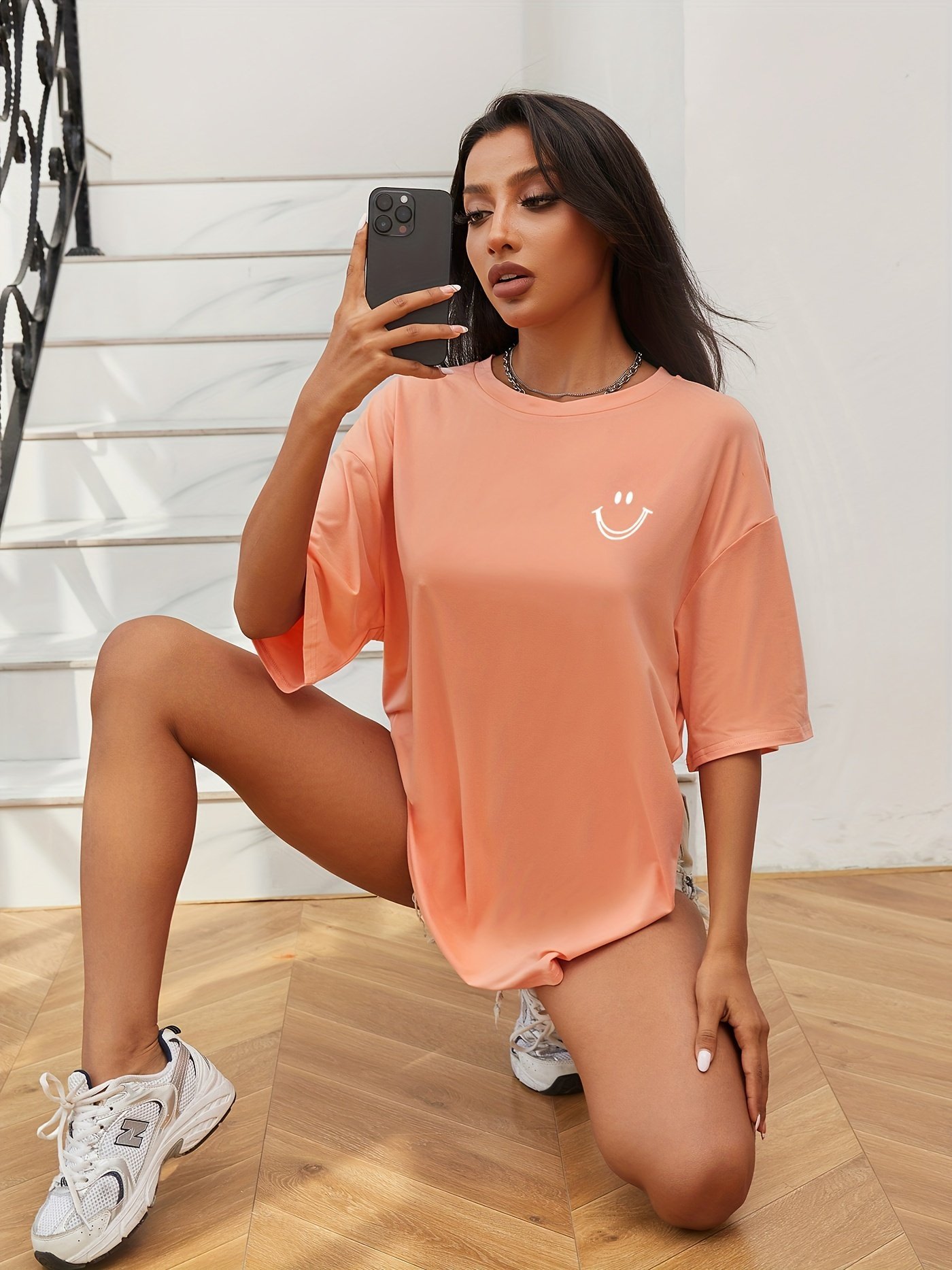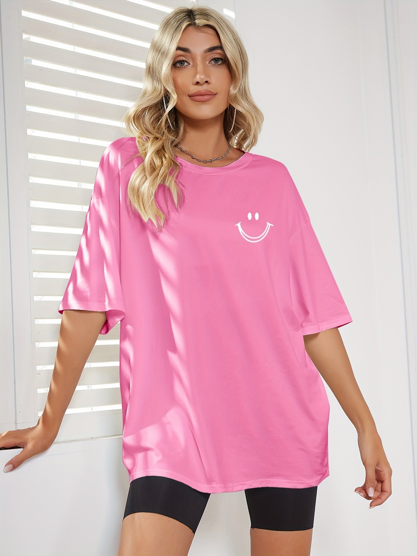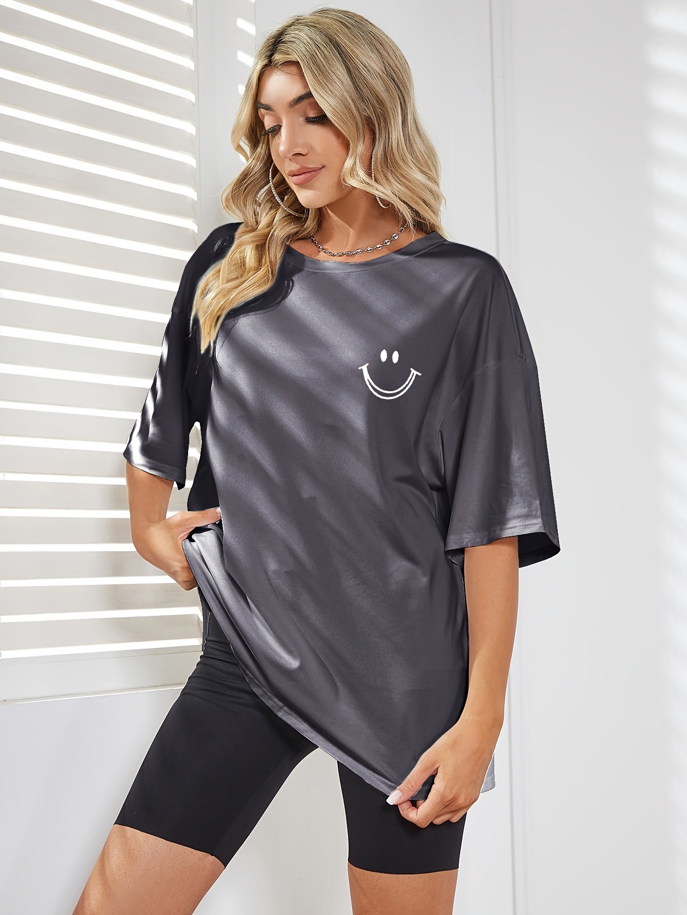 6917 Women’S Light Blue Joyful Face Graphic Print T-Shirt – High Elasticity Loose Fit Drop Shoulder Short Sleeve Round Neck Casual Summer Top, Ladies T Shirts, Comfortable Tee, Stretchy Fabric