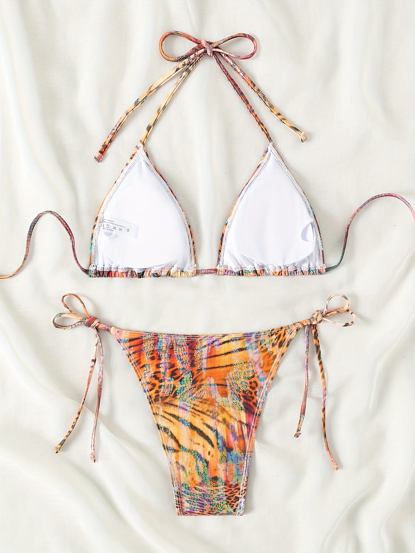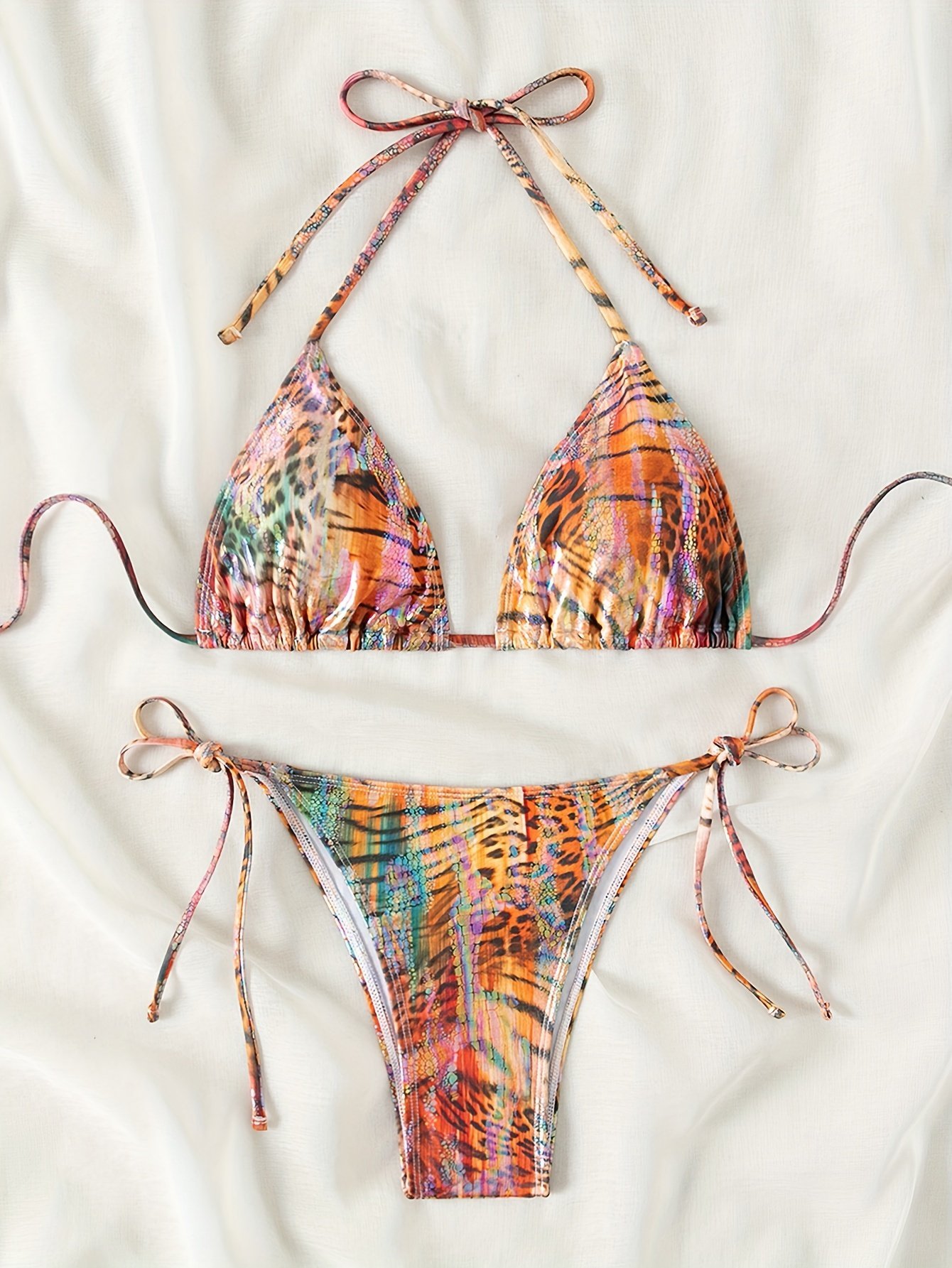 Animal Skin Print 2 Piece Set Bikini, Halter V Neck Tie Back Backless High Cut Tie Side Swimsuits, Women’S Swimwear & Clothing Triangle Top