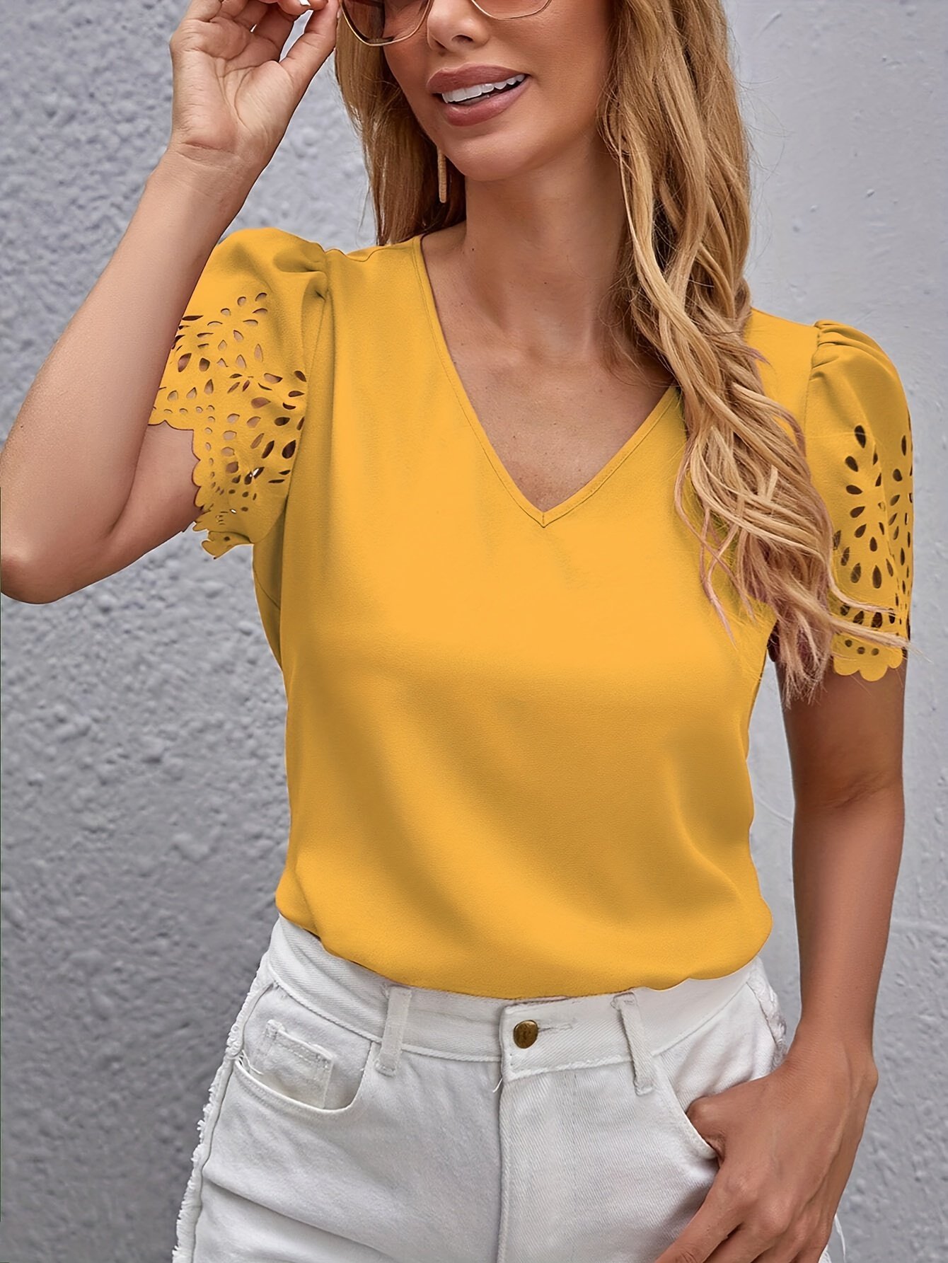 Elegant Casual Short-Sleeve Top For Women With Laser-Cut Scalloped Edges.