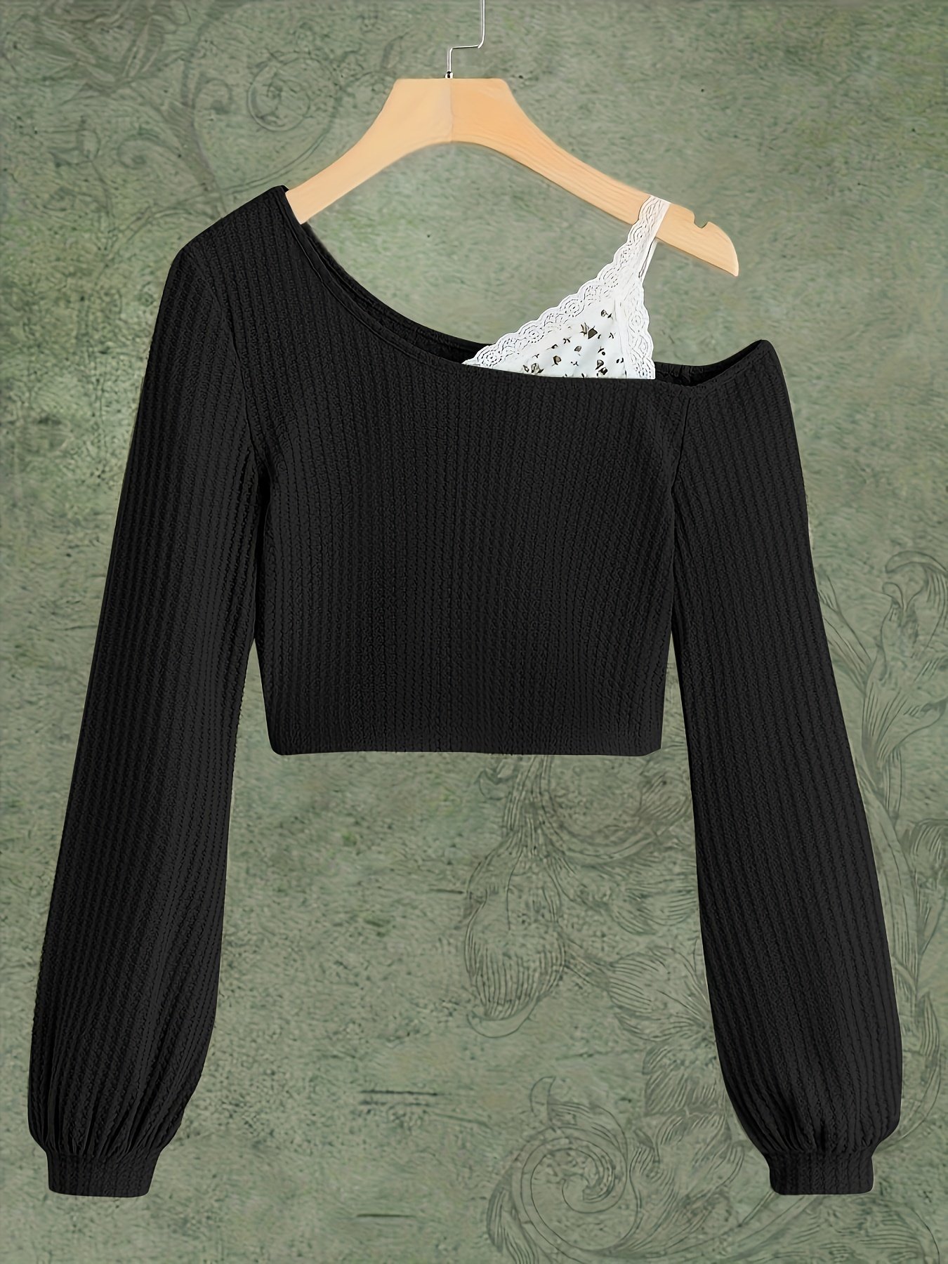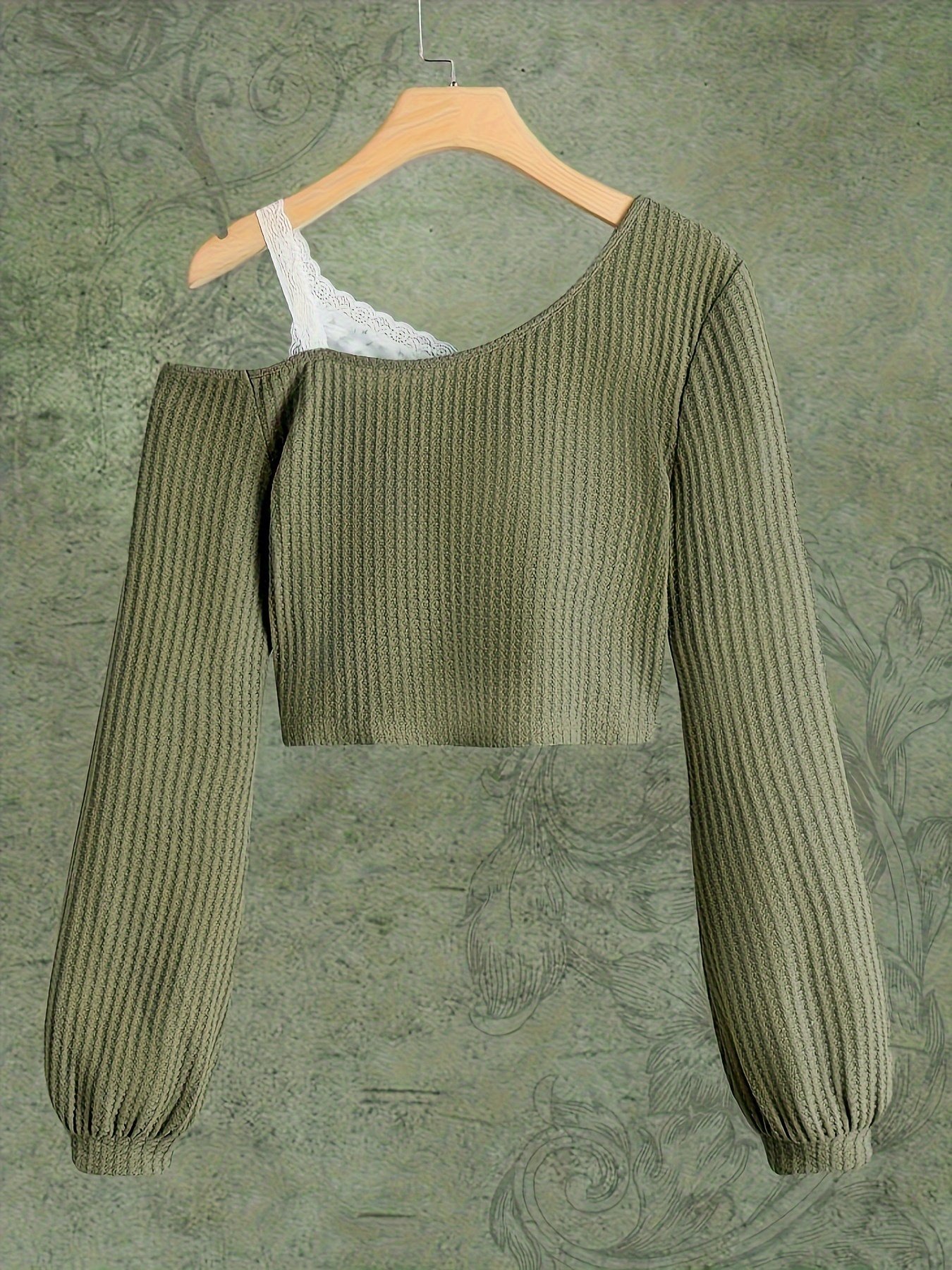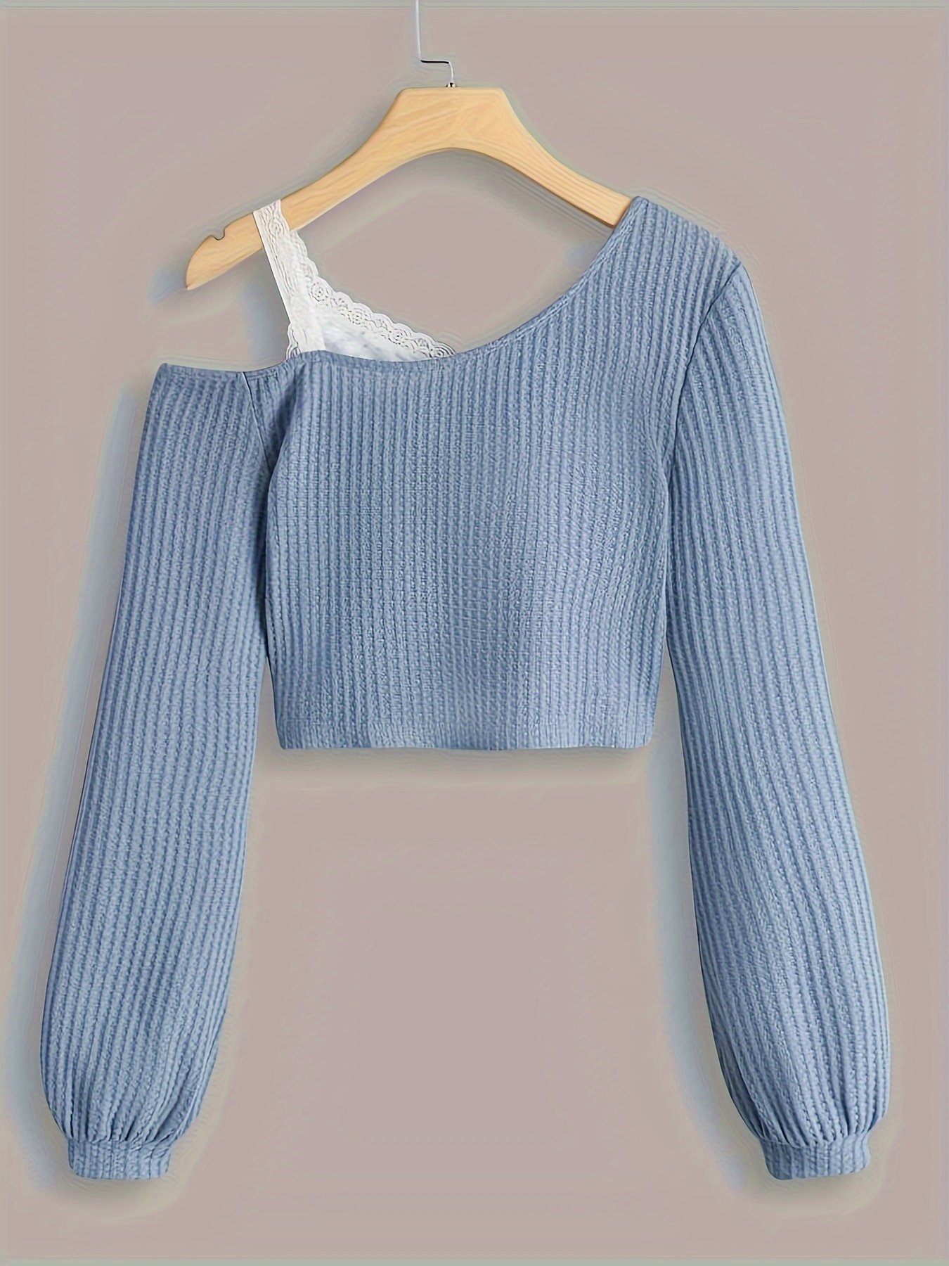 Elegant Light Blue Off-Shoulder Lace Trim T-Shirt – Floral Print, Long Sleeve, Ribbed Texture, Machine Washable – Chic Spring & Autumn Women’S Top
