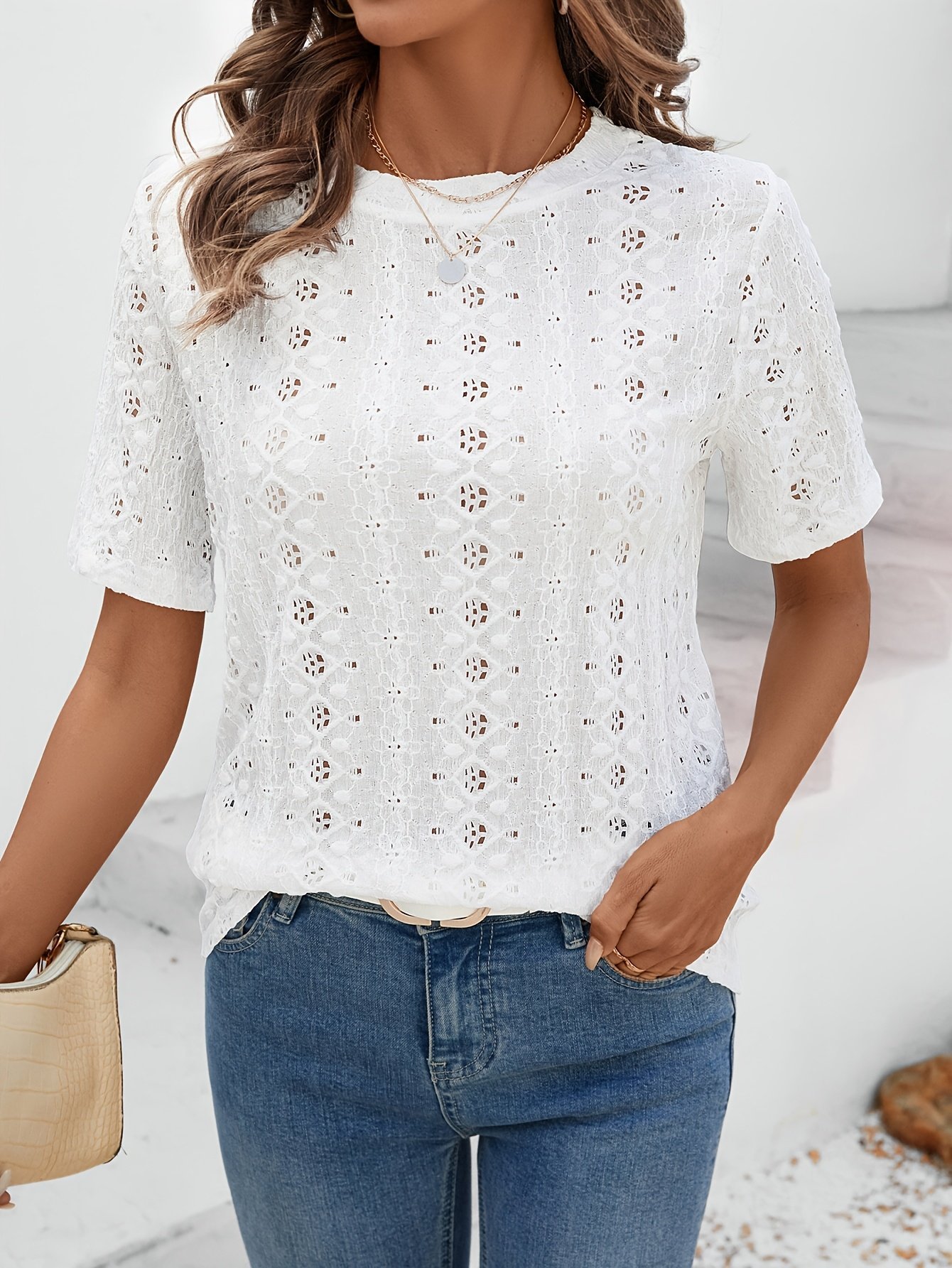 Eyelet Embroidered Crew Neck T-Shirt, Casual Short Sleeve Top For Spring & Summer, Women’S Clothing