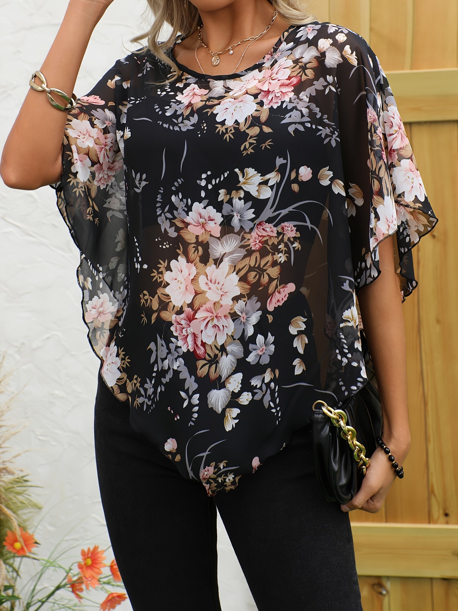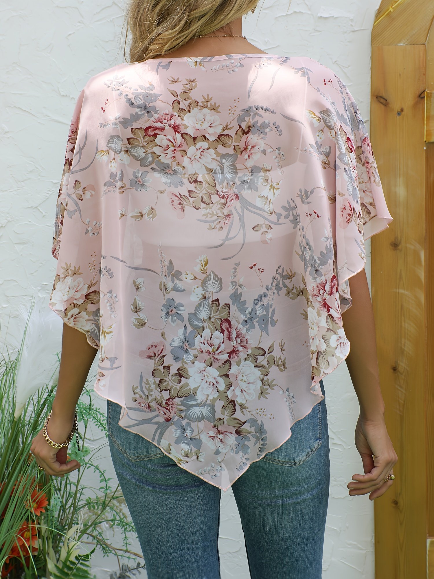 Floral Pattern Elegant Cover Up, Round Neck Semi-Sheer Beach Cover Up Top, Women’S Swimwear & Clothing