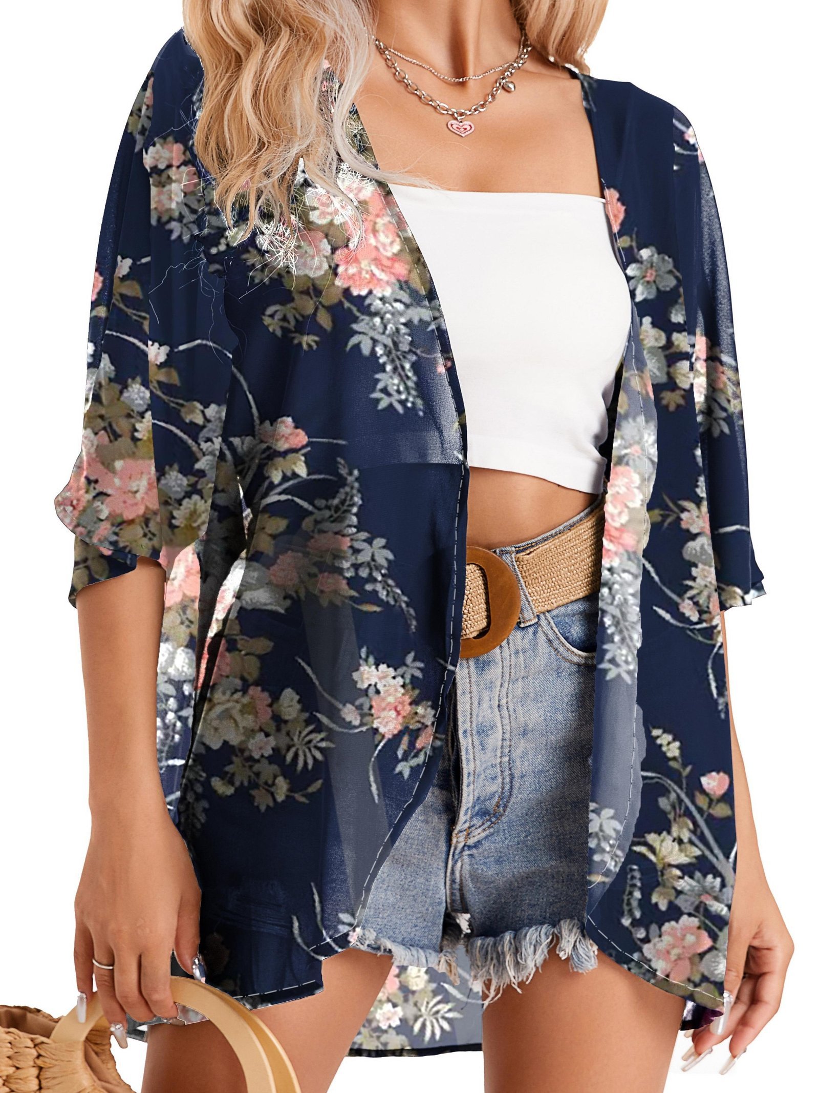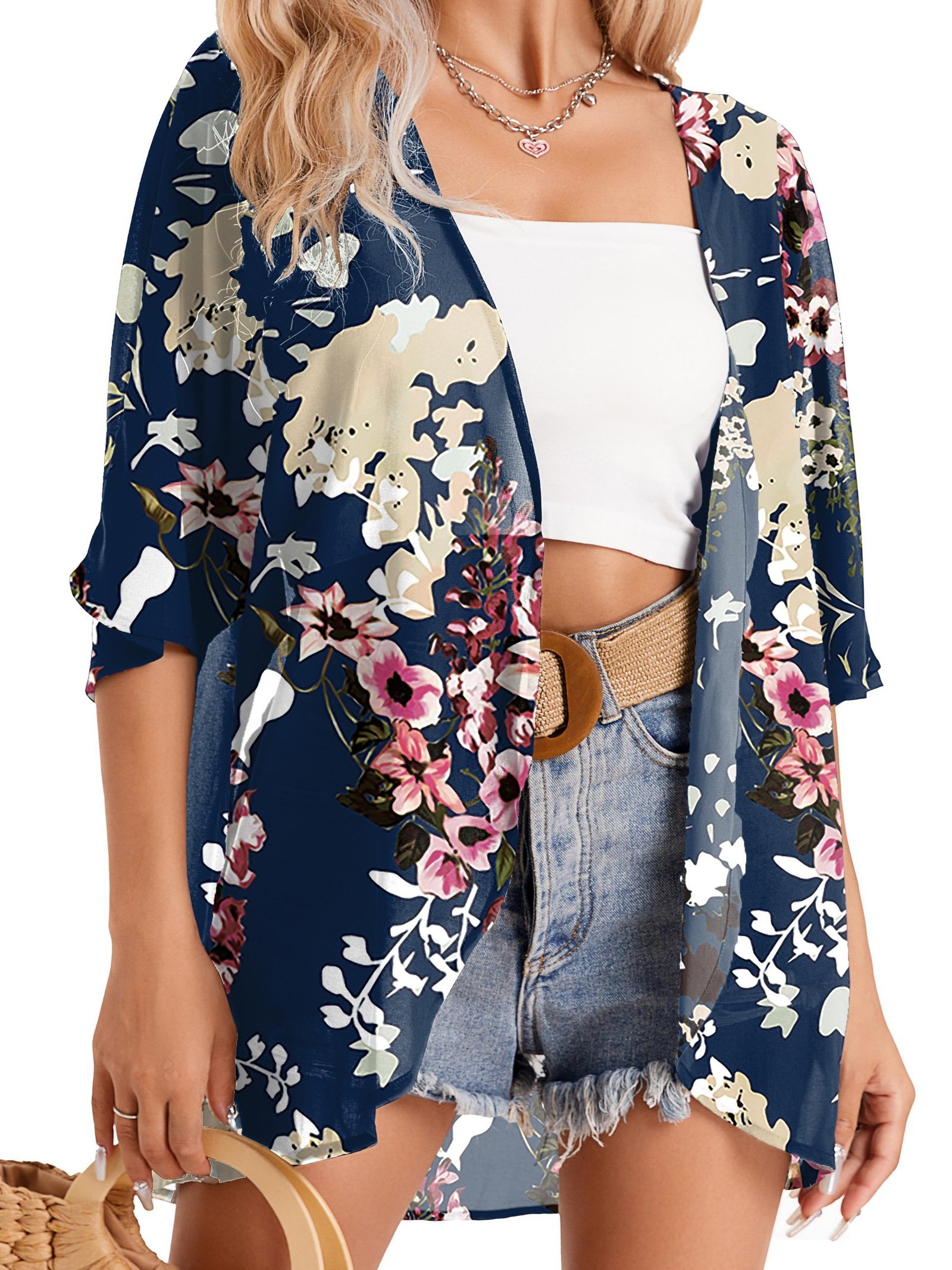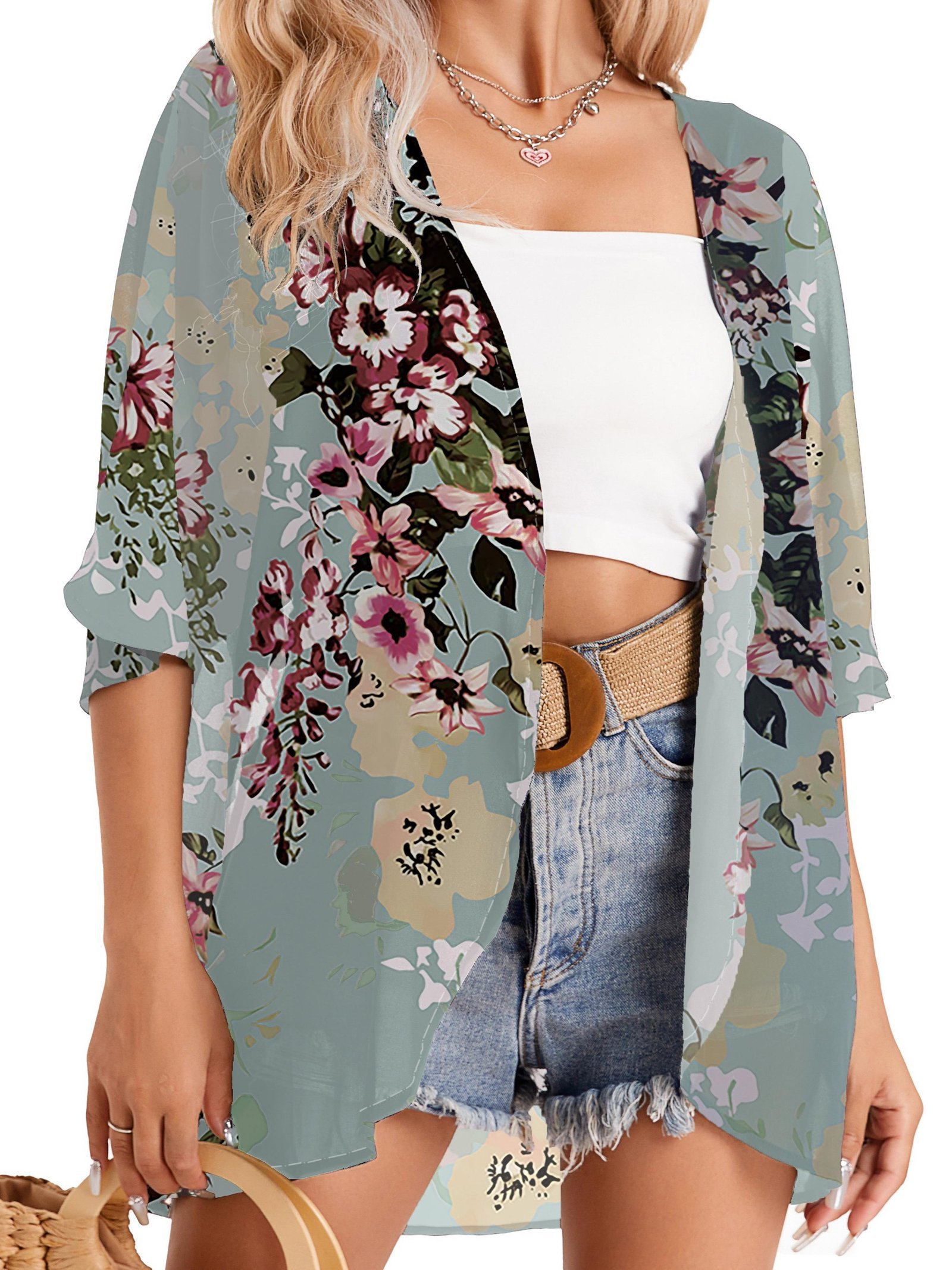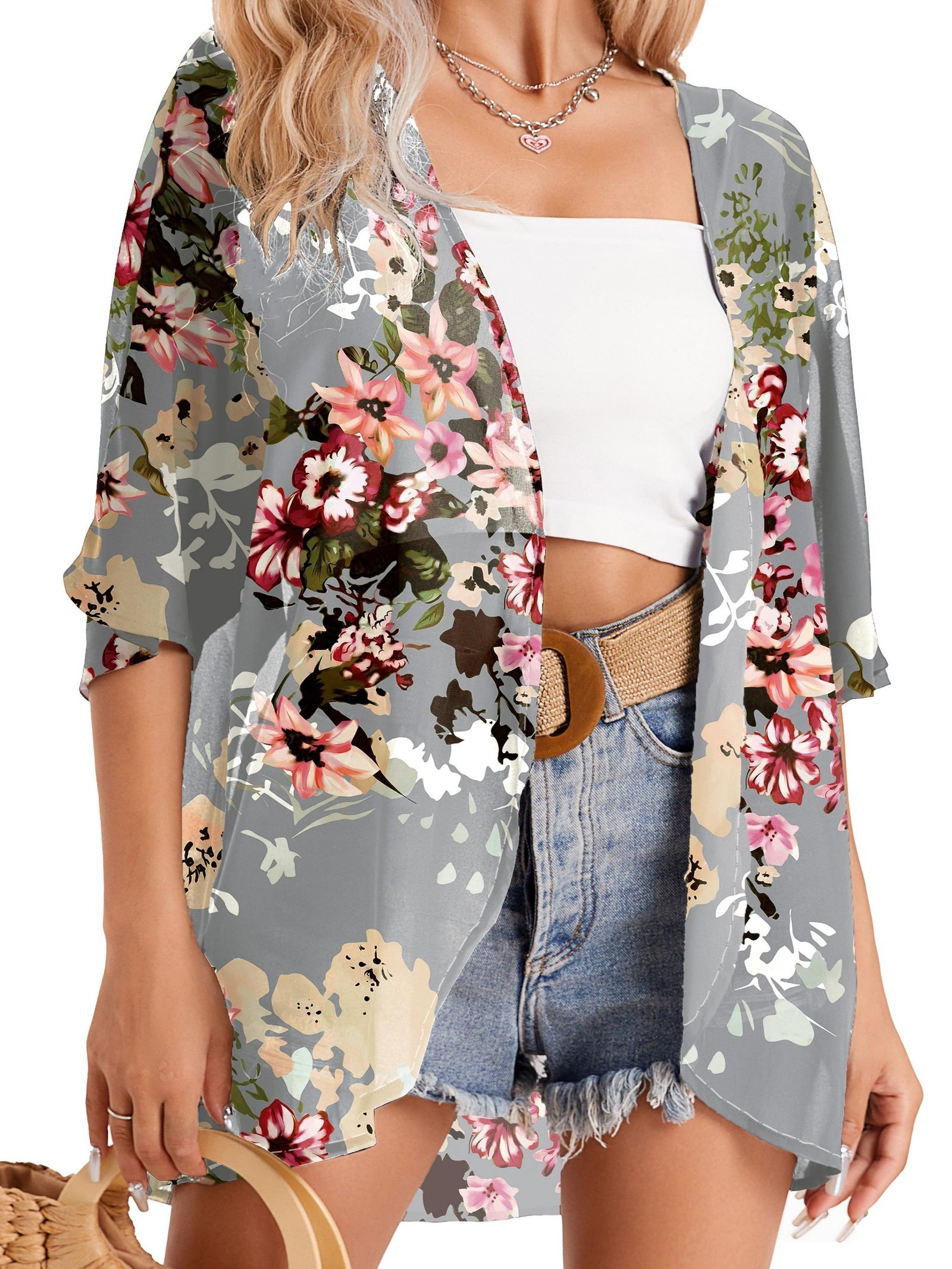 Floral Print Cover Up Cardigan, V Neck Loose Fit Half Sleeves Casual Beach Kimono, Women’S Swimwear & Clothing