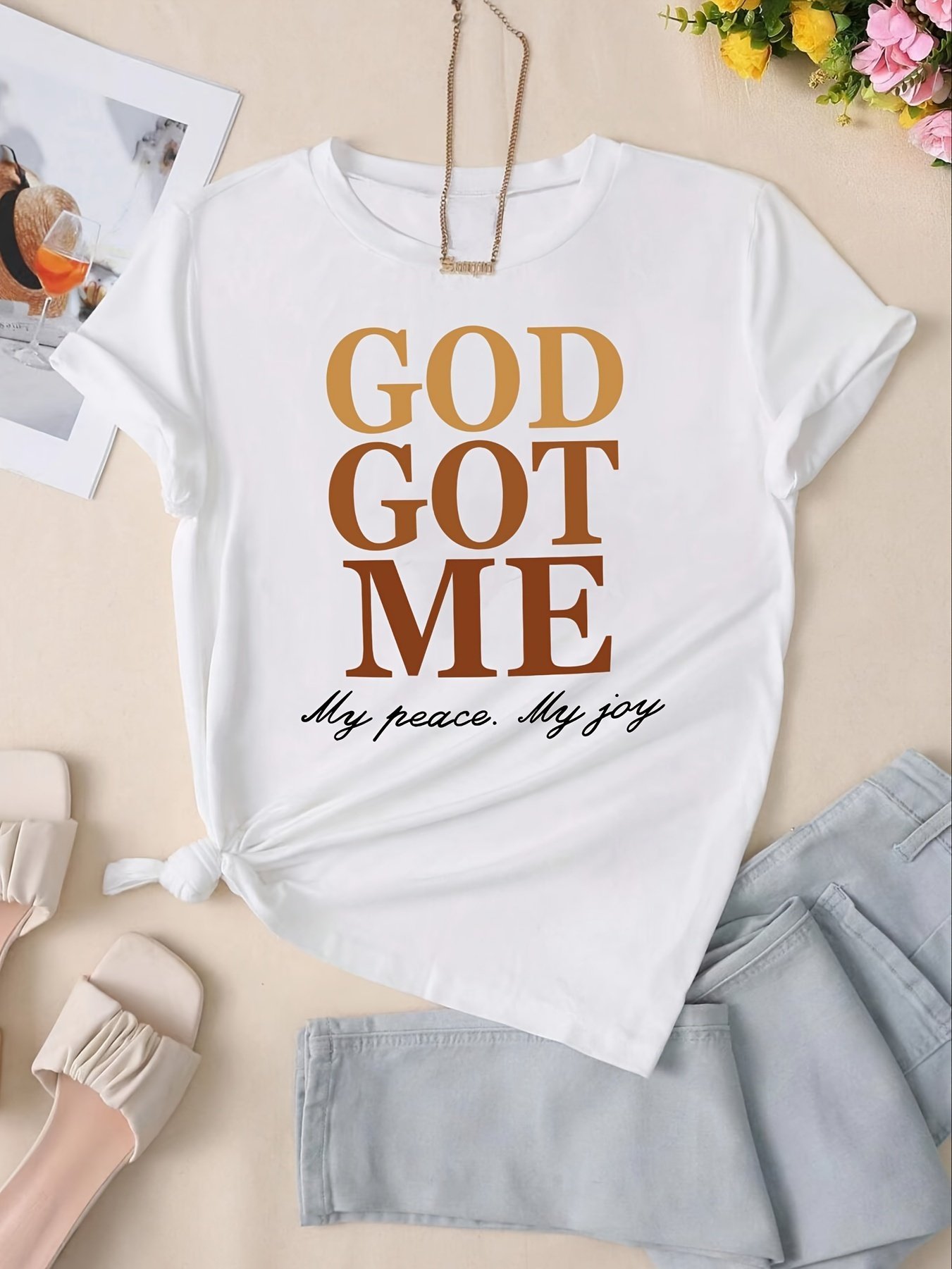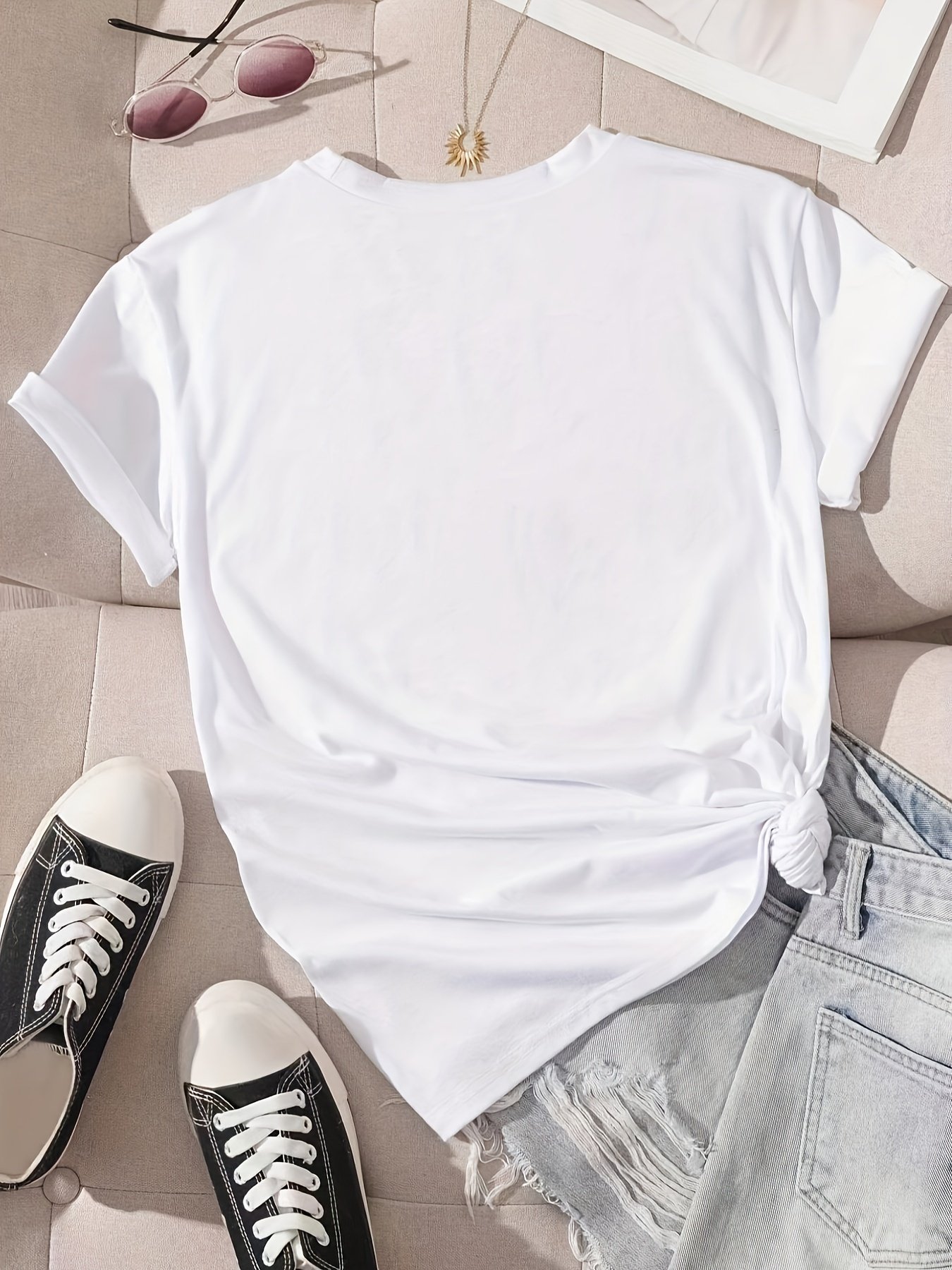 1Pc Women’S Summer Casual Crew Neck T-Shirt, Polyester Knit Fabric, Geometric Dandelion Pattern, “Just Breathe” Slogan, Regular Length Short Sleeve Top