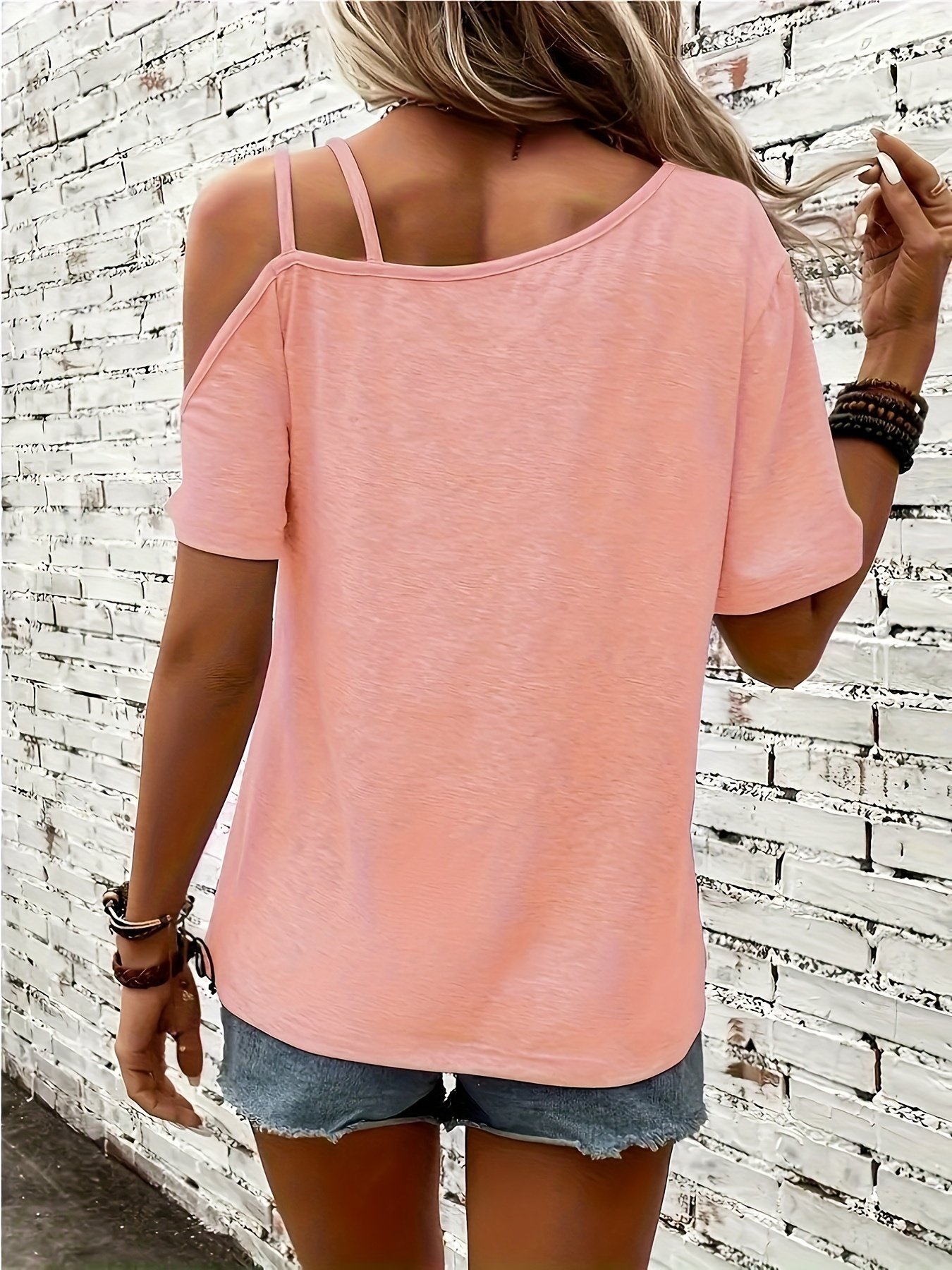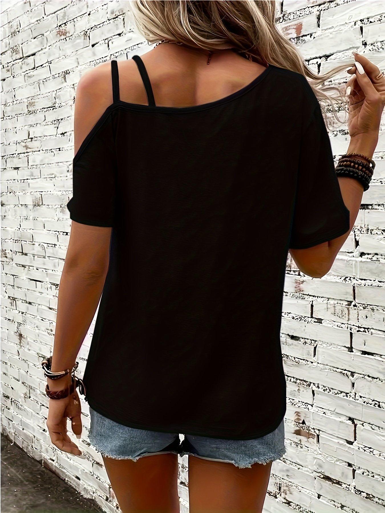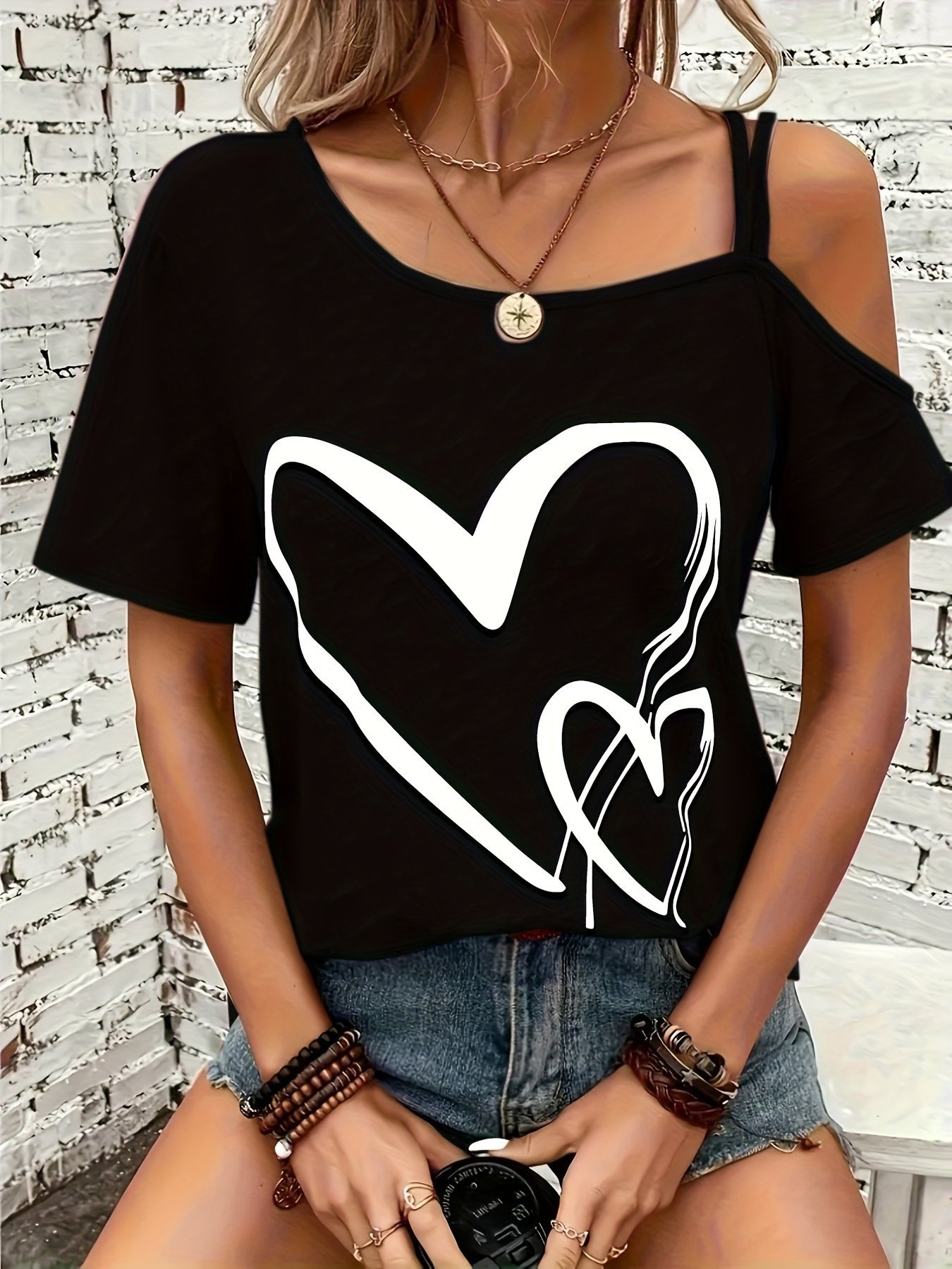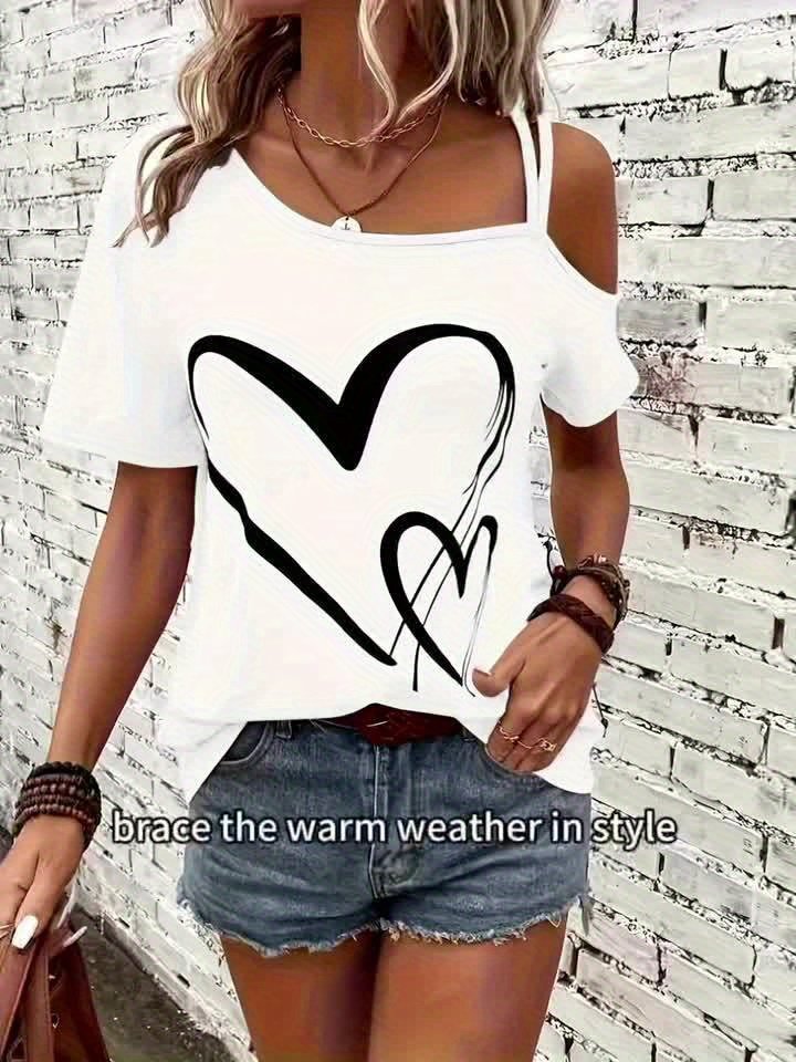 Heart Print Cold Shoulder T-Shirt, Casual Short Sleeve Backless Asymmetrical Top, Women’S Clothing