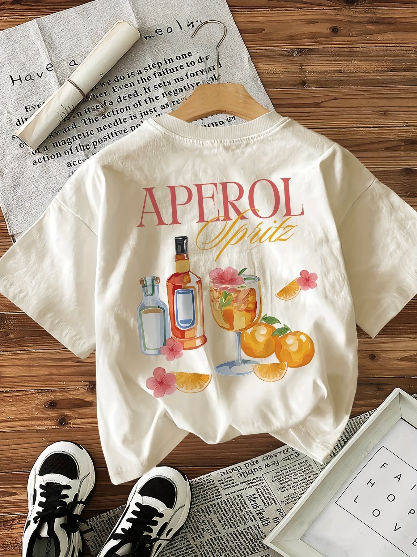 Illustration Style Cocktail Aperol Letter Print T-Shirt, Loose Casual Round Neck Top For Women.