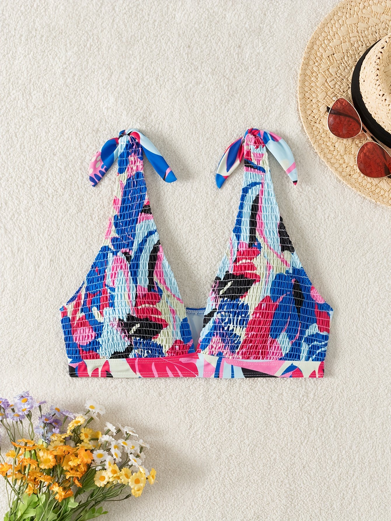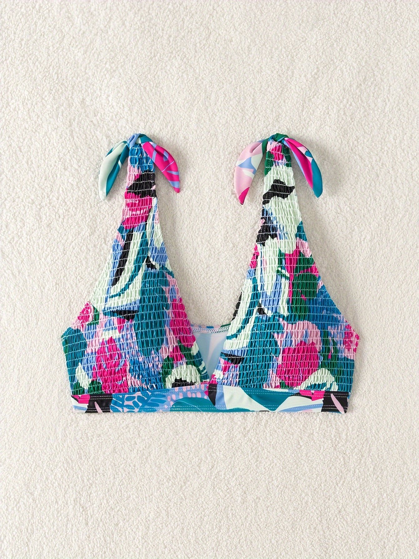 Leaf Print Shirred Knot Bikini Top, V Neck High Stretch Colorful Swimsuit Top Bra, Women’S Swimwear & Clothing