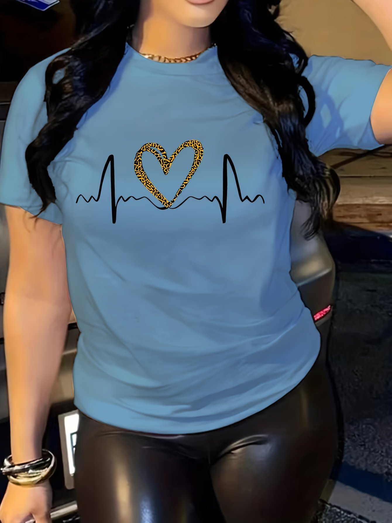 Leopard Heart Print Comfy T-Shirt, Round Neck Short Sleeve Sports Tee, Women’S Activewear