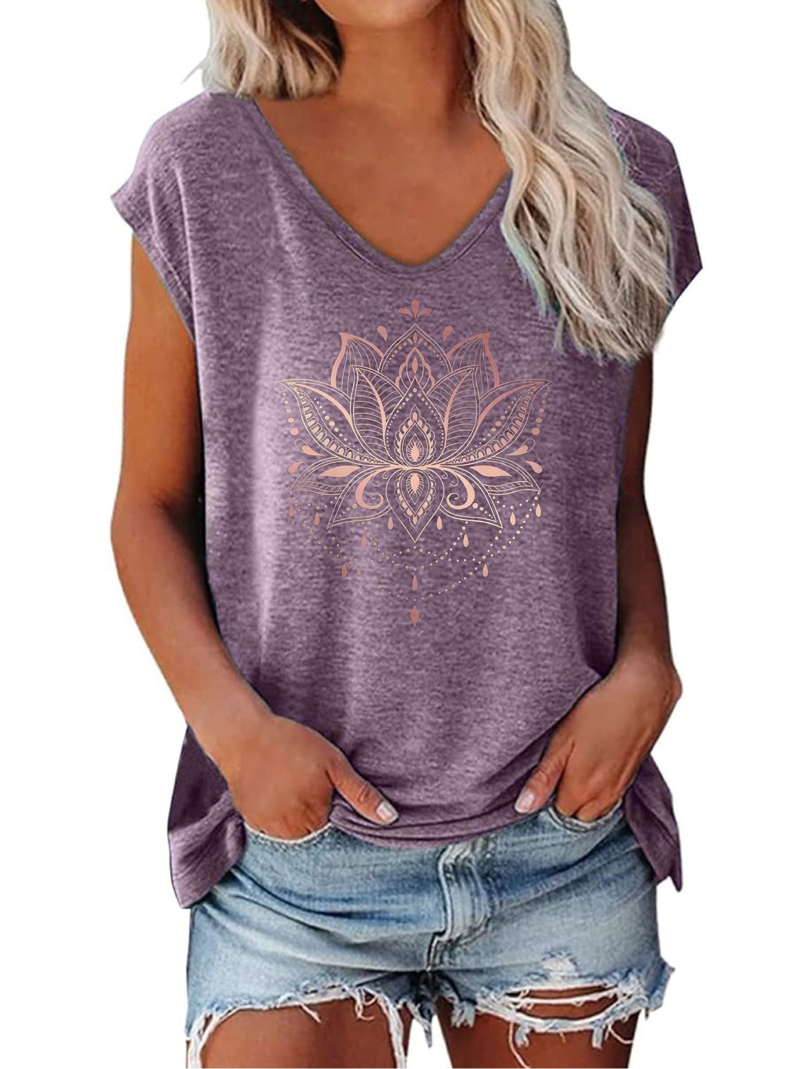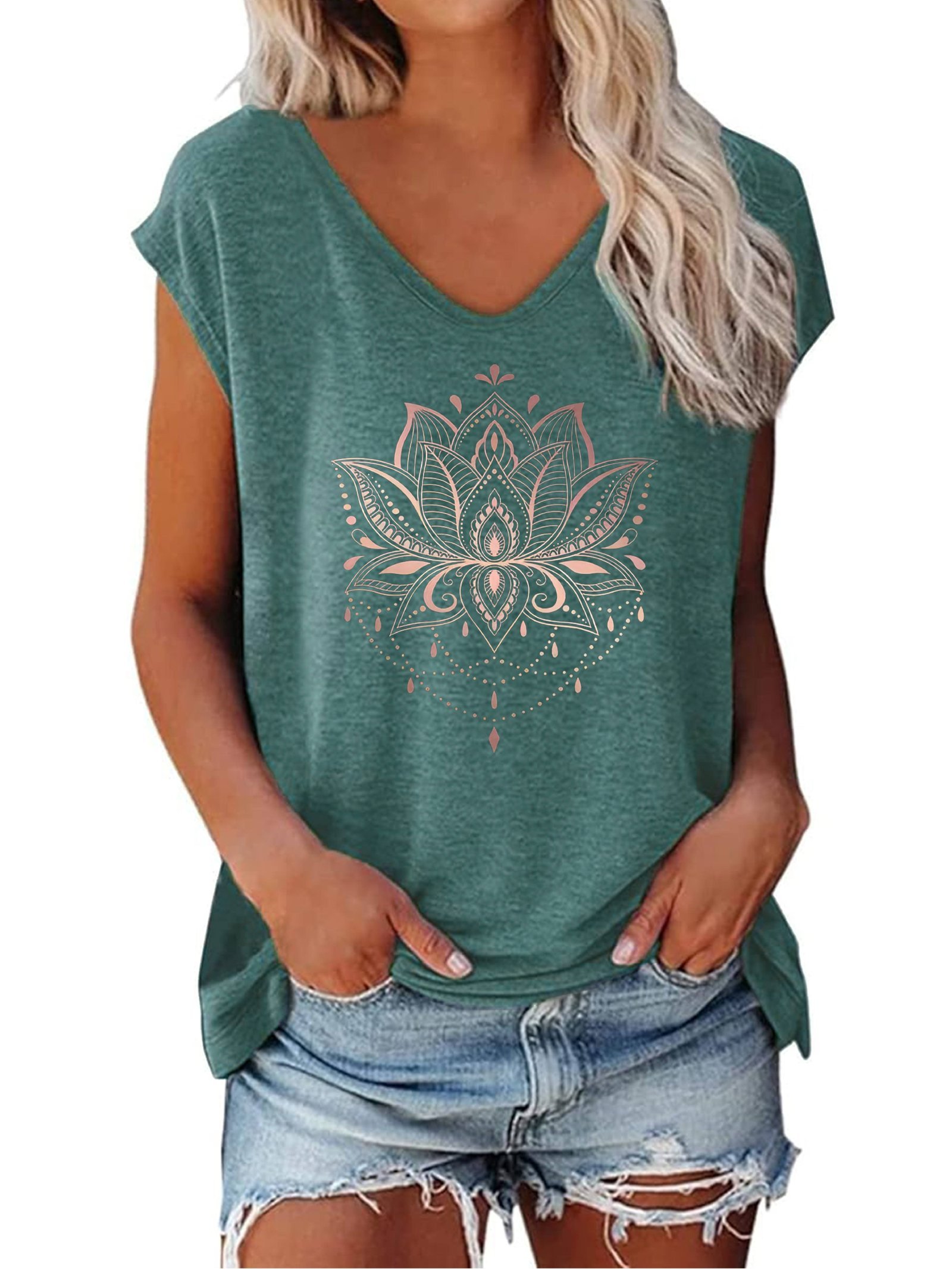 Lotus Print V-Neck T-Shirt, Casual Cap Sleeve T-Shirt For Spring & Summer, Women’S Clothing