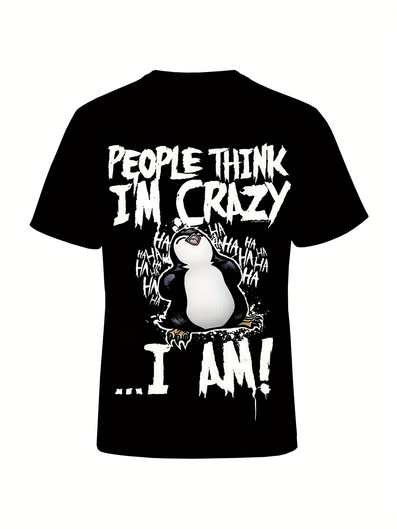 Men’S Plus Size 3D Print Short Sleeve T-Shirt – Bold “People For Think I’M Crazy” Graphic & Cartoon Penguin Design, Loose Fit Casual & Party Wear, Machine Washable, Humorous Clothing | Bold Graphic Tee | Semisheer Material, Plus Size