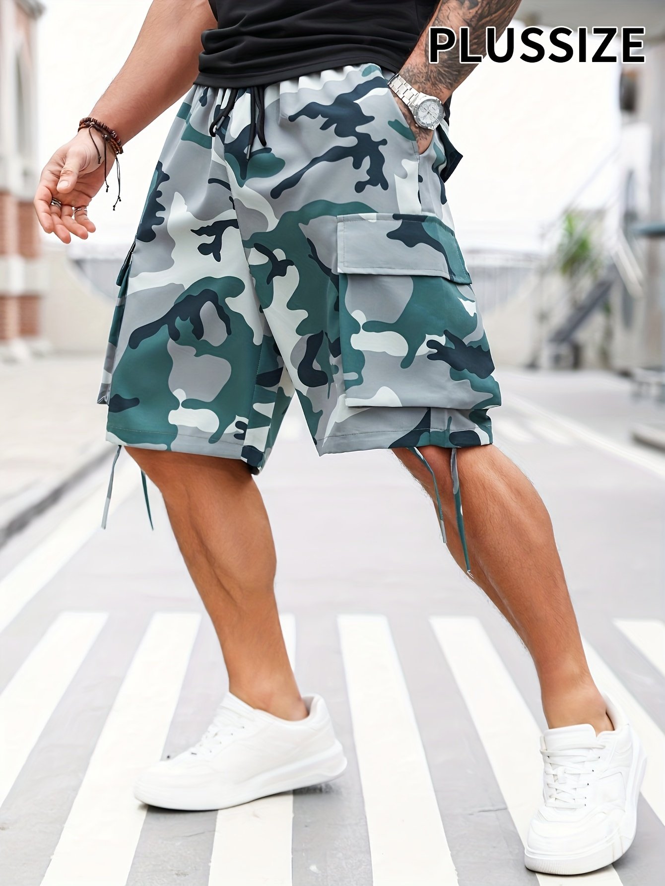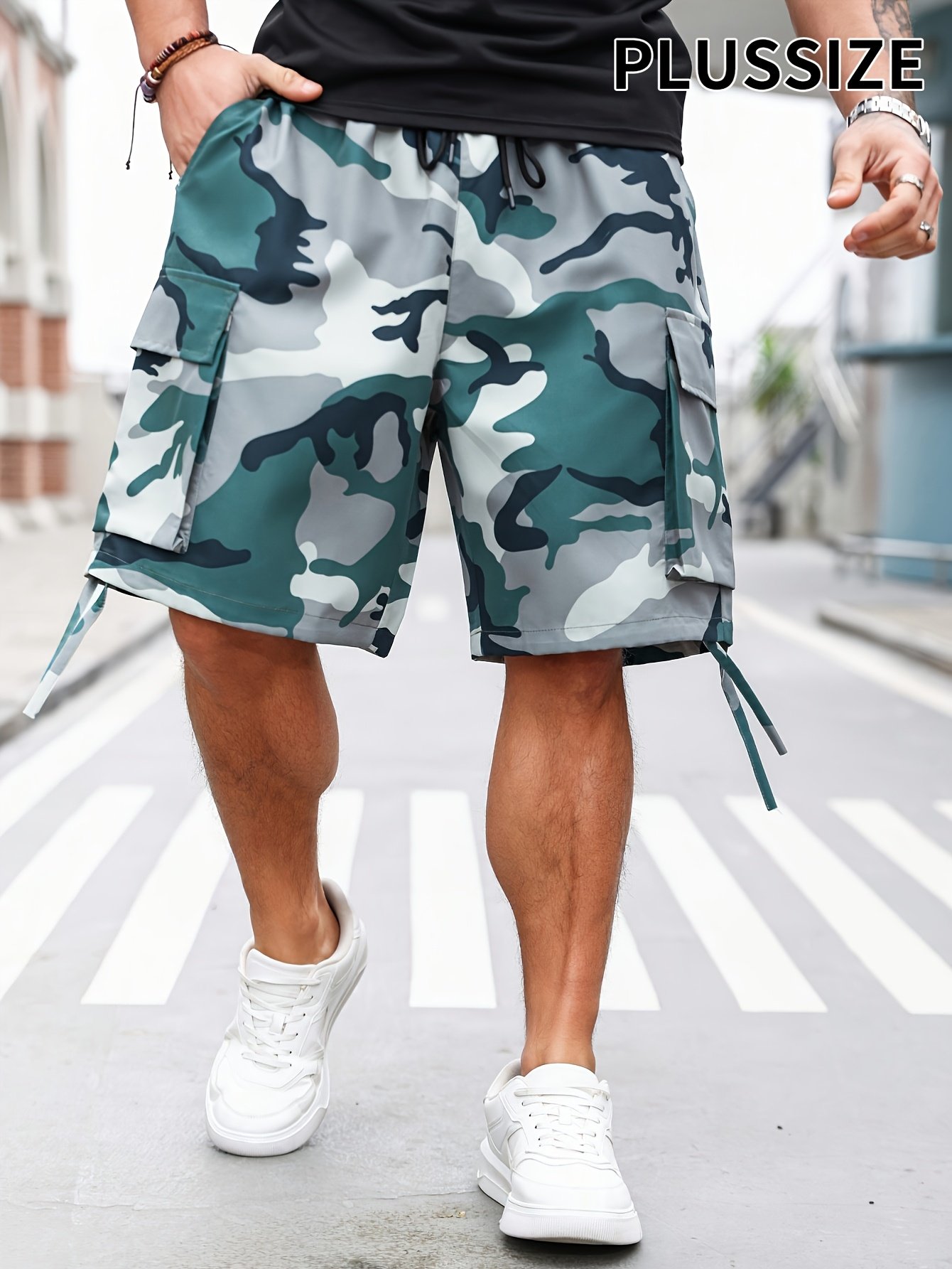 Men’S Plus Size Camouflage Cargo Shorts – Elastic Waist With Adjustable Drawstring, Multiple Pockets, Regular Fit Casual Outdoor Shorts For Casual Attire, Camouflage Shorts, Comfortable Fashion, Durable Design, Summer Wear, Geometric Pattern, Nonstretch Fabric, Big And Tall, Plus Size