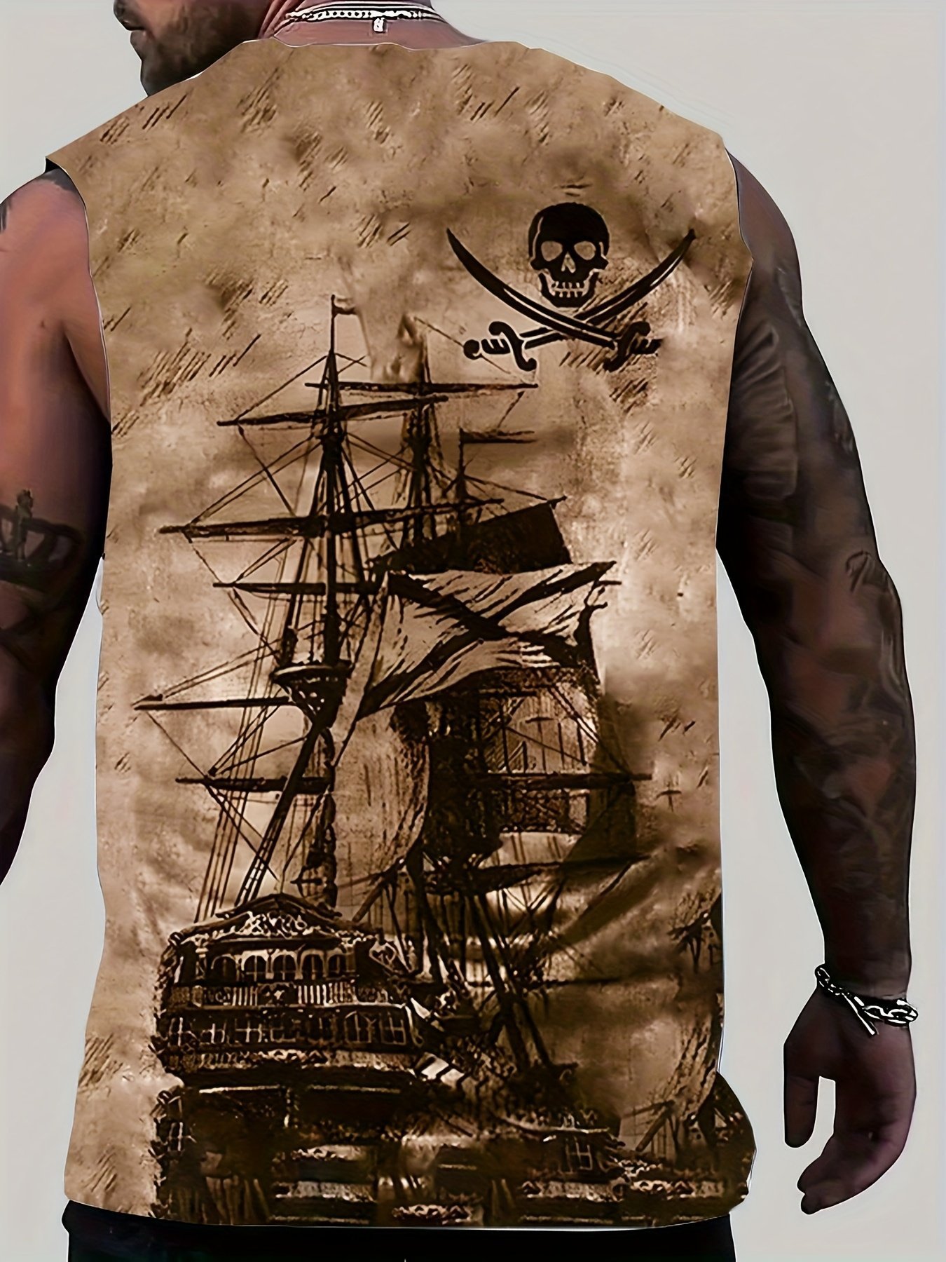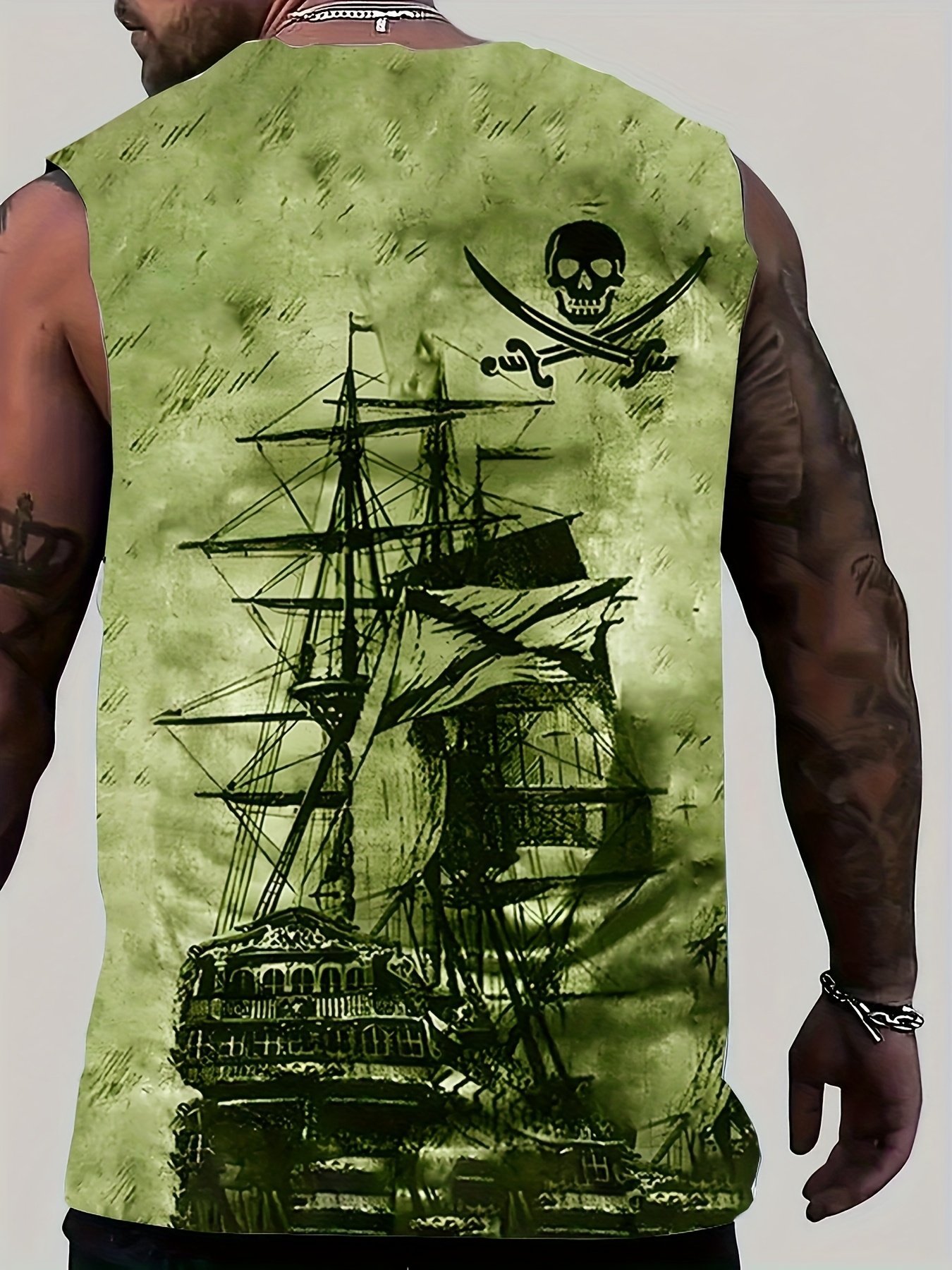 Men’S Plus Size Pirate Ship Graphic Tank Top – Breathable Polyester, Street Style Sleeveless Shirt For Summer, Plus Size