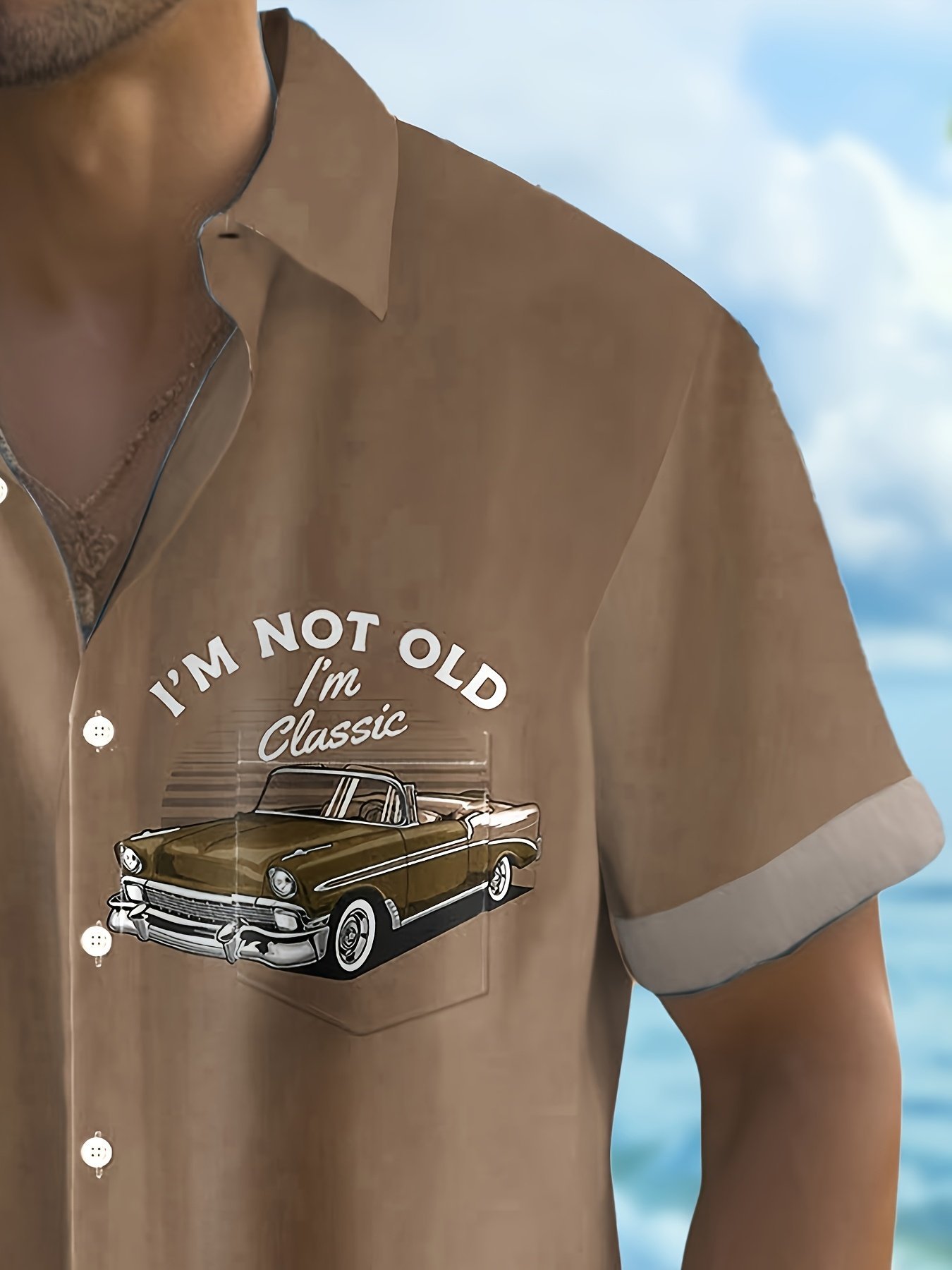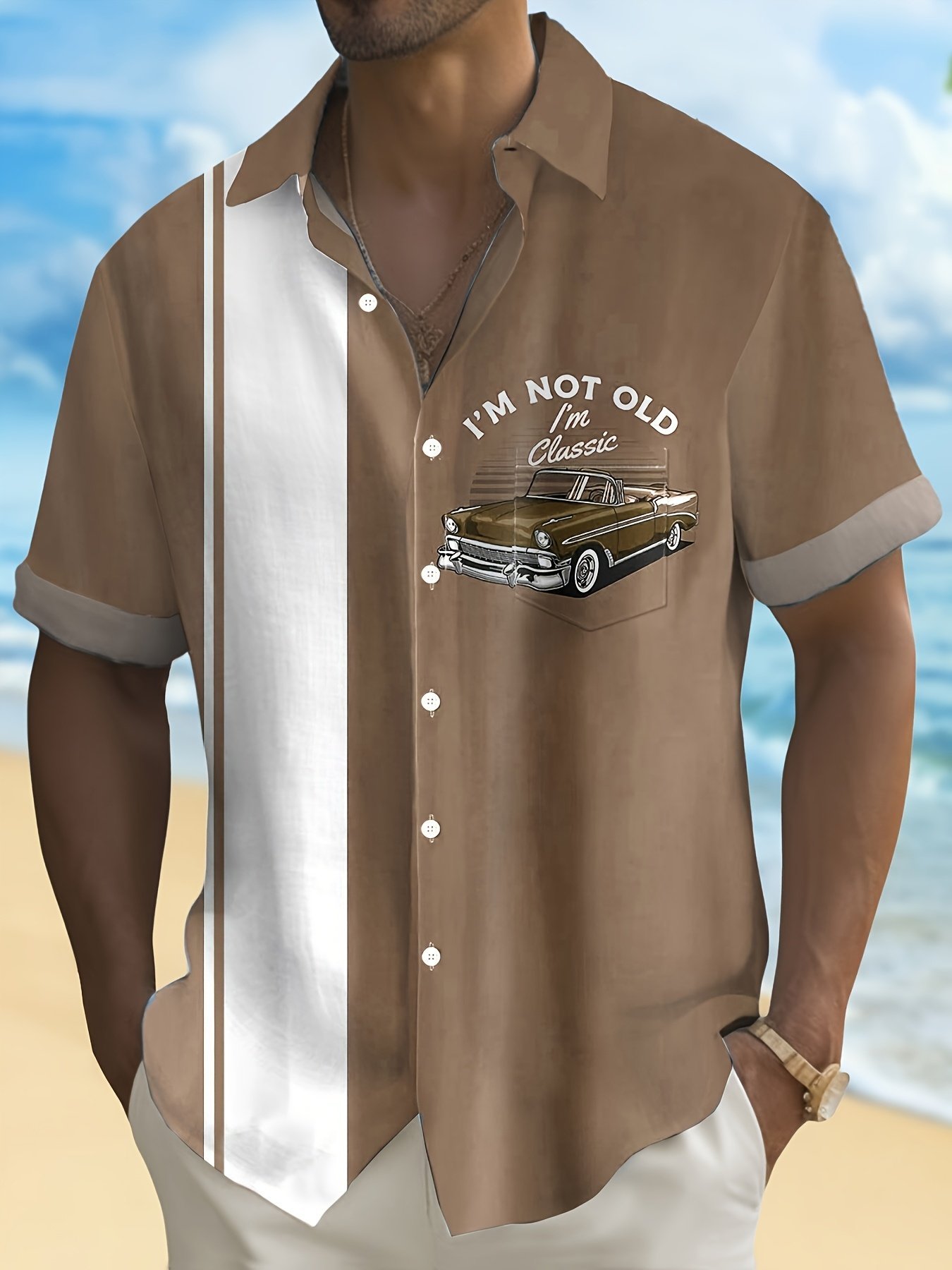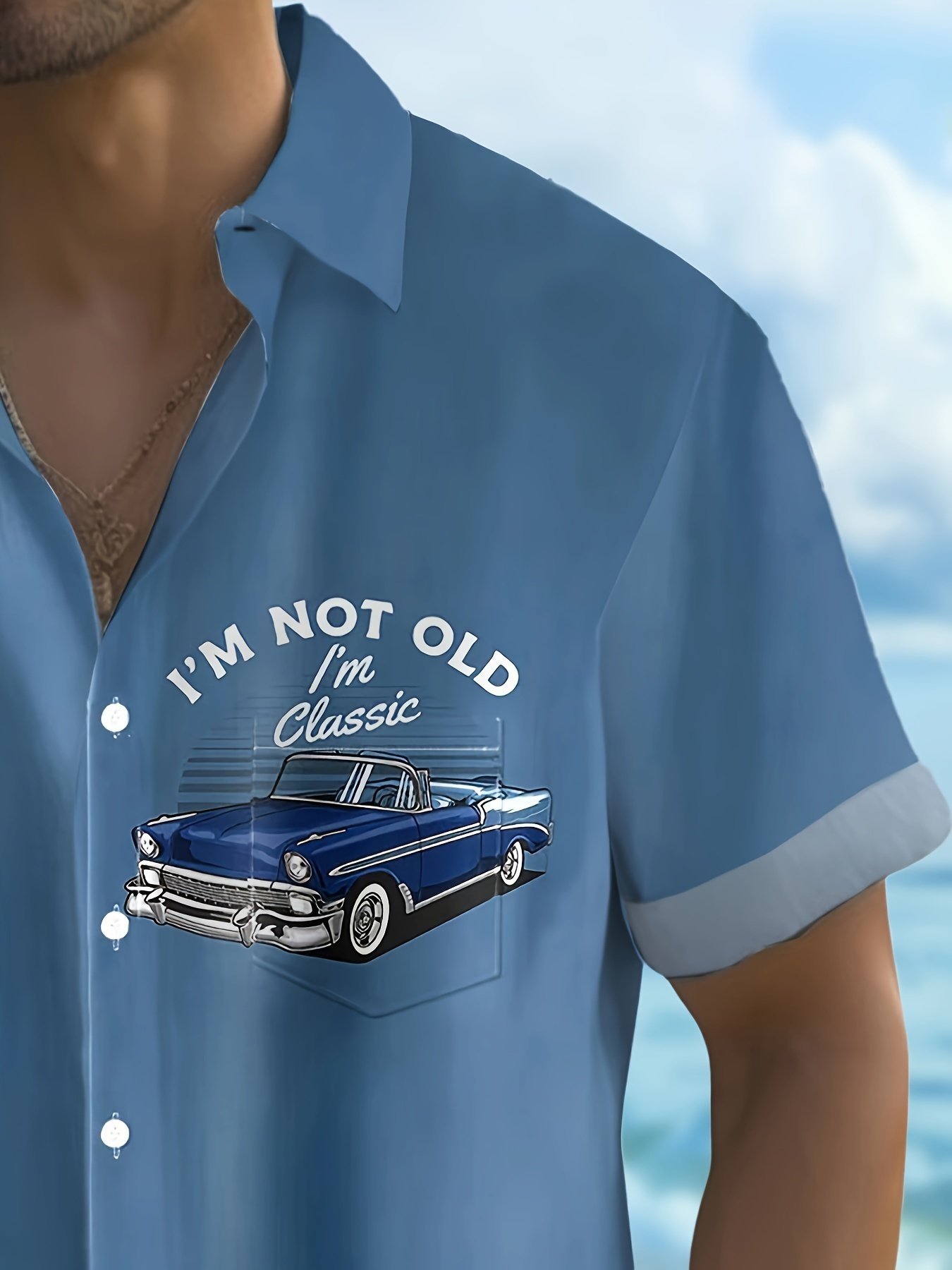 Men’S Plus Size Vintage Car Graphic Button-Up Shirt – Blue & White Checkered, Short Sleeve, Casual Summer Shirt With Front Pocket, Casual Summer Wear|Vintage Car Print|Short Sleeve Shirt