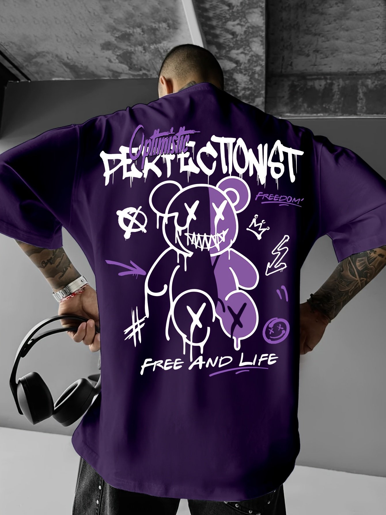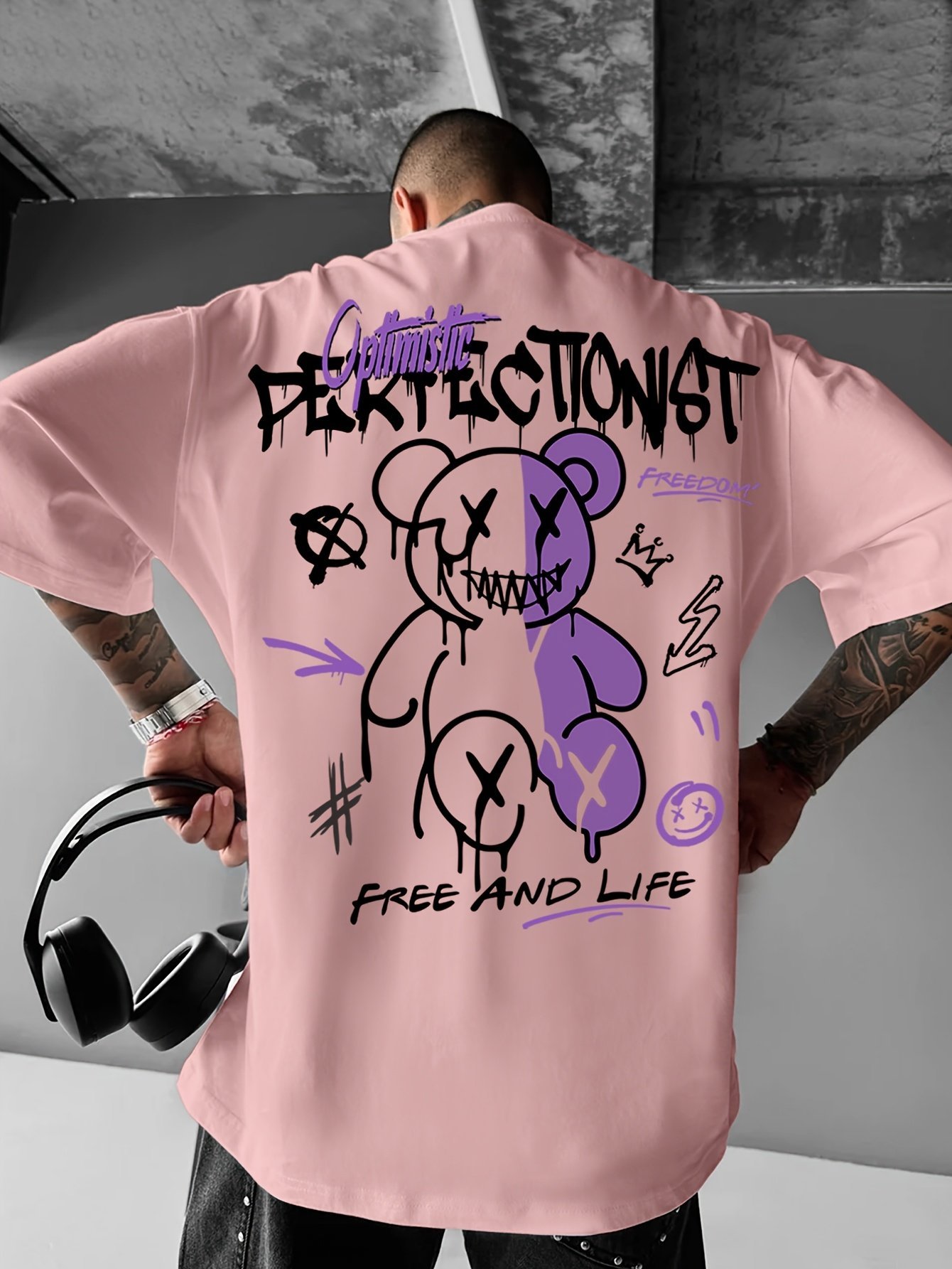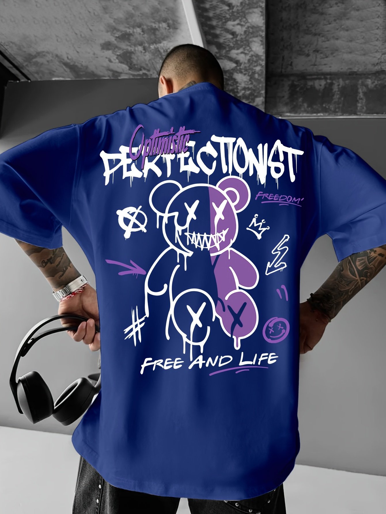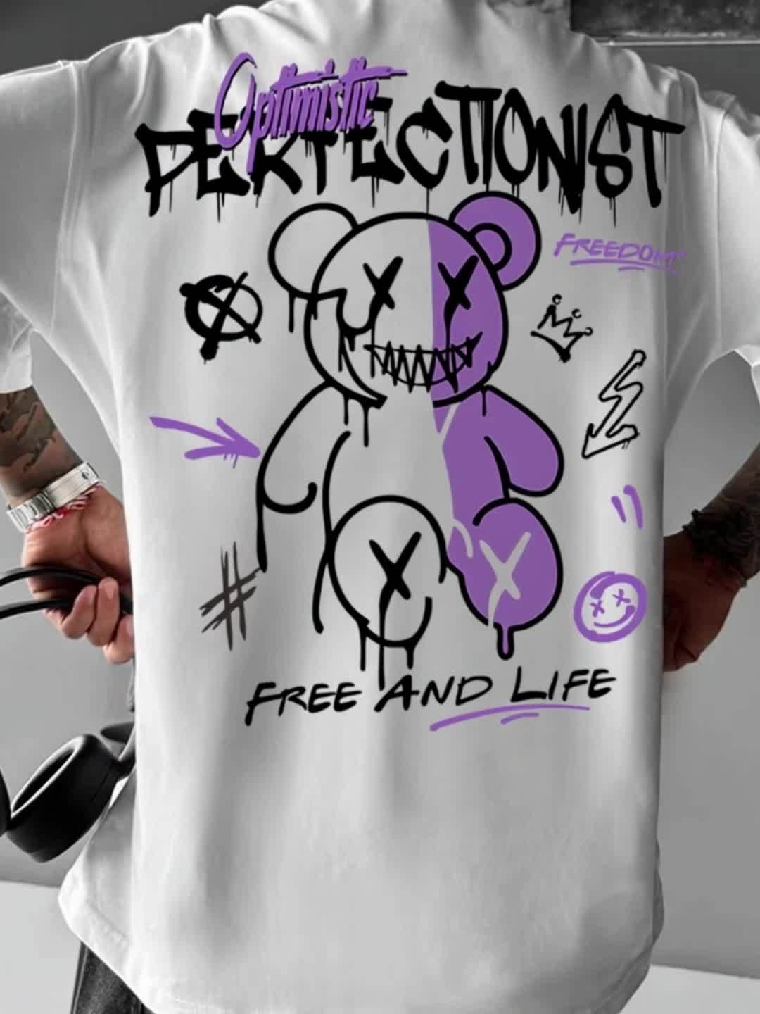 Men’S Streetwear Graphic T-Shirt – Loose Fit Round Neck Summer Tee With Bold “Perfect Not” Bear & Hearts Design, Light Blue Casual Urban Fashion Top For Casual Attire, Streetwear Fashion | Bold Graphic Tee | Comfortable Fit, T Shirt Stylish