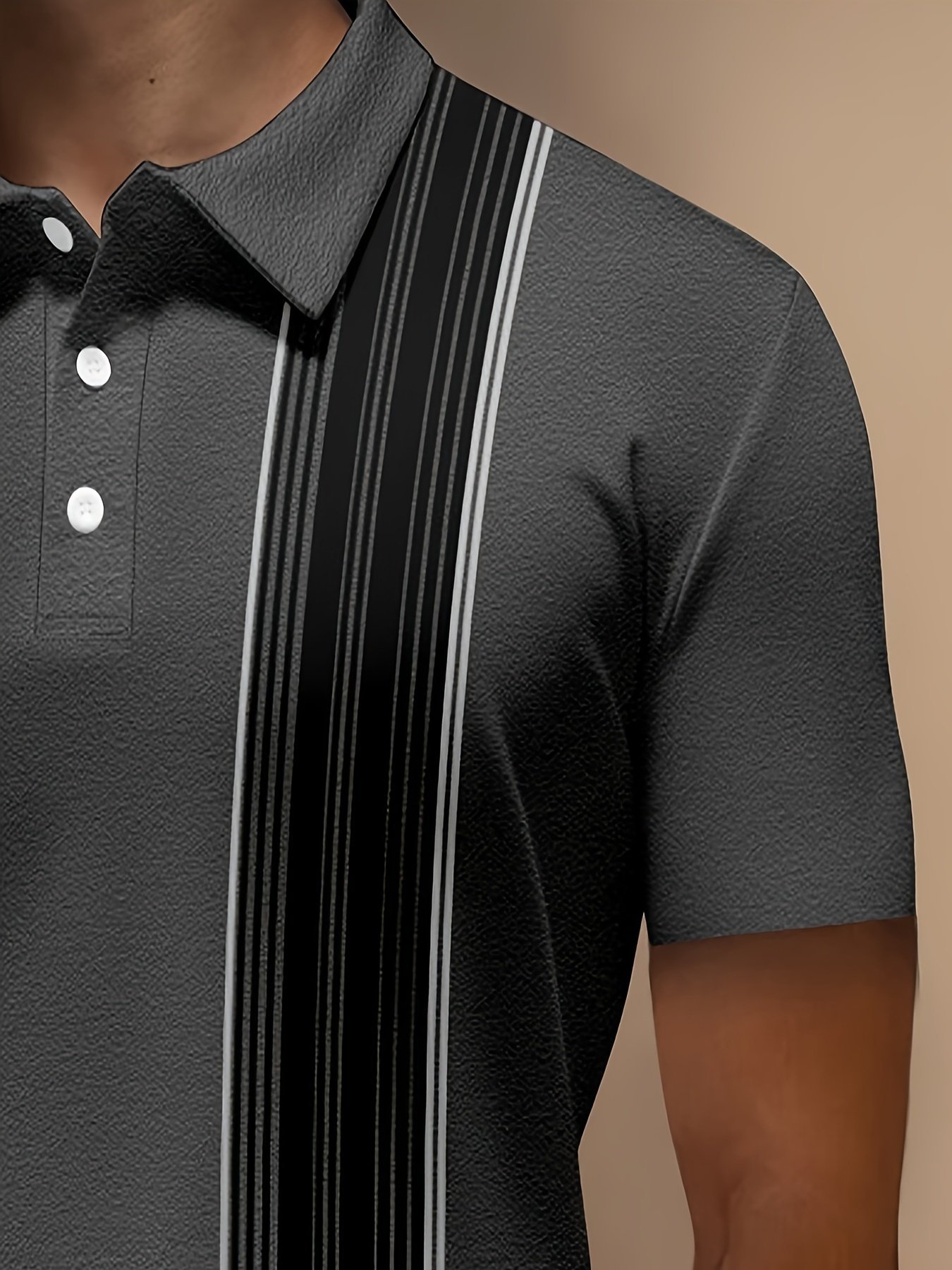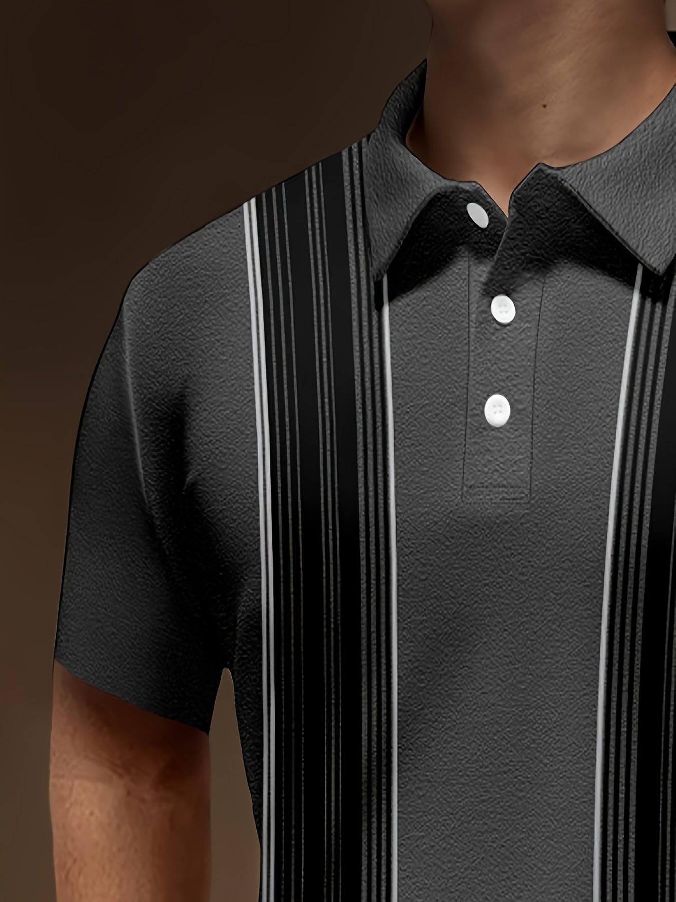 Men’S Vintage Bowling Stripe Print Shirt – Plus Size, Button-Up Short Sleeve With Collar, Breathable Polyester, Perfect For Summer, Plus Size