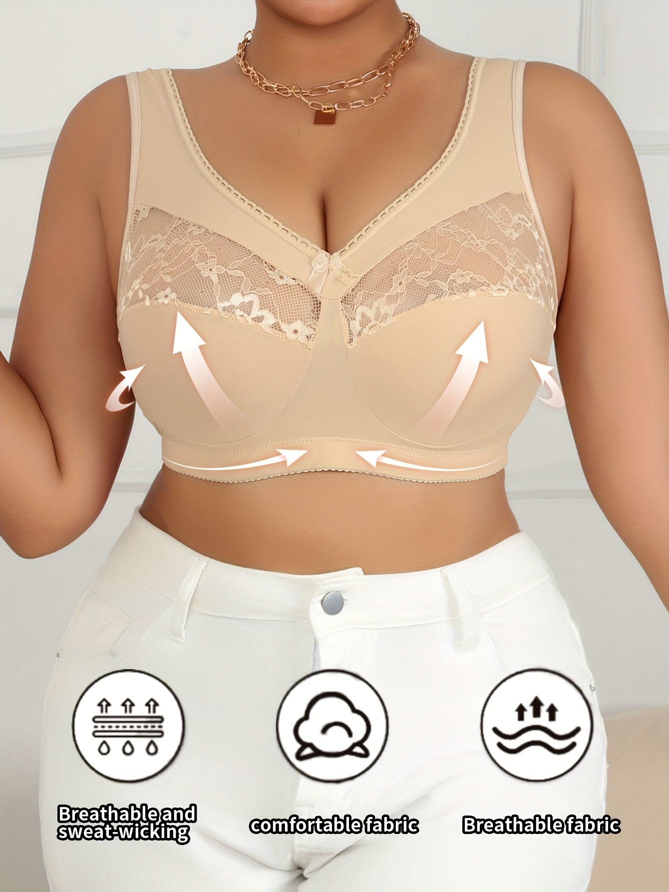 Plus Size Contrast Lace Trim Bra – Breathable Comfortable Stretch Fabric, No Underwire & No Padding, Soft Beige Sexy Casual Attire, Lace Lingerie, Elegant Intimate Apparel, Smooth Texture Finish