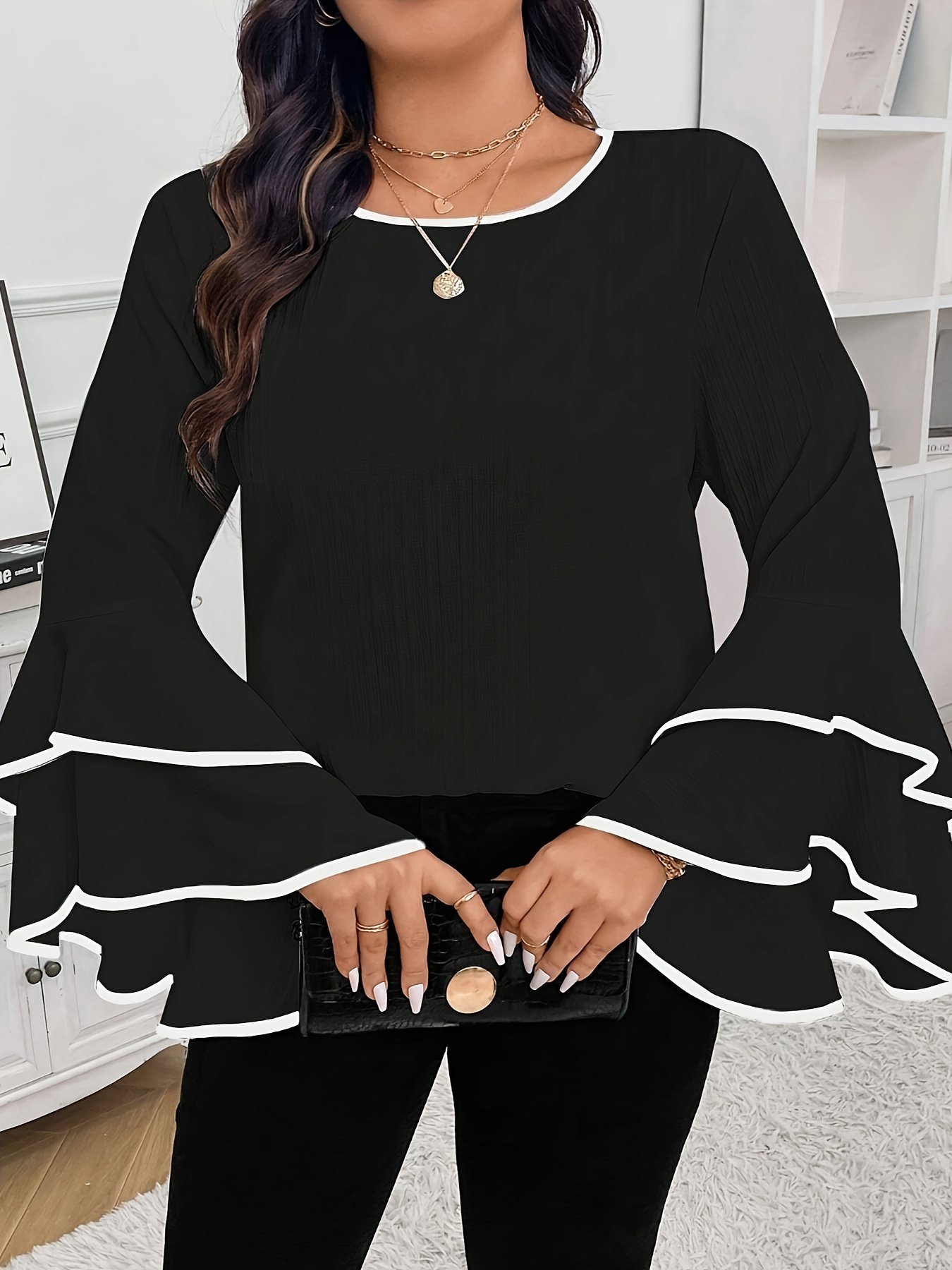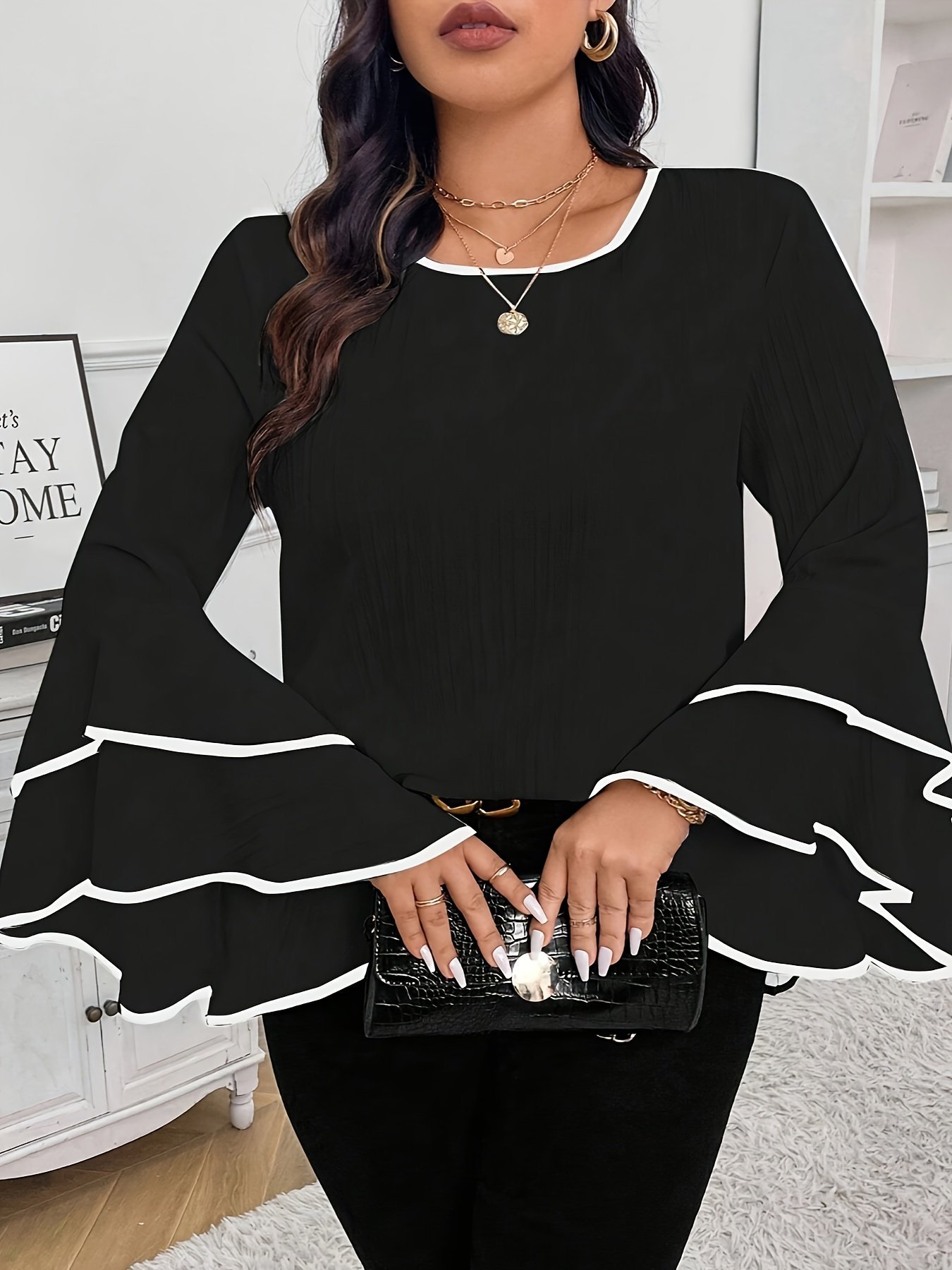 Plus Size Contrast Trim Crew Neck Blouse, Elegant Layered Ruffle Sleeve Top For Spring & Fall, Women’S Plus Size Clothing