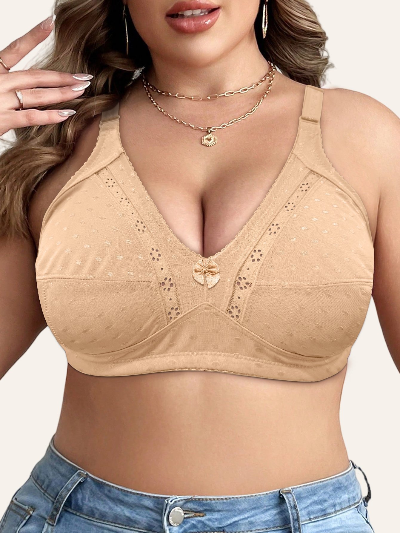 Plus Size Elegant Beige Bra For Women – Breathable Full Coverage, Wireless With Front Bow Detail & Floral Cut-Outs, Soft Nylon Blend, Wide Straps, No Padding, Versatile All-Season Wear, Sizes 1Xl-5Xl, Plus Size Bra