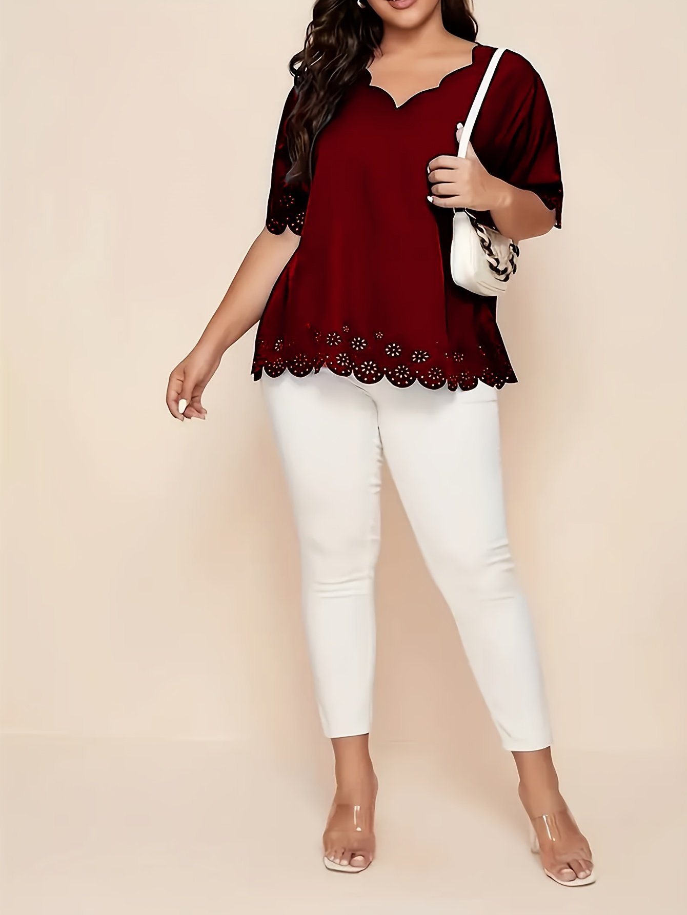 Plus Size Elegant V-Neck Blouse With Short Puff Sleeves – Navy Blue, Lace Embroidery Detail, Non-Stretch Fabric, All-Season Shirt For Women, Casual Attire|Vneck Blouse|Lace Embroidery