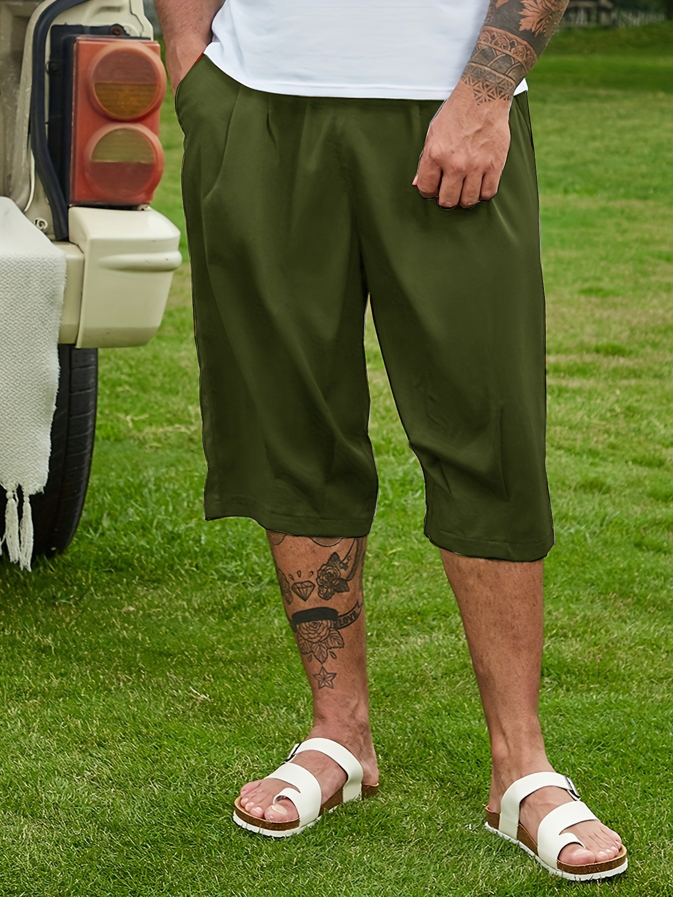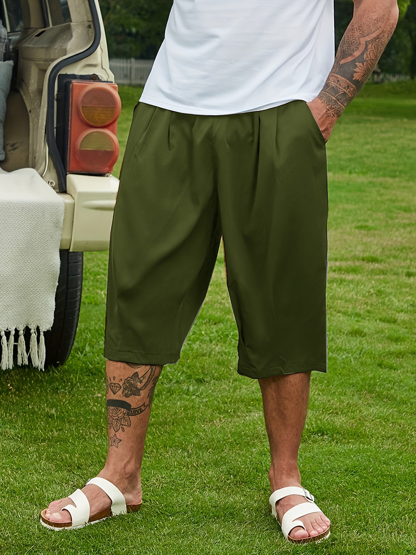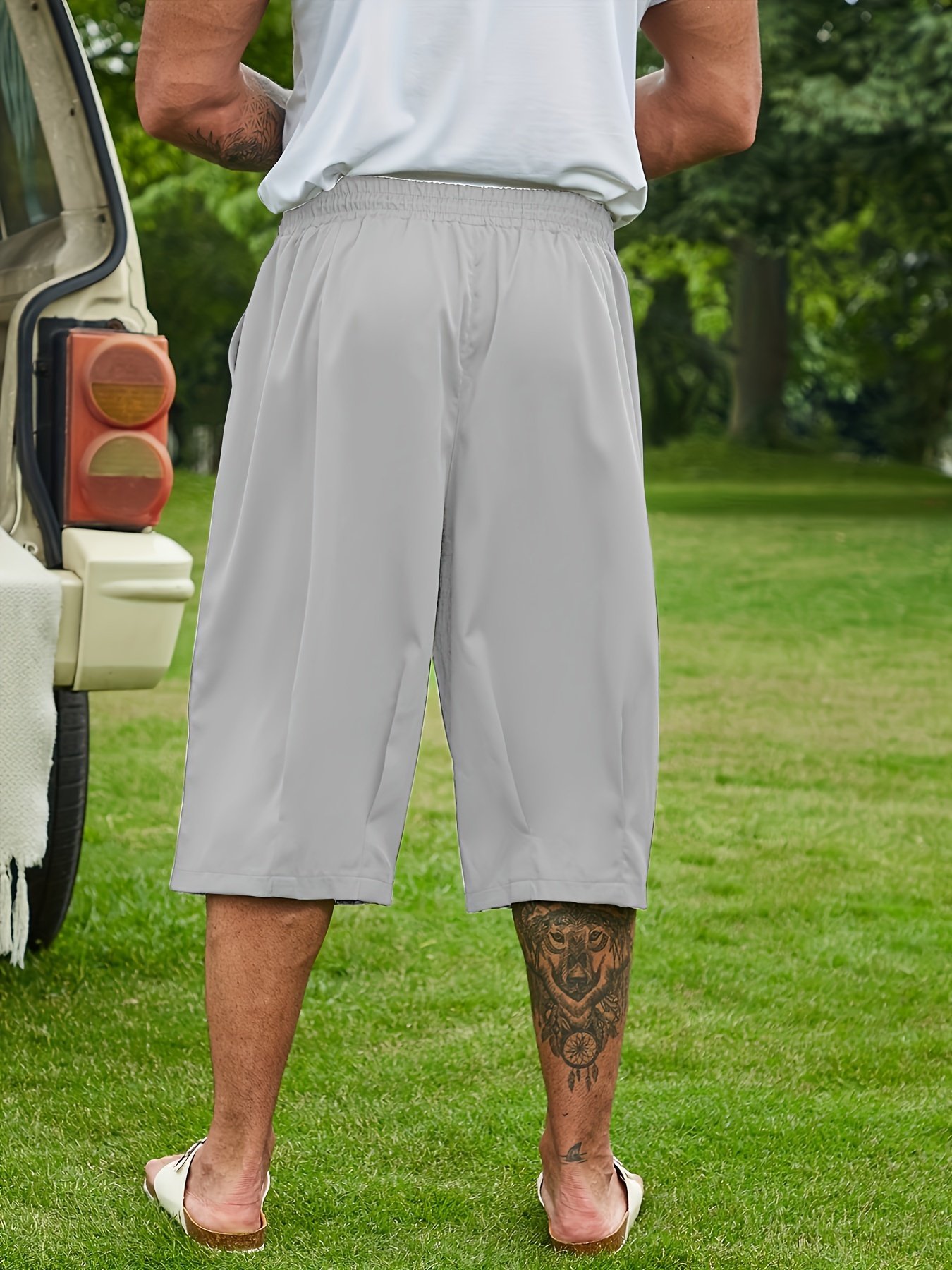 Plus Size Men’S Solid Capri Pants For Summer, Loose Fit Breathable Shorts