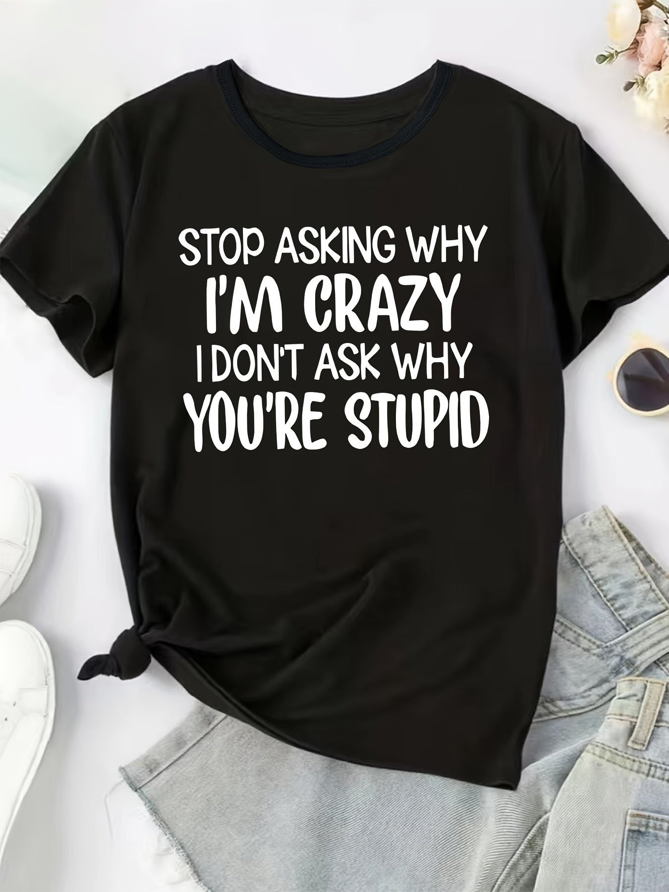 Plus Size – Plus Size Women’S Casual Graphic Tee – “Stop Asking Why I’M Crazy, I Don’T Ask Why You’Re Stupid” Print, Black Short Sleeve Crew Neck, Lightweight Polyester Blend, Spring/Summer Fashion, Casual Summer Wear | Bold Statement Tee | Comfortable Fit