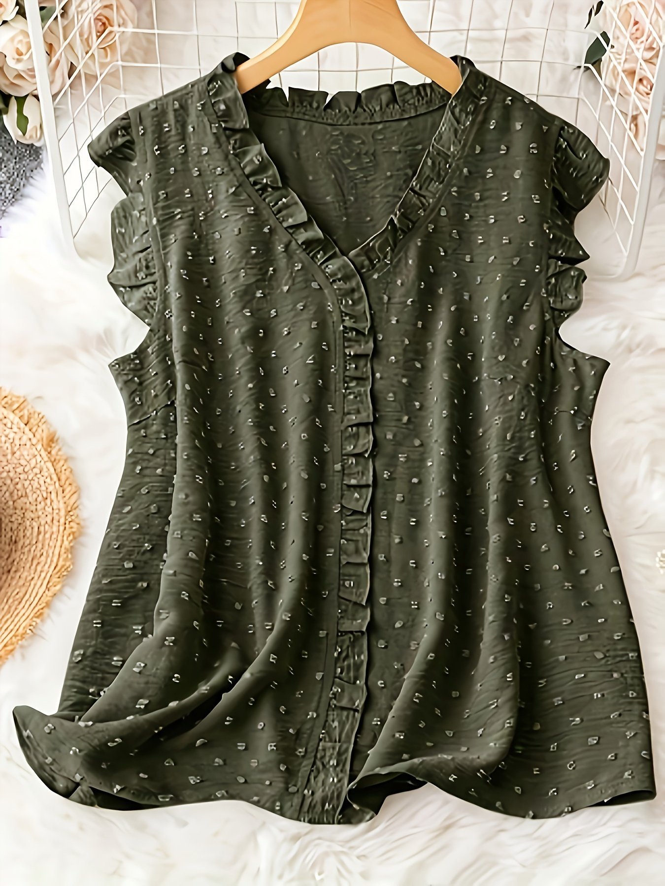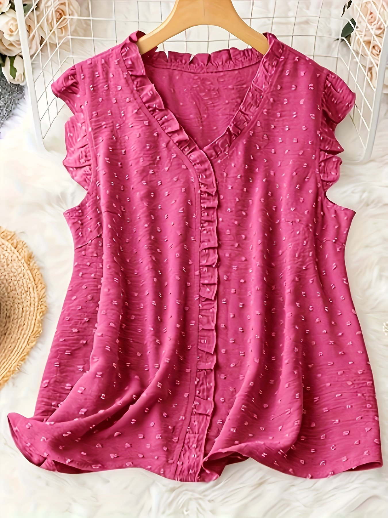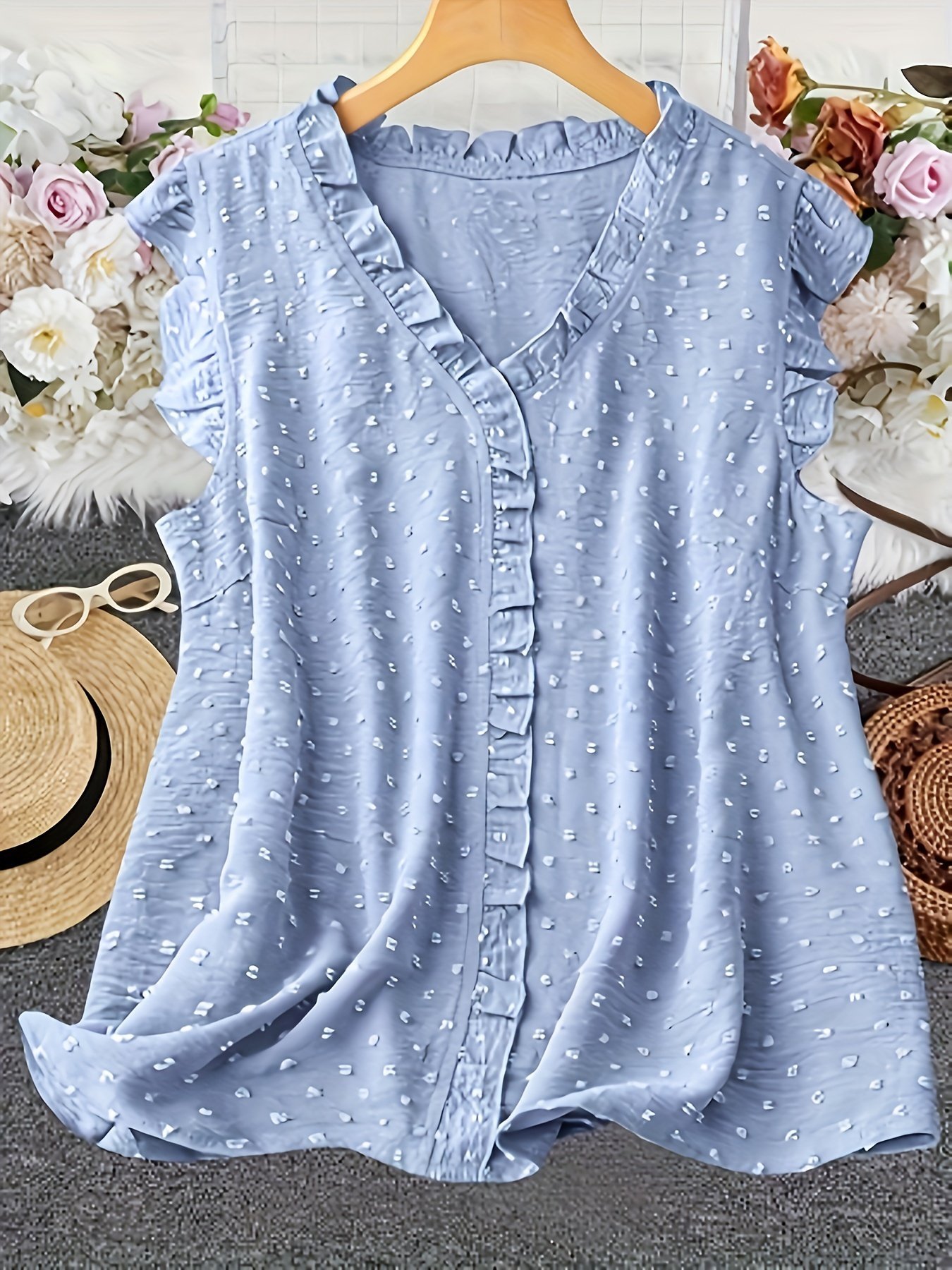 Plus Size Swiss Dot Blouse, Elegant Frill Trim Top For Summer, Women’S Plus Size Clothing