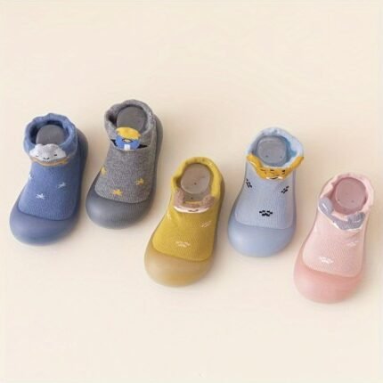 Adorable Cartoon Animal Slip-On Baby Sock Shoes – Cozy, Non-Slip Rubber Sole Walking Shoes For Newborns & Toddlers – Soft Fabric, All-Season Comfort In Blue, Yellow, Pink, & Brown, Toddler Shoes