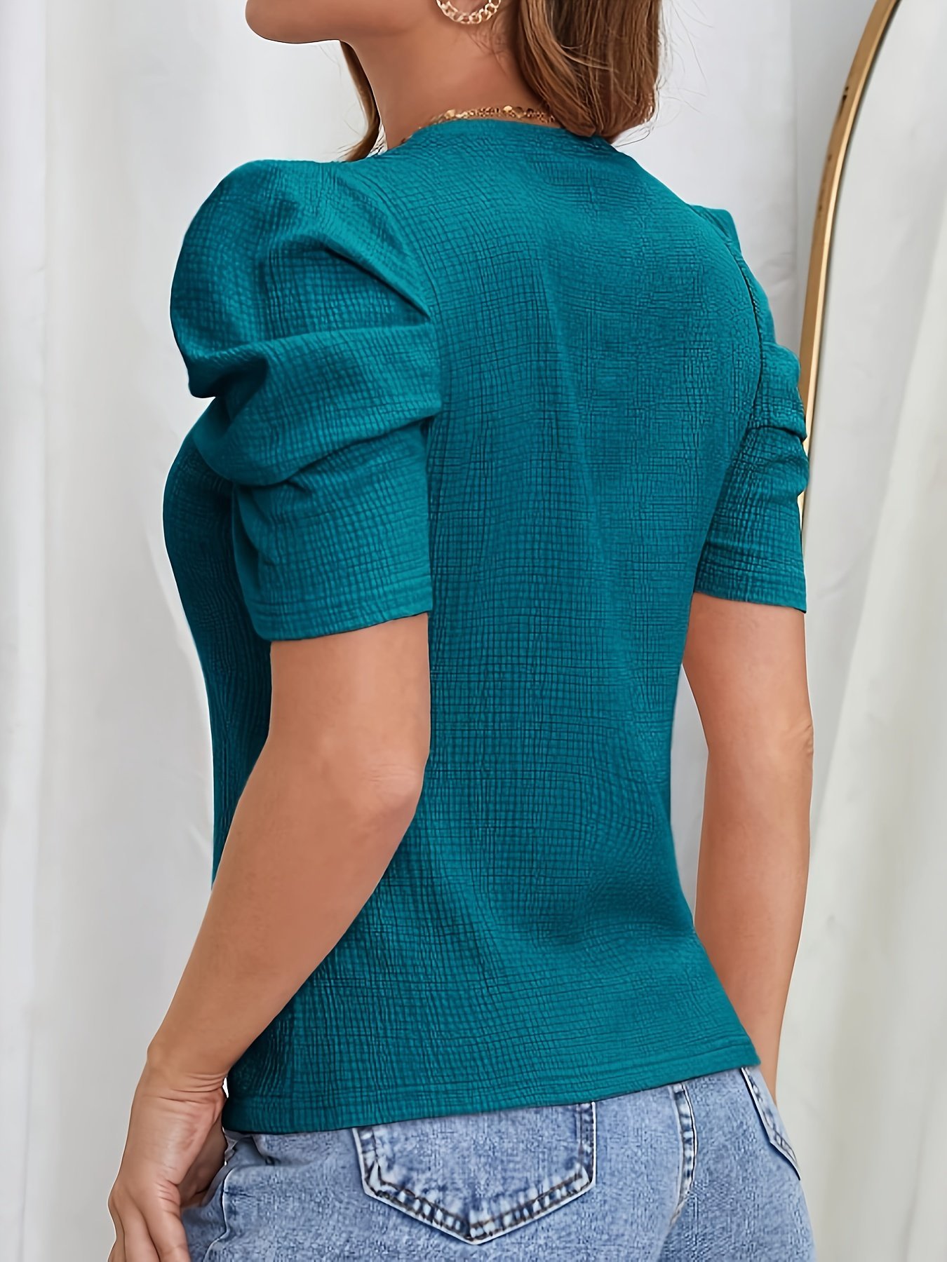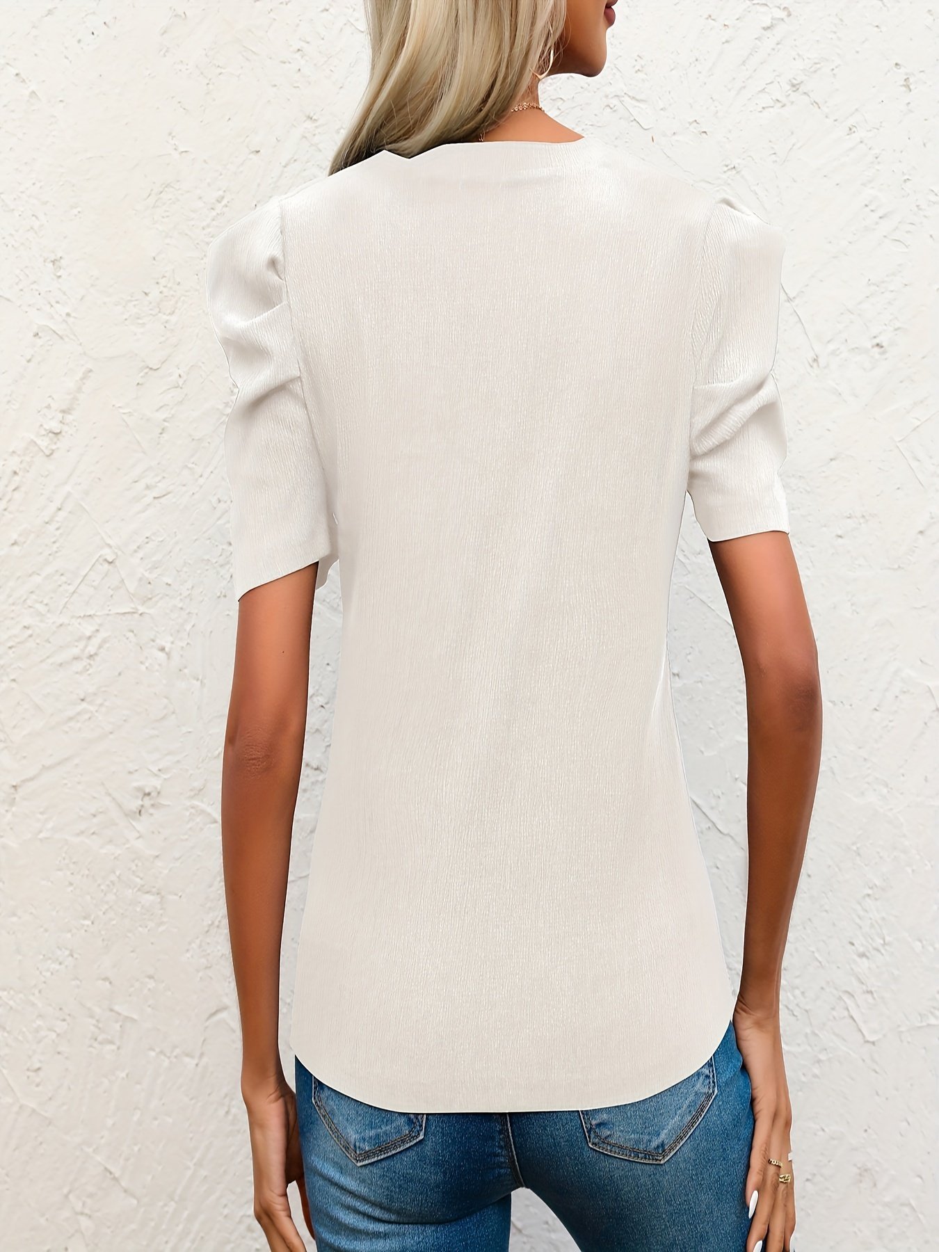 Solid Color Crew Neck T-Shirt, Casual Puff Sleeve Top For Spring & Summer, Women’S Clothing