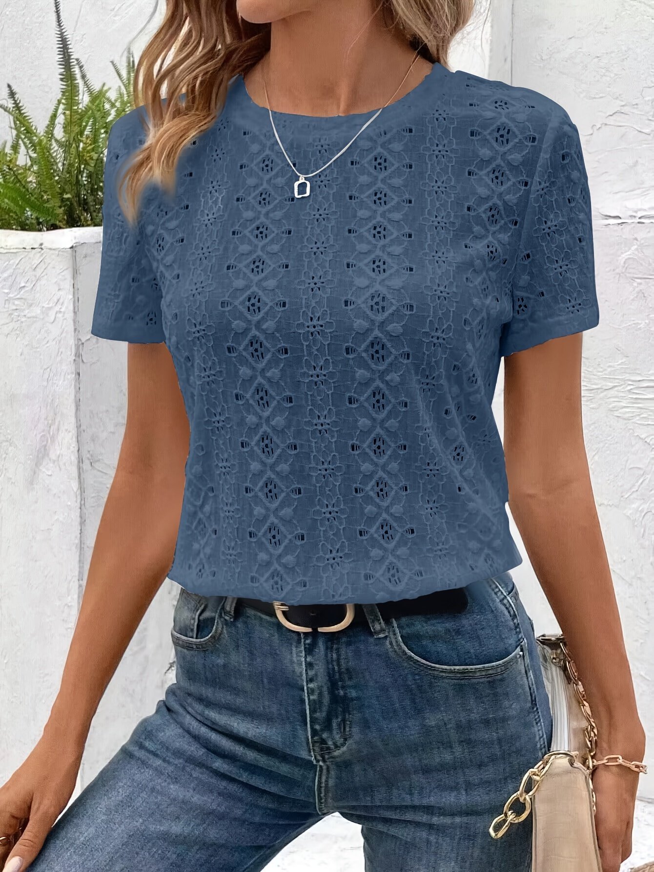 Solid Color Eyelet Embroidered T-Shirt, Elegant Short Sleeve T-Shirt For Spring & Summer, Women’S Clothing