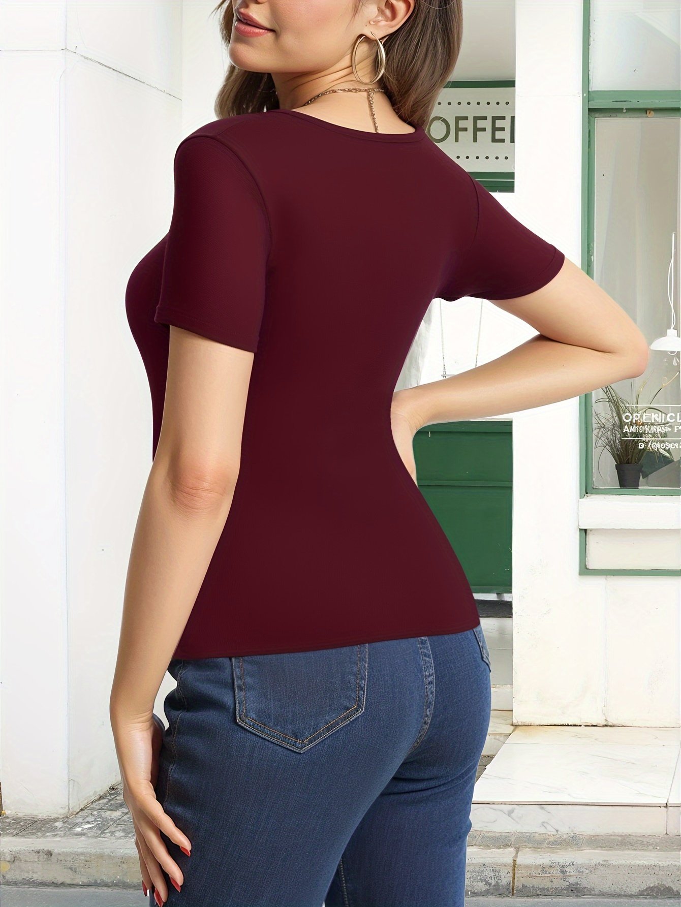 Solid Color V Neck T-Shirt, Versatile Slim Short Sleeve T-Shirt For Spring & Summer, Women’S Clothing