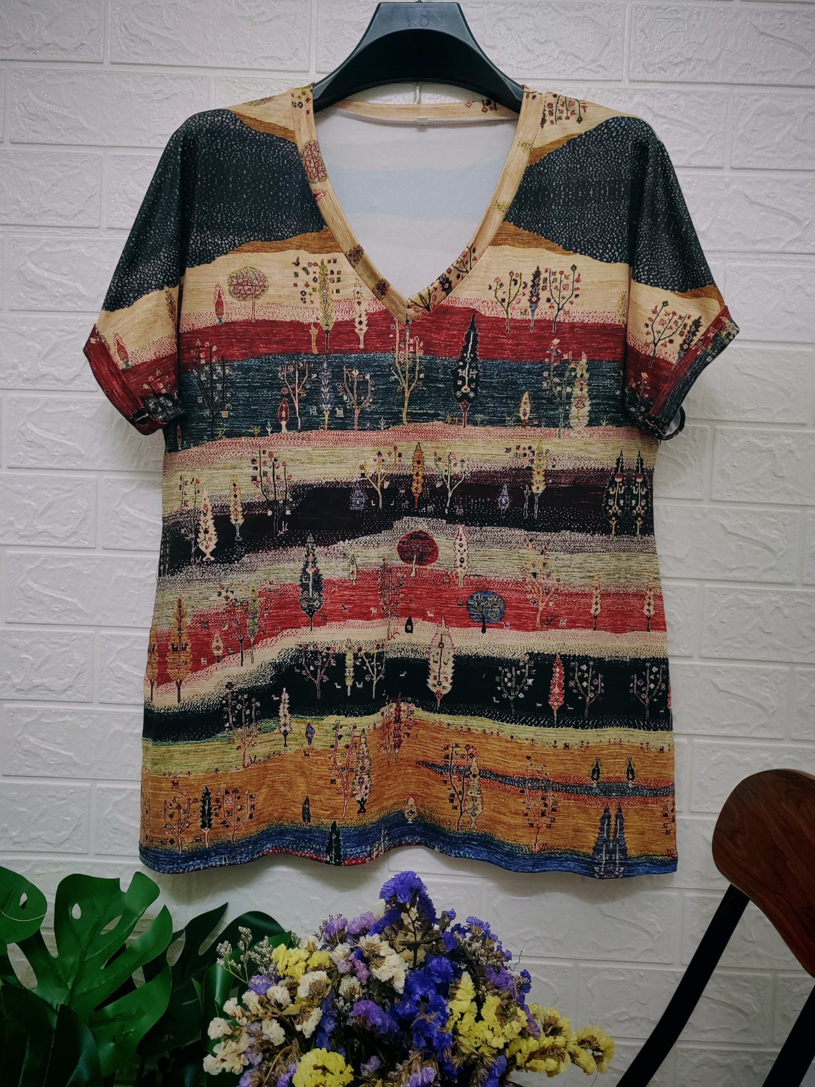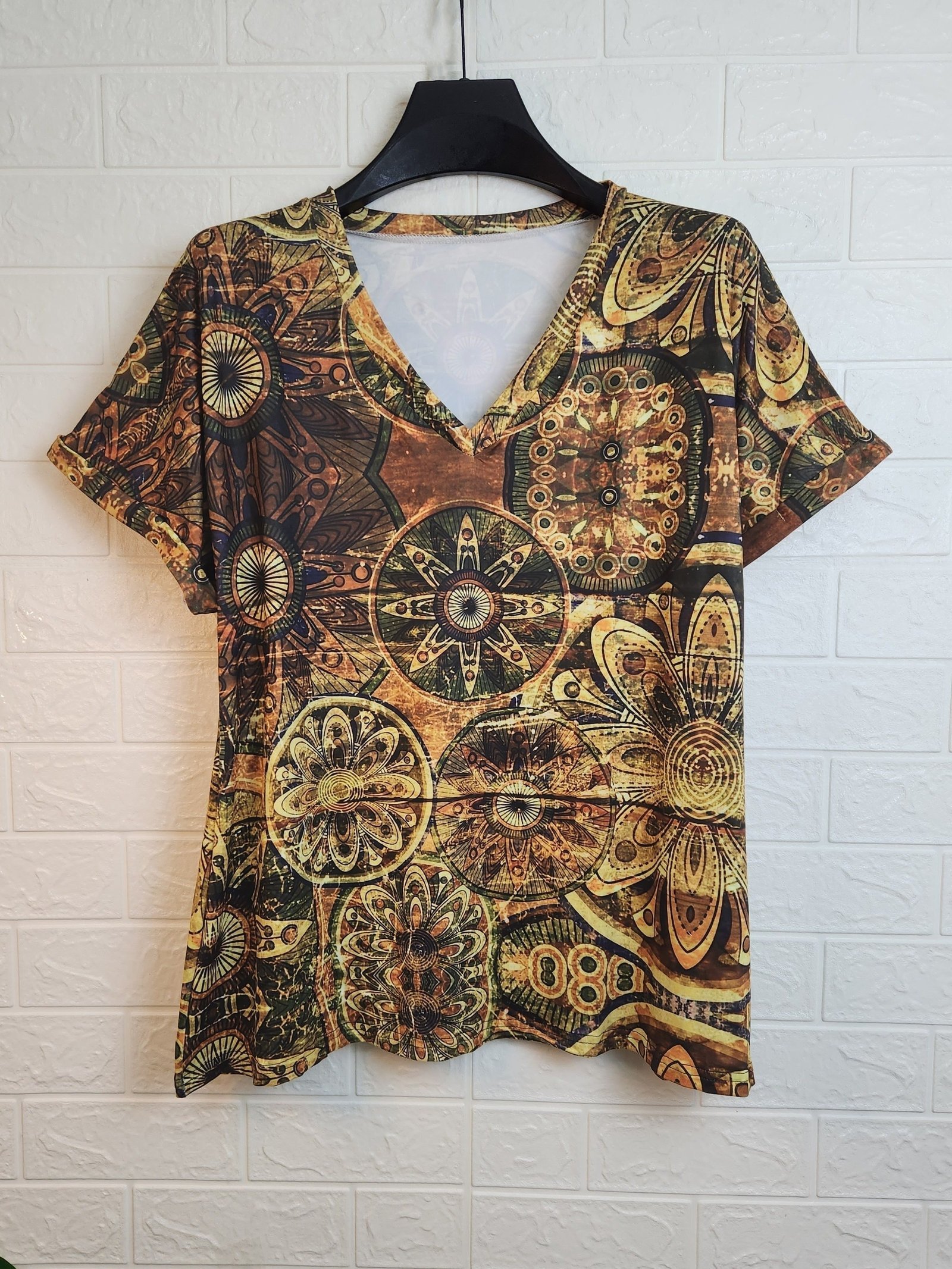 Women’S Bohemian Ethnic Print V-Neck Short Sleeve T-Shirt – Summer Casual Loose Fit Plus Size Top With Vibrant Geometric Patterns, Machine Washable, Cute T Shirts, Stylish Streetwear, Nontransparent Fabric